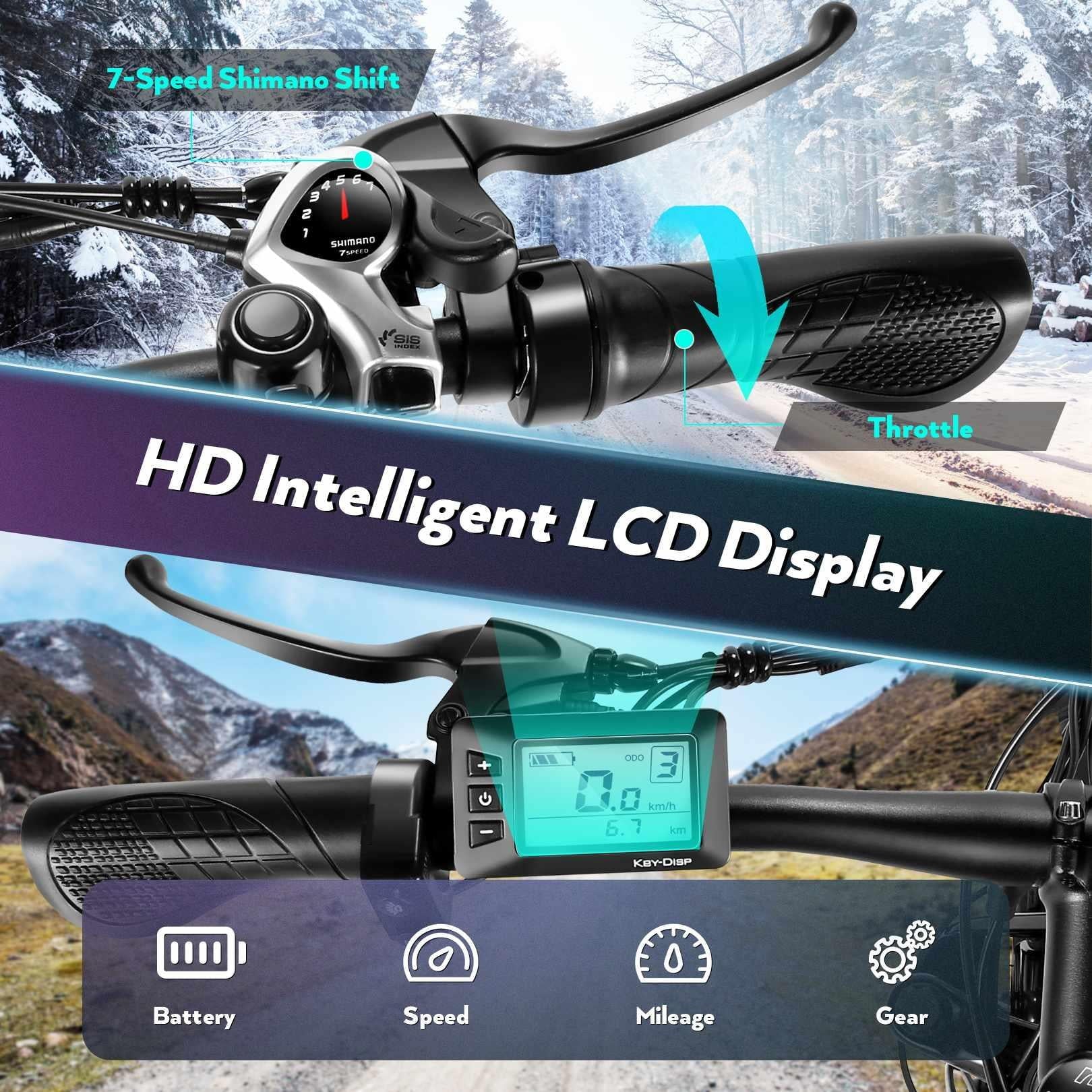 - 🚴Intelligent LCD Display: With upgraded smart chip,you can get the bike status such as speed/battery power/assisted level/mileage at a glance of the intelligent LCD Display,immerse yourself in riding scientifically.