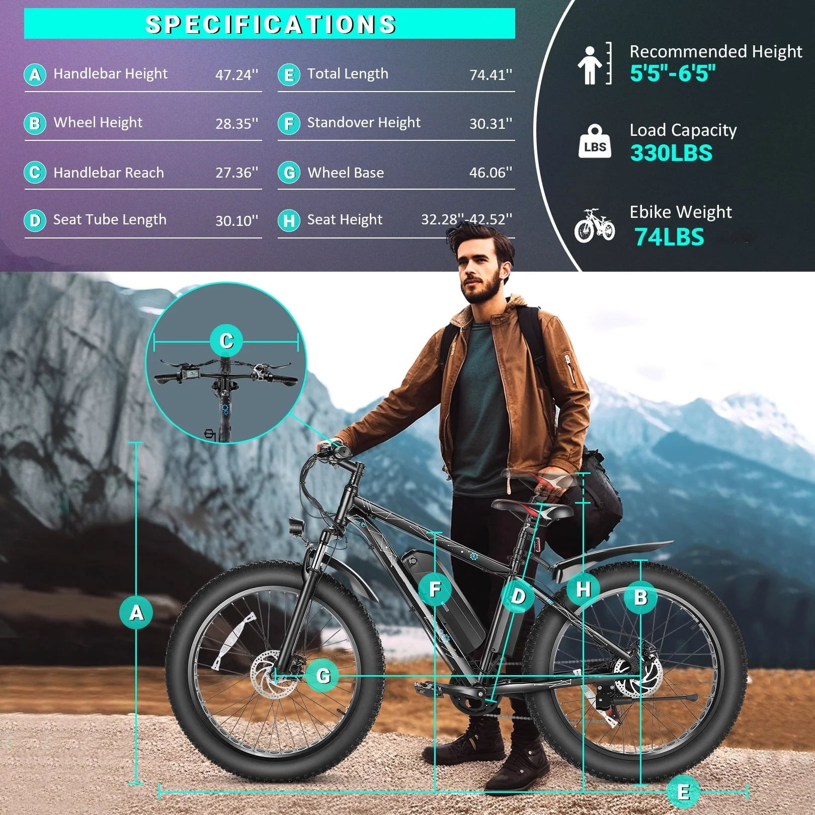 - Ebike Weight: 74lbs