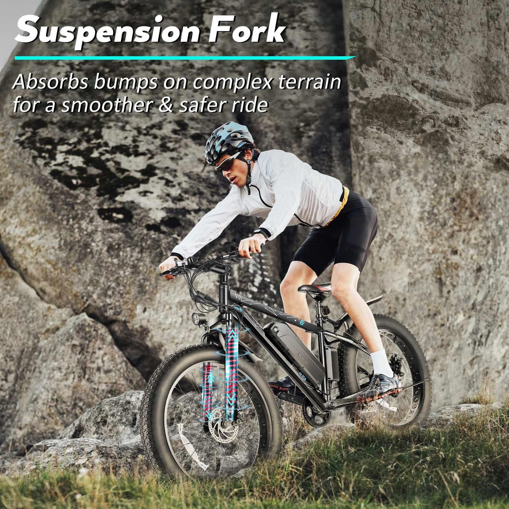 - 🚴4" Anti-Skid Fat Tires & Front Suspension Fork: This electric bike adopts 4inch width anti-skid damping tires,works together with front suspension fork and the dual mechanical disc brakes,enable you conque r any terrain,enjoy the joy of conquering. Aluminum Alloy double-walled rims are for greater durability as well as faster ride with less drag.