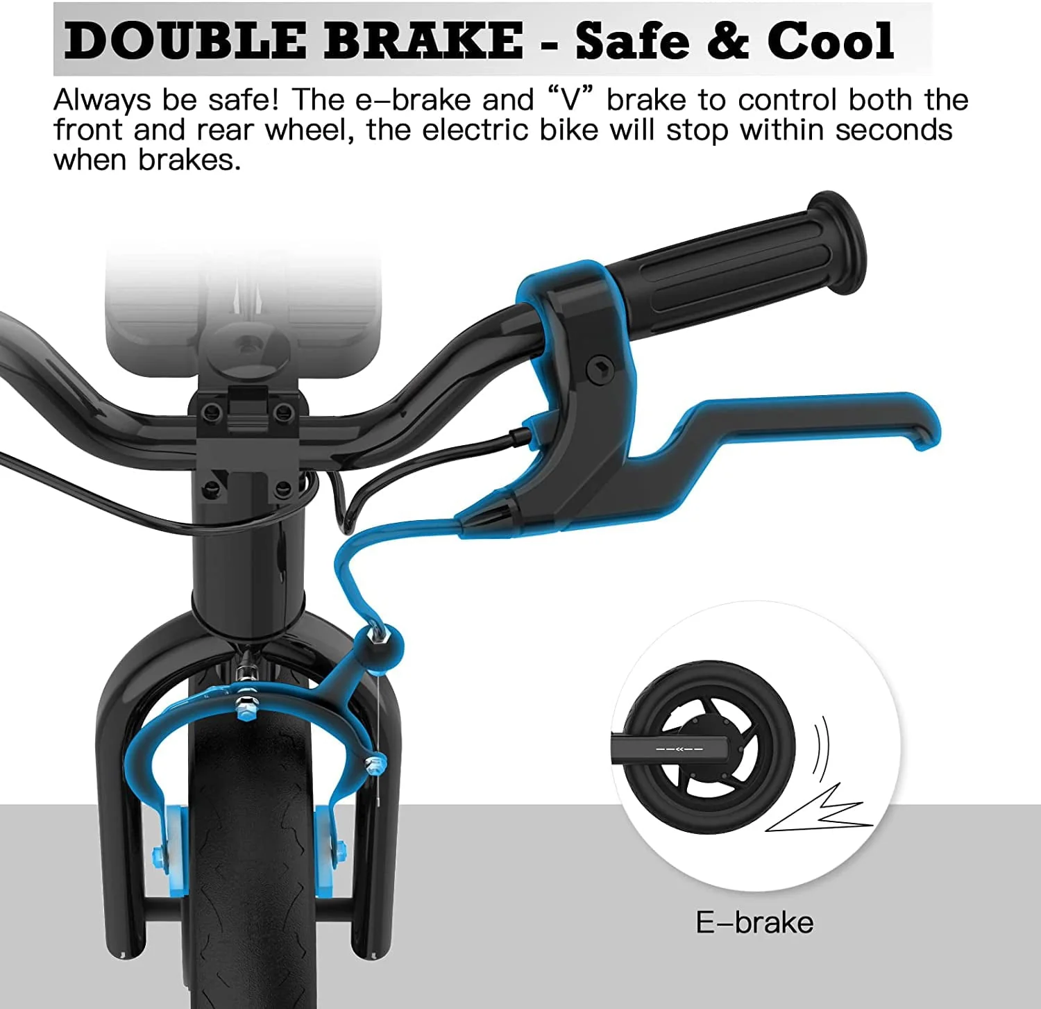 E-brake to control the rear motor wheel and brake level to control the front wheel, the bike will stop in second when kids press the brake.