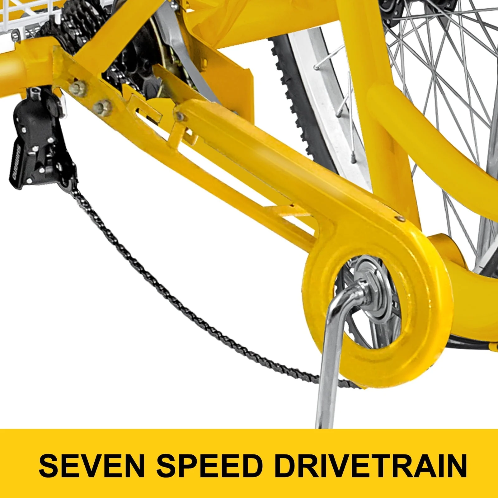 The tricycle bike for adults is equipped with reflective lights, warning bells, ergonomically designed handles, and easier steps, making it more suitable for driving on the road.
