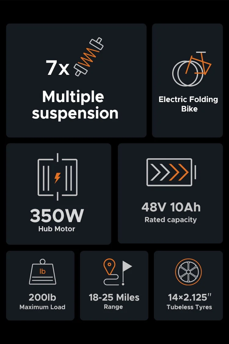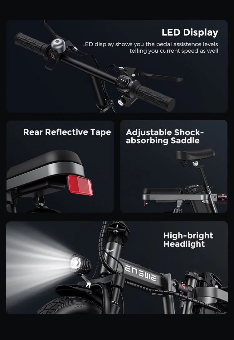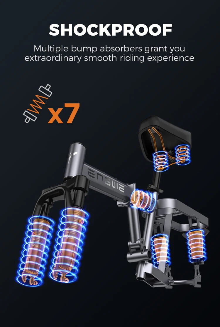 Comfortable Riding: Front fork, center, saddle, rear wheel, quadruple shock absorber, allowing you to pass through various roads comfortably; Ergonomically designed saddle, comfortable to sit for a long time, making it easy for you to ride
