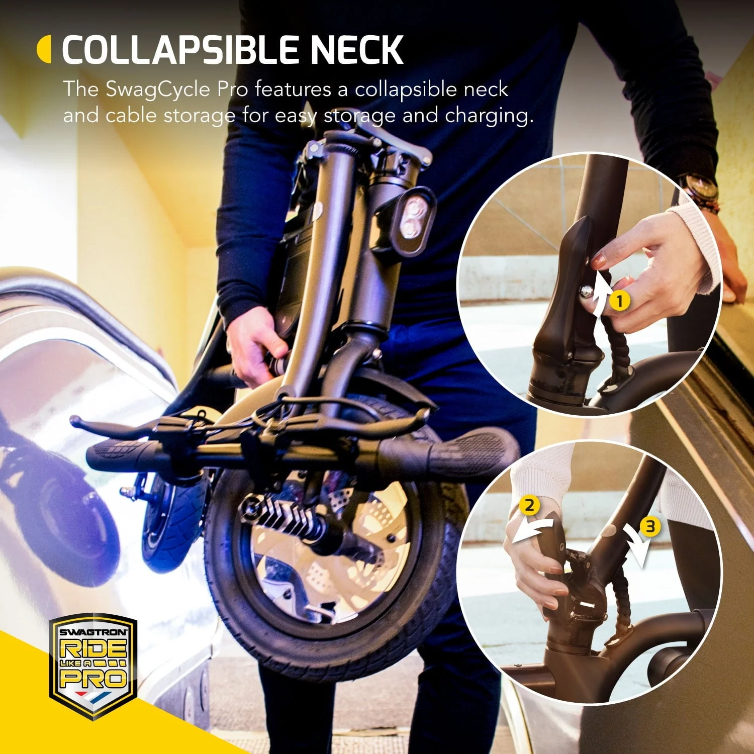 Featuring a foldable frame reinforced with durable metal, the Swag cycle Pro can support up to 264 lbs and withstand water splashes with an IP54 rating, making this e-rider the ultimate joyride for all rough riders. Take the e-rider out for a spin through rain or shine and enjoy days of extraordinarily smooth rides with 12" front and 10" rear air-filled tires. Not only is this new hotrod a powerhouse on wheels, but the Swag cycle Pro is completely zero-emission and pedal-free. A power source provides all the power you need for a thrill ride like never before. Whether you are racing to work, catching an early train, or exploring new corners of a city, this motorized bicycle will get you there without breaking a sweat. Simply sit back, rest your feet on the e bike's built-in foot pegs, and let the Swag cycle Pro do all the work. A juice indicator is situated atop the handlebars to keep you alert on how much juice is left to last another round of exhilarating fun. With the app, you can track your speed, record your time, discover new paths, and even adjust your preferred unit of measure! Phone running low on juice - Instead of rushing to the nearest outlet, refill your phone directly from your e-rider. A USB port is built into your bike's juice to keep you refilled and connected throughout your adventures. Additionally, a hidden cable compartment alongside the juice wall helps make refilling your e-rider a breeze by keeping your cords neatly in place until it's time to the plugin Optimize your travels with the Swag cycle and ride like a Pro.