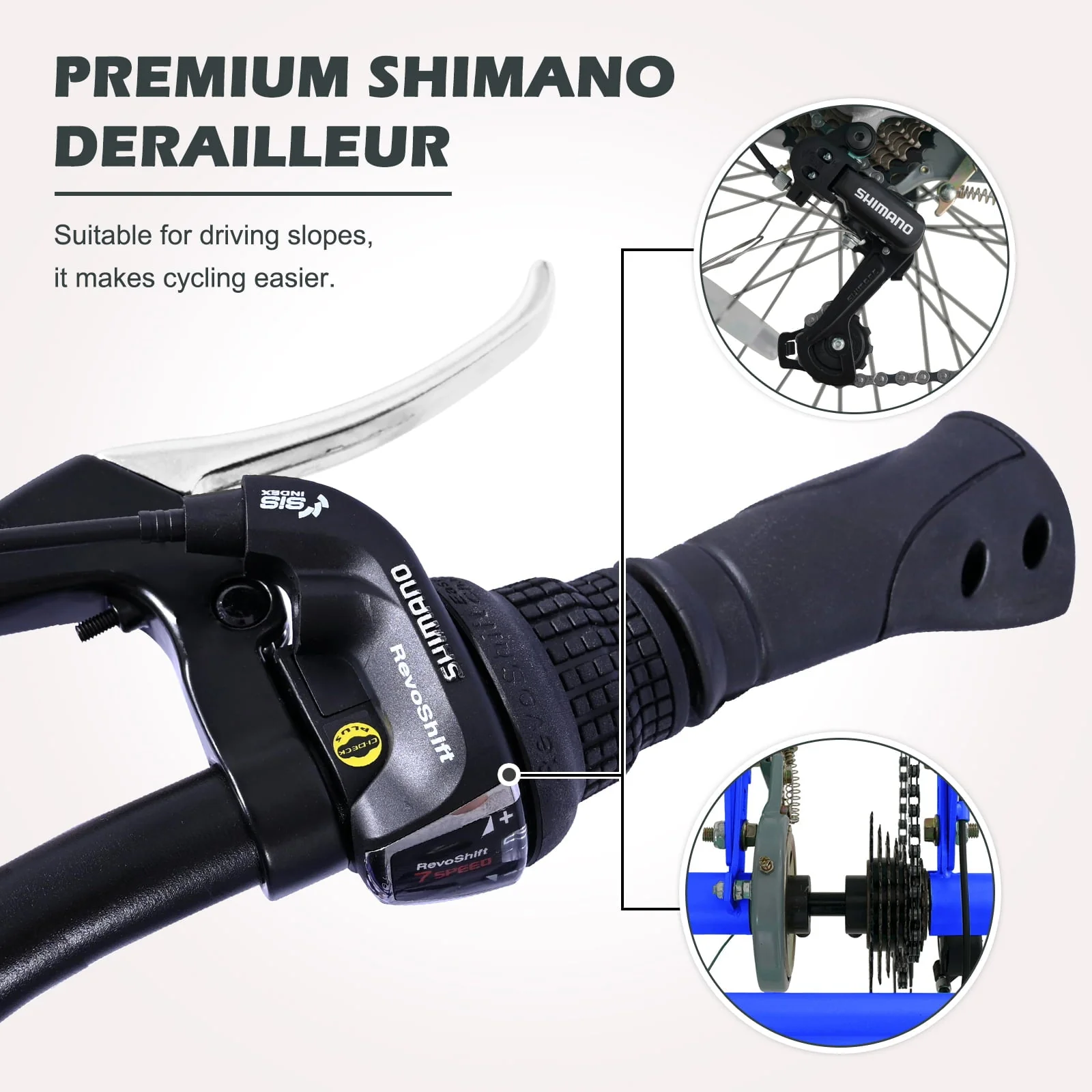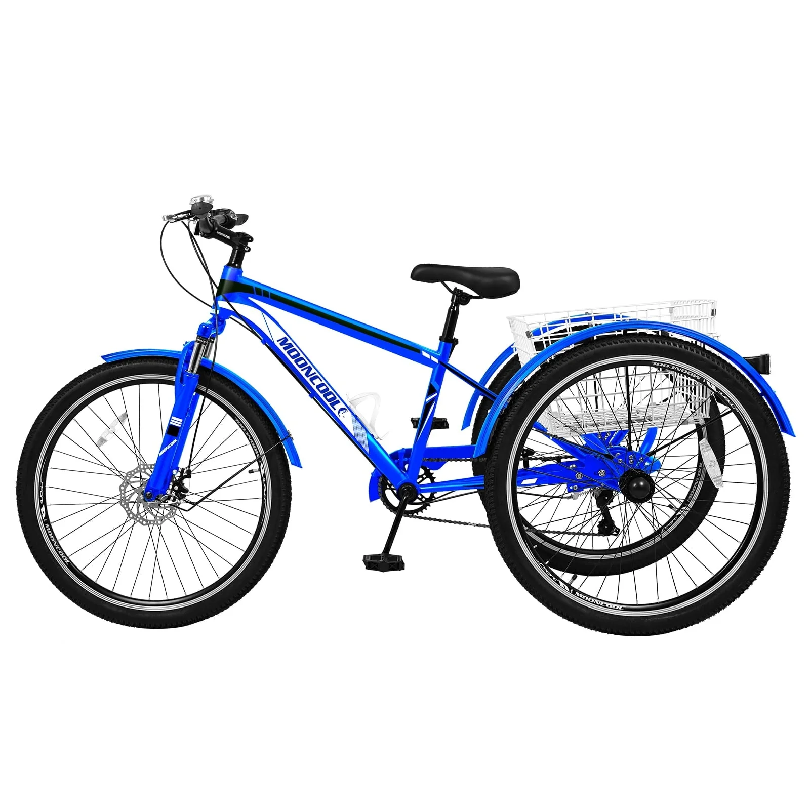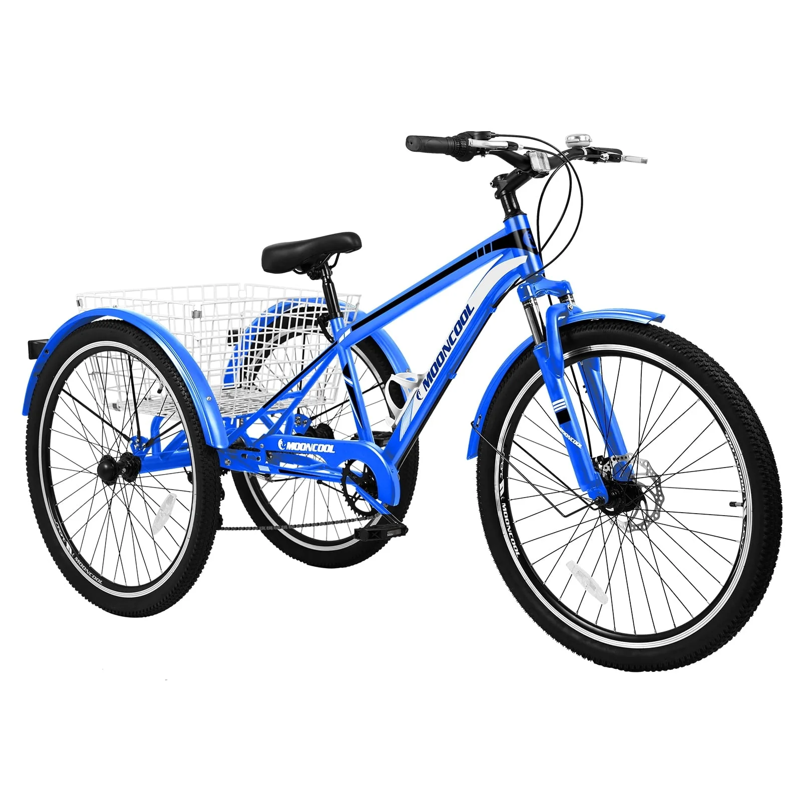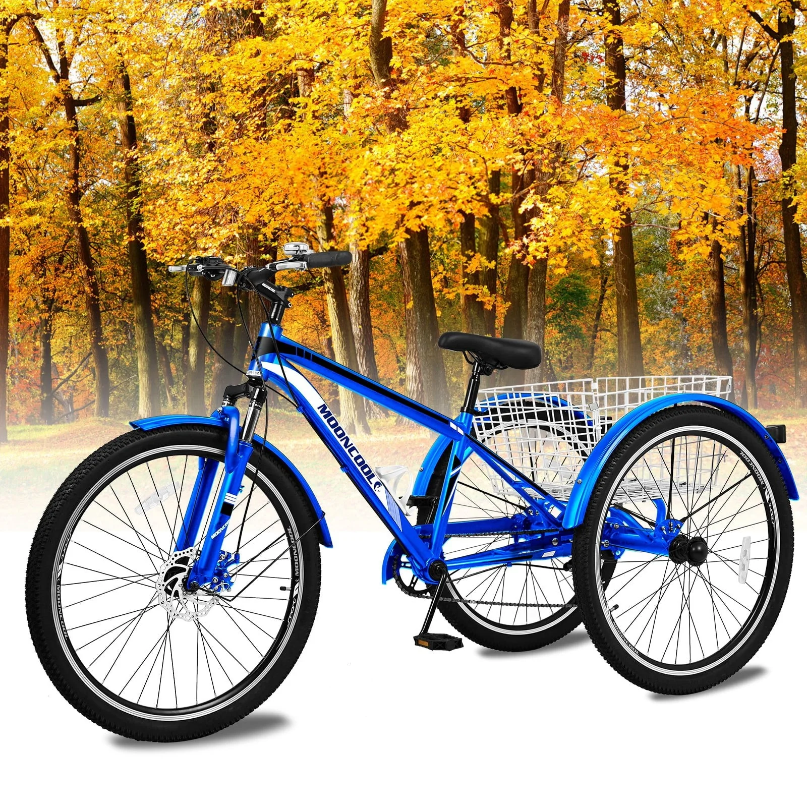 MOPHOTO Tricycles are rather attractive for senior adults for their apparent stability versus a bicycle and ability to move smoothly and safely. Our mountain tricycle is made with good quality hi-ten steel TIG welded frame. The mountain frame, the mountain tires, and the mountain rims create better stability and comfort for a wider range of people. Large soft saddle equipped for better riding experience. 7-speed Shimano derailleur offers more fun in riding.Equipped with a Practical extra large basket and a Weight capacity of 420 lbs, it will certainly meet your needs for a lot of luggage.