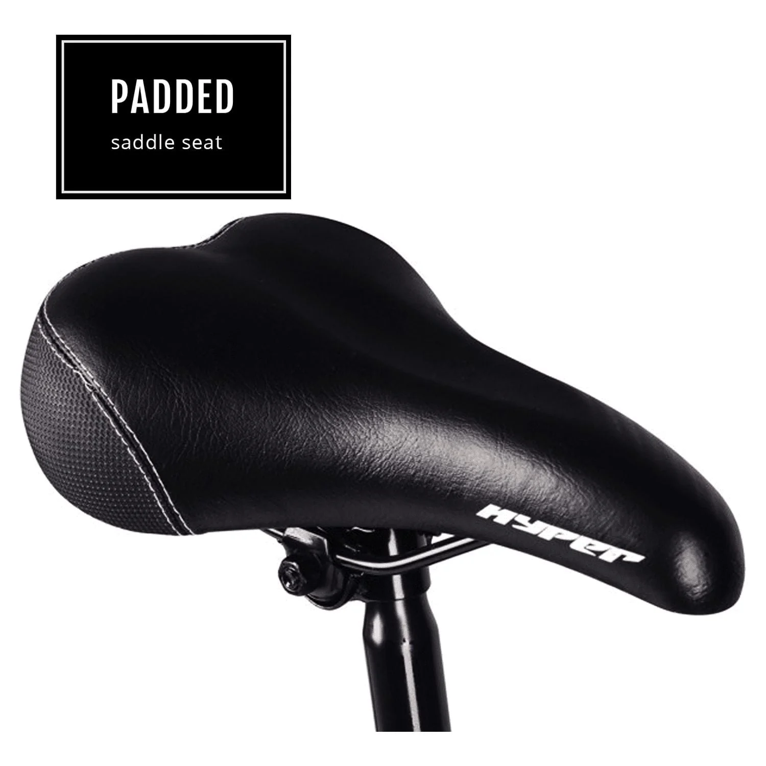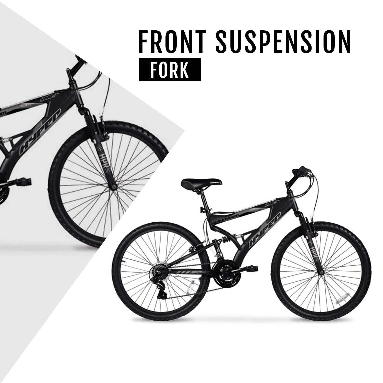 This Hyper Havoc Men's Mountain Bike for adults is the key to outdoor fun. It has a lightweight aluminum frame that lets users ride harder for longer, providing a reliable experience. The 26" Hyper Havoc is designed with a front and rear suspension to offer a smooth ride on any surface. It features 21 speeds, ensuring versatility in the ride. This mountain bike has a comfortable twist shifter and a rear derailleur, allowing riders to change the gears quickly and smoothly. It also features a three-piece, high-performance crank. This bike is made with standard pedals for a comfortable and secure ride. It has grips on the handlebars for sustained comfort and control. Additionally, the bike comes equipped with a plush MTB seat, so the backsides will stay comfortable on long rides. It has a sleek, black design that provides a modern look. The bike can be ridden on a variety of surfaces, allowing for flexibility in where you go with it.
