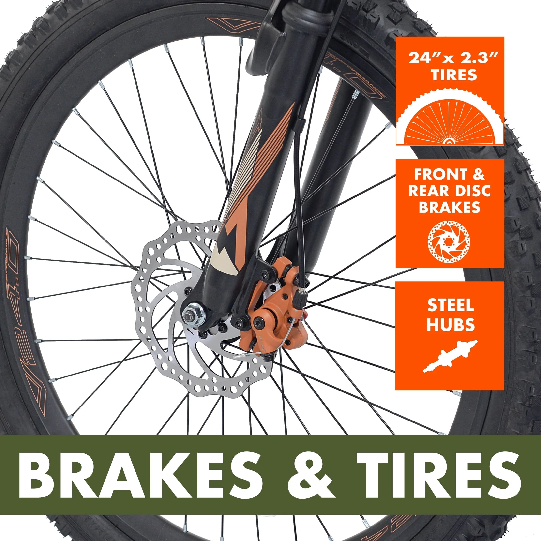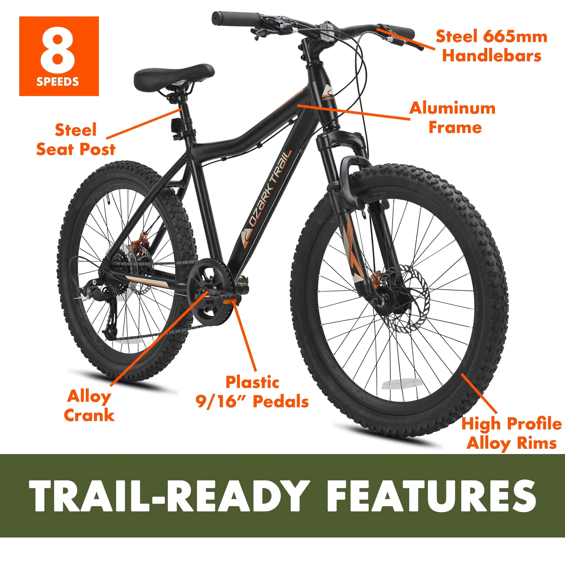 The 24" Ozark Trail Glide mountain bike hits the sweet spot with its capability, versatility, and affordability. Sporting a lightweight aluminum frame with a specially tapered headtube, this mountain bike is designed specifically for your teen's trail-riding needs. The dual mechanical disc brakes give substantial stopping power during normal trail riding and deep descents. Knobby MTB tires and a front suspension fork let your child tackle tougher terrain with ease. Quickly and smoothly transition through the 8 gears with the handlebar-mounted trigger shifters as you tear up the trail. Adjustability is key for a proper fit, so this bike offers an adjustable saddle height for growing riders. If you're looking for a capable mountain bike for your teen to help them keep up, the unisex 24" Ozark Trail Glide has you covered.