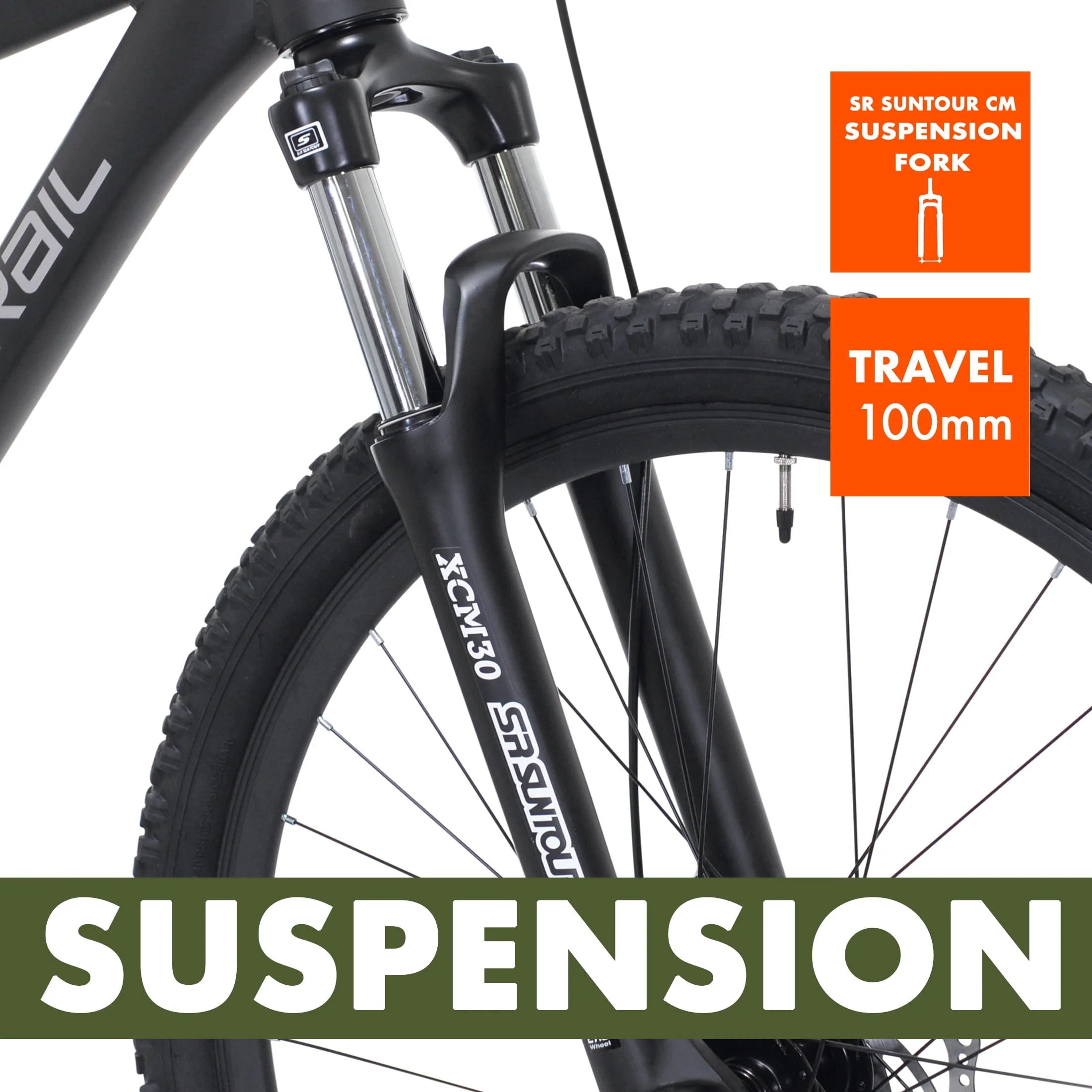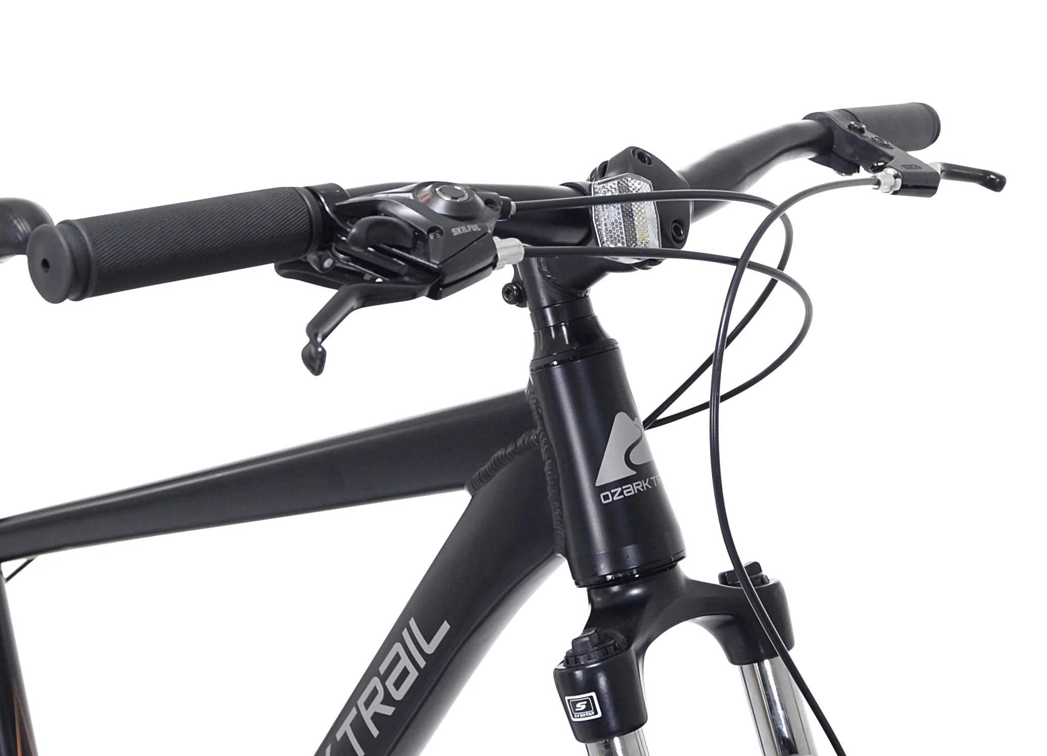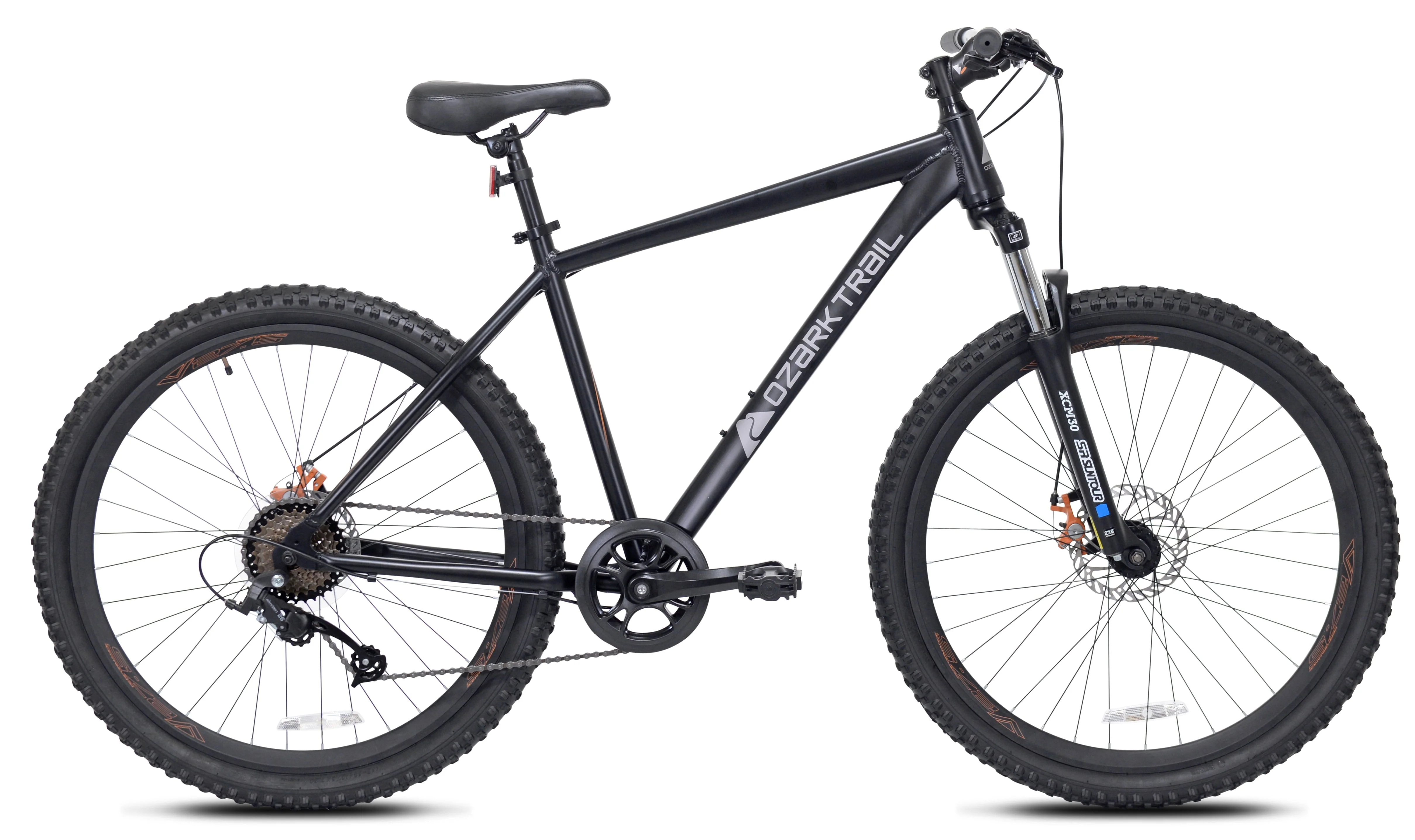 The 27.5" Ozark Trail Vibe mountain bike hits the sweet spot with its capability, versatility, and affordability. Sporting a lightweight aluminum frame with a specially tapered headtube, this mountain bike is designed specifically for your trail-riding needs. The dual mechanical disc brakes give substantial stopping power during normal trail riding and deep descents. Knobby MTB tires and a front suspension fork let you tackle tougher terrain with ease. Quickly and smoothly transition through the 8 gears with the handlebar-mounted trigger shifters as you tear up the trail. Adjustability is key for a proper fit, so this unisex adult bike offers 3 distinct frame sizes all with adjustable saddle heights.