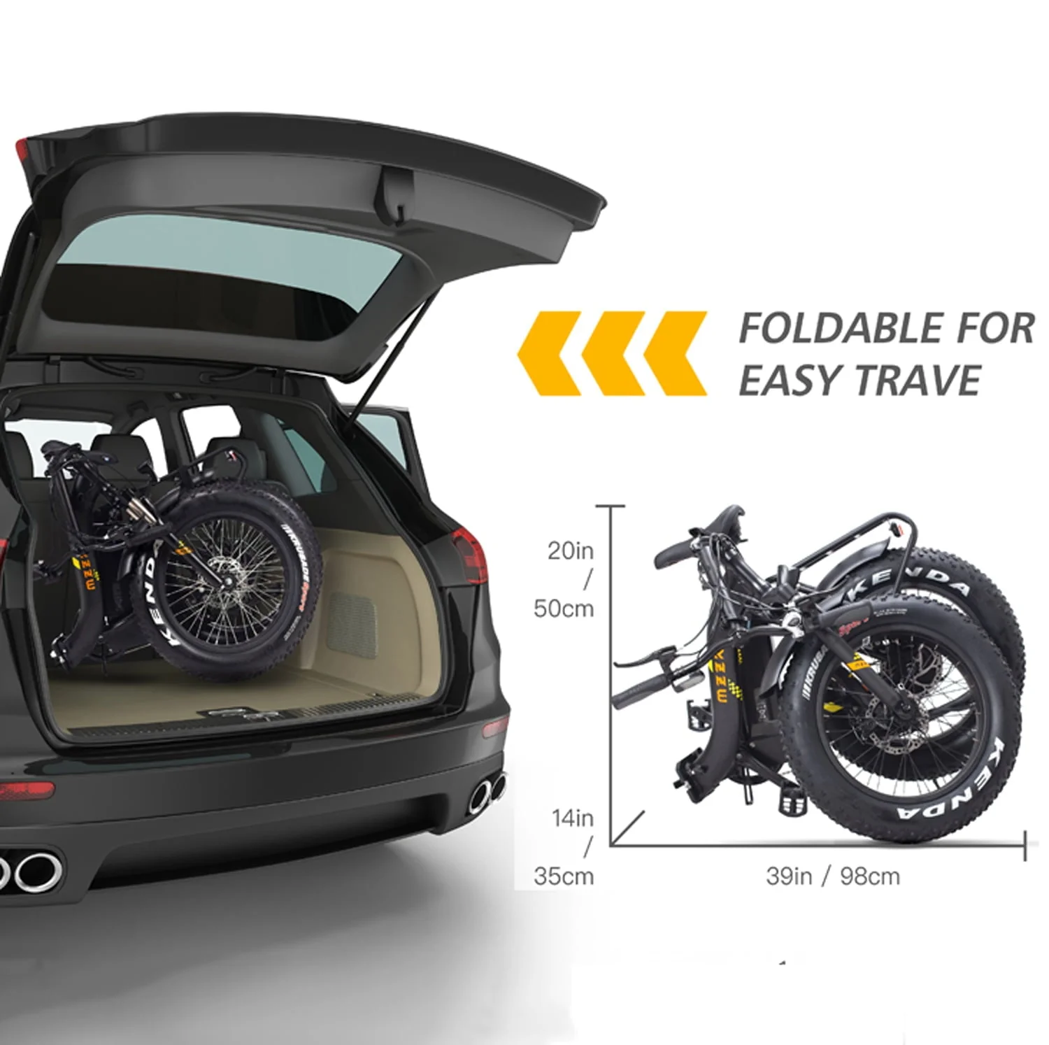 You do not like to limit your rides to one kind of terrain. You're looking to expand your horizons with an e-bike so you can ride farther and faster and explore more of the world around ! This Electric Bike is equipped with Shock Absorption System and Extra Fat Tires, allowing you to travel freely on any road, like mountain land, snow, sand, rough trails, the urban jungle, Muddy woodland and anything else you can think of, to enjoy the fun of riding. The 20 inch e-bike adopts aluminum alloy collapsible frame for quick folding and easy storage. It can be stashed in the trunk of your car, it's the Perfect choice for camping, fishing or hunting.