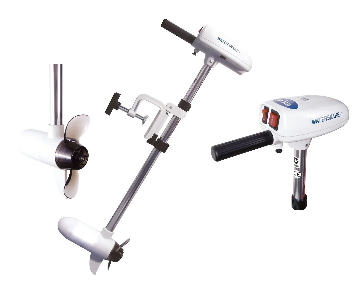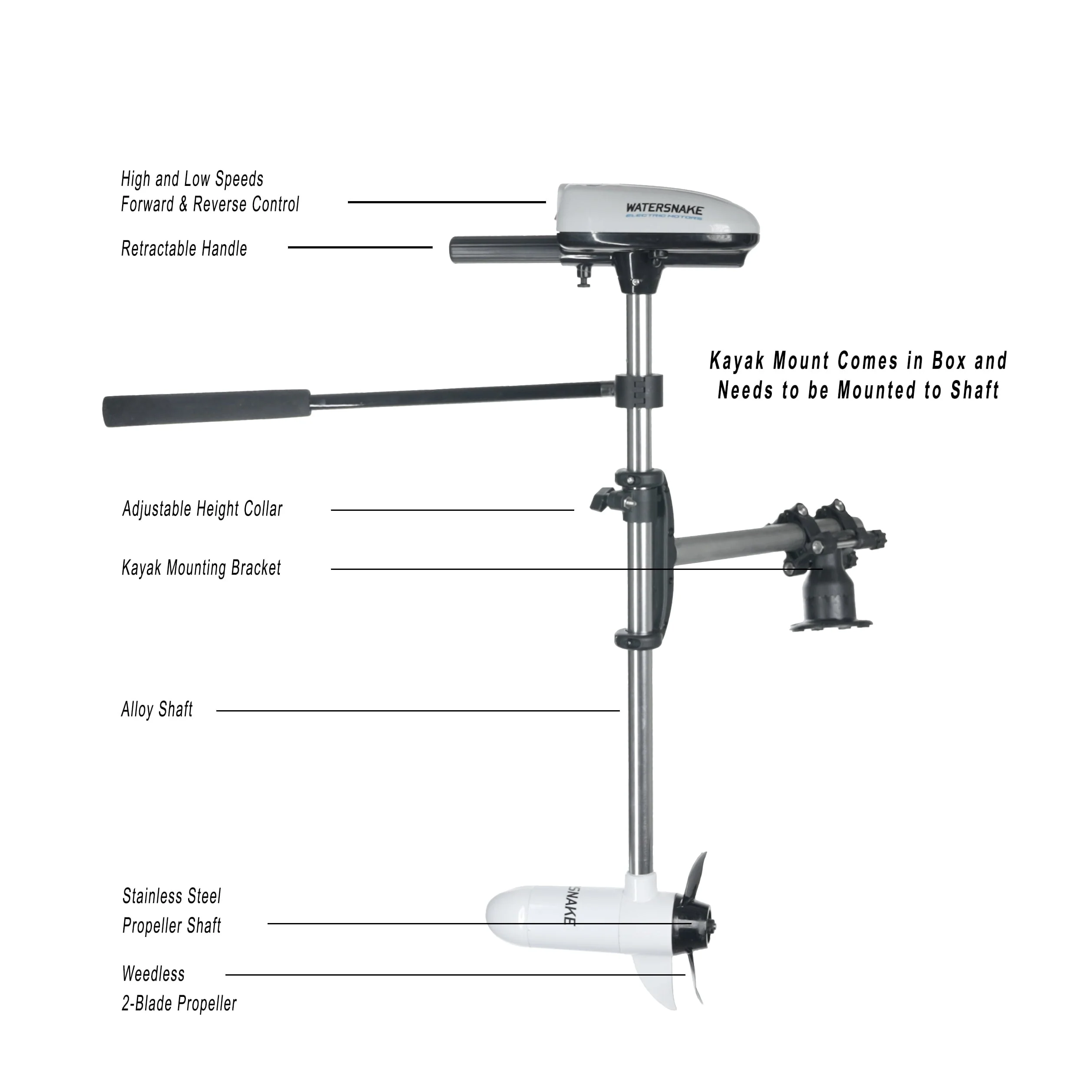 Watersnake ASP T18 Saltwater Electric 12 volt trolling Motor with Kayak Bracket is the ultimate in lightweight portability weighing only 4.85lbs (2.2kg). It’s the ideal trolling motor to use on kayaks. Watersnake’s simple design keeps the weight down while delivering quality and performance. This 18lb. thrust force motor comes with an easy to install kayak mounting bracket to keep it close at hand on your kayak. Comes equipped with a high and low speed control, forward and reverse switch and a two blade mini weedless propeller. 18lb. thrust electric motor with bracket included. Battery not included. Thrust is used instead of horse power on electric motors. Portable freshwater motor./