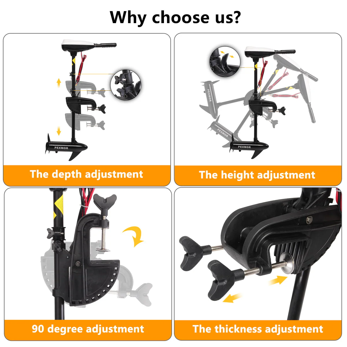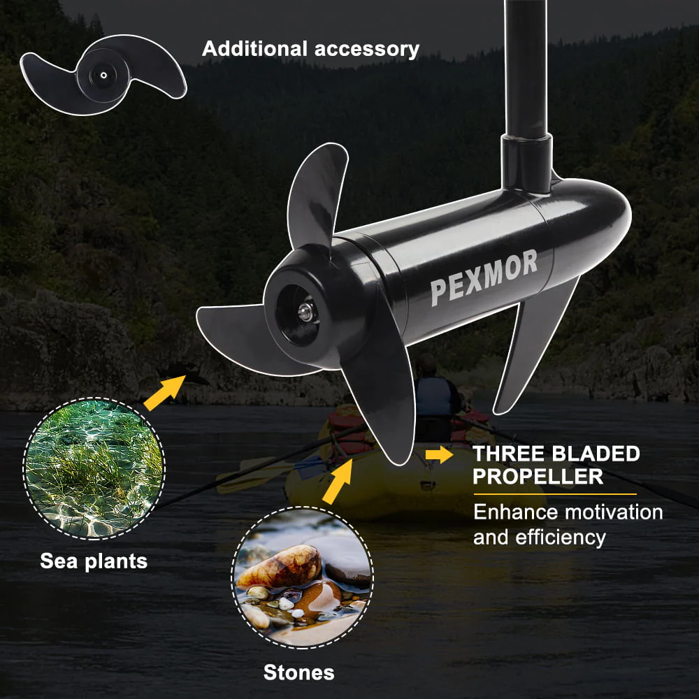 【UNIQUE DESIGN】- PEXMOR Electric Trolling Motor is equiped with three bladed propeller, which can enhance motivation and effiency. Three sharp blades make it easy to get rid of seaweed. In addition, we have an additional two and three bladed propeller in the 36/45 and 55/86 thrusters respectively