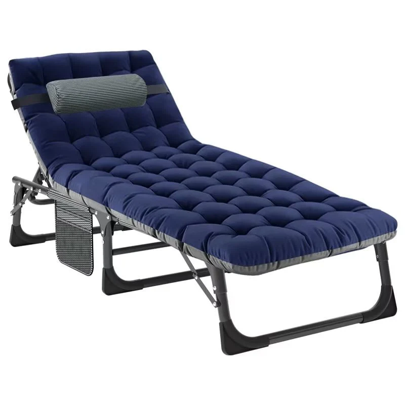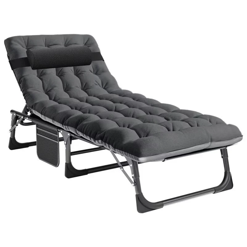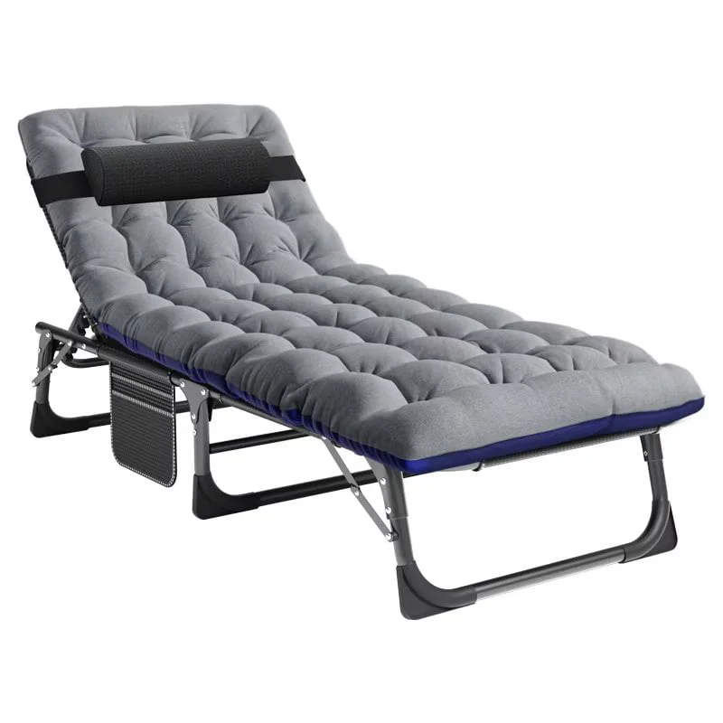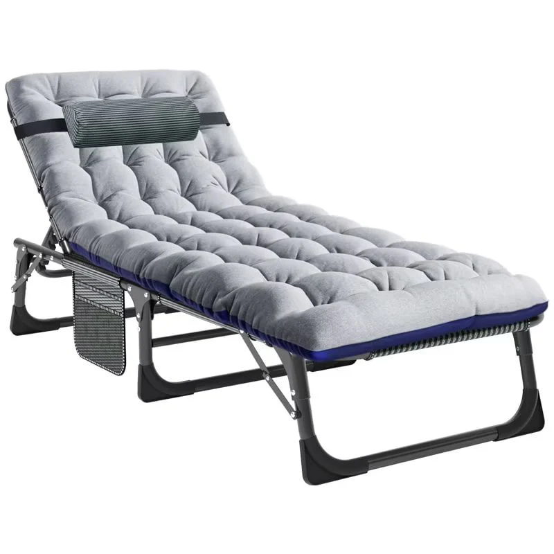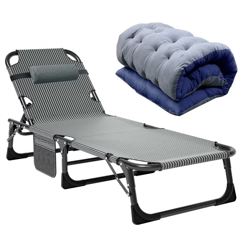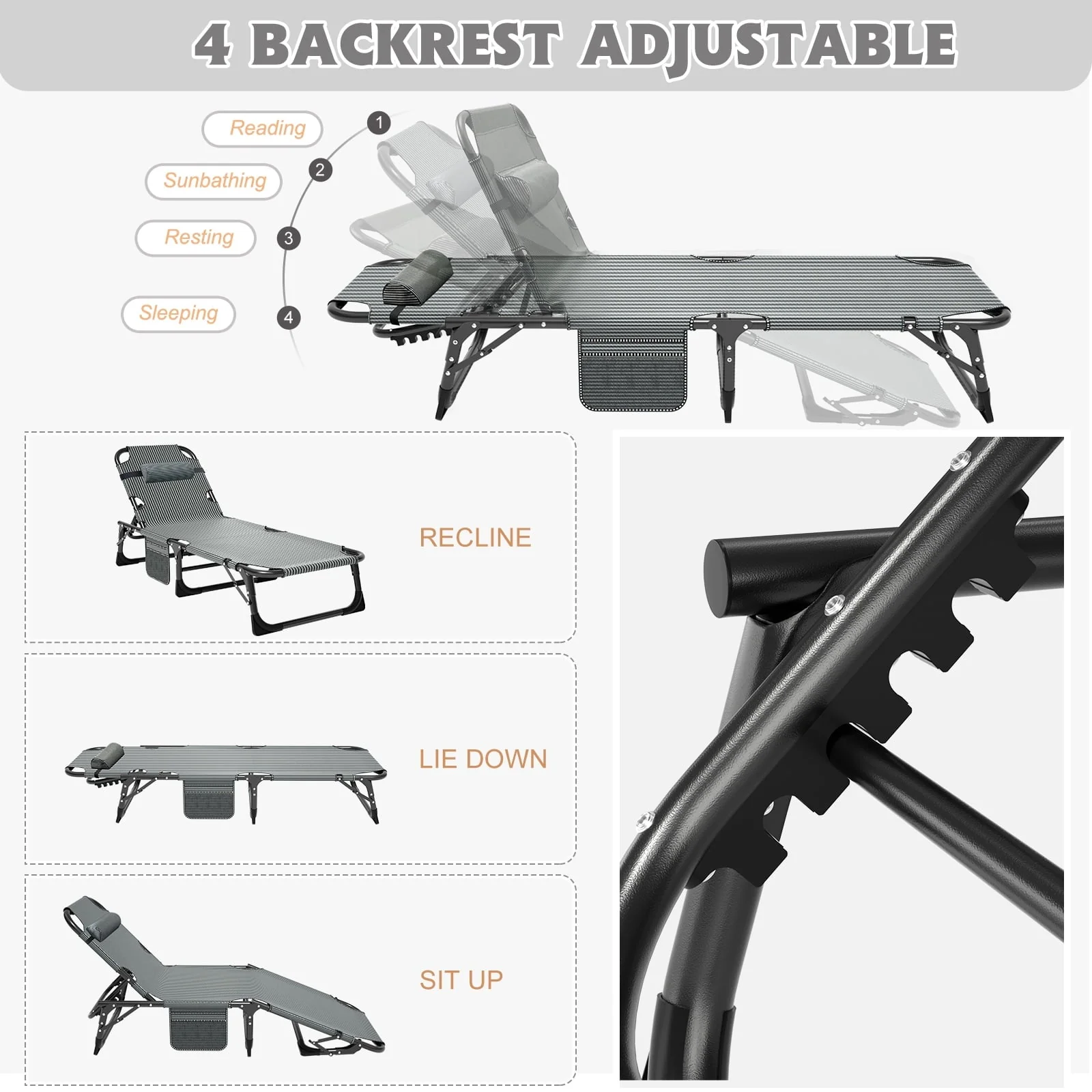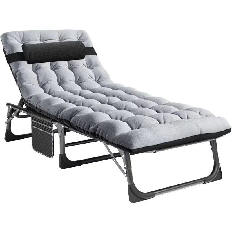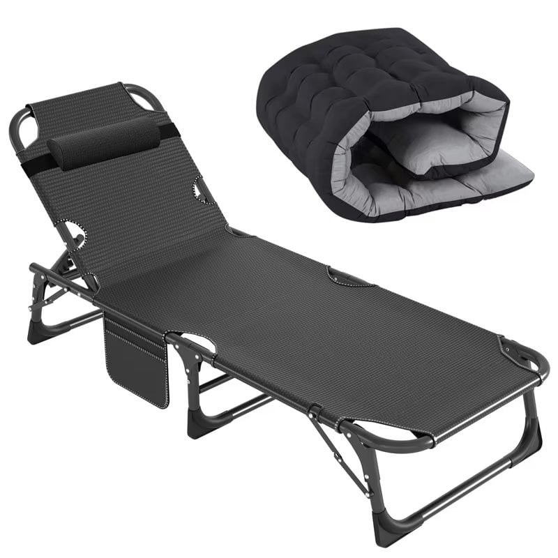 Outdoor Chaise Lounges, Adjustable 5-Position Adults Reclining Sleeping Cots are designed with 4 positions adjustable locking system, which allows you to adjust it to a comfortable position according to your needs. You can sit up, recline or lay flat. When folded up, the chair measures only : 28" x 25.6" x 6.7", making it ideal for transport and storage. When unfolded the chair measures:75.2"x 25.6"x 11.8". At 11.5 pounds of weight, very easy to be moved around. Folding Camping Bed Cots can be folded up to fit inside most car trunks. Designed for comfort: This recliner has a firm and soft surface that is perfectly balanced, and is ergonomically designed to help reduce muscle tension and stress; the beach recliner has a side pocket for your phone, books or keys; pillows Removable, can be adjusted up and down according to your needs; Multi-purpose: Tri-fold storage design, easy to transport and store. This cot will be an ideal choice for your next road trip, at home, swimming pool, lake, RV, camping, terrace, deck, tent or cabin.