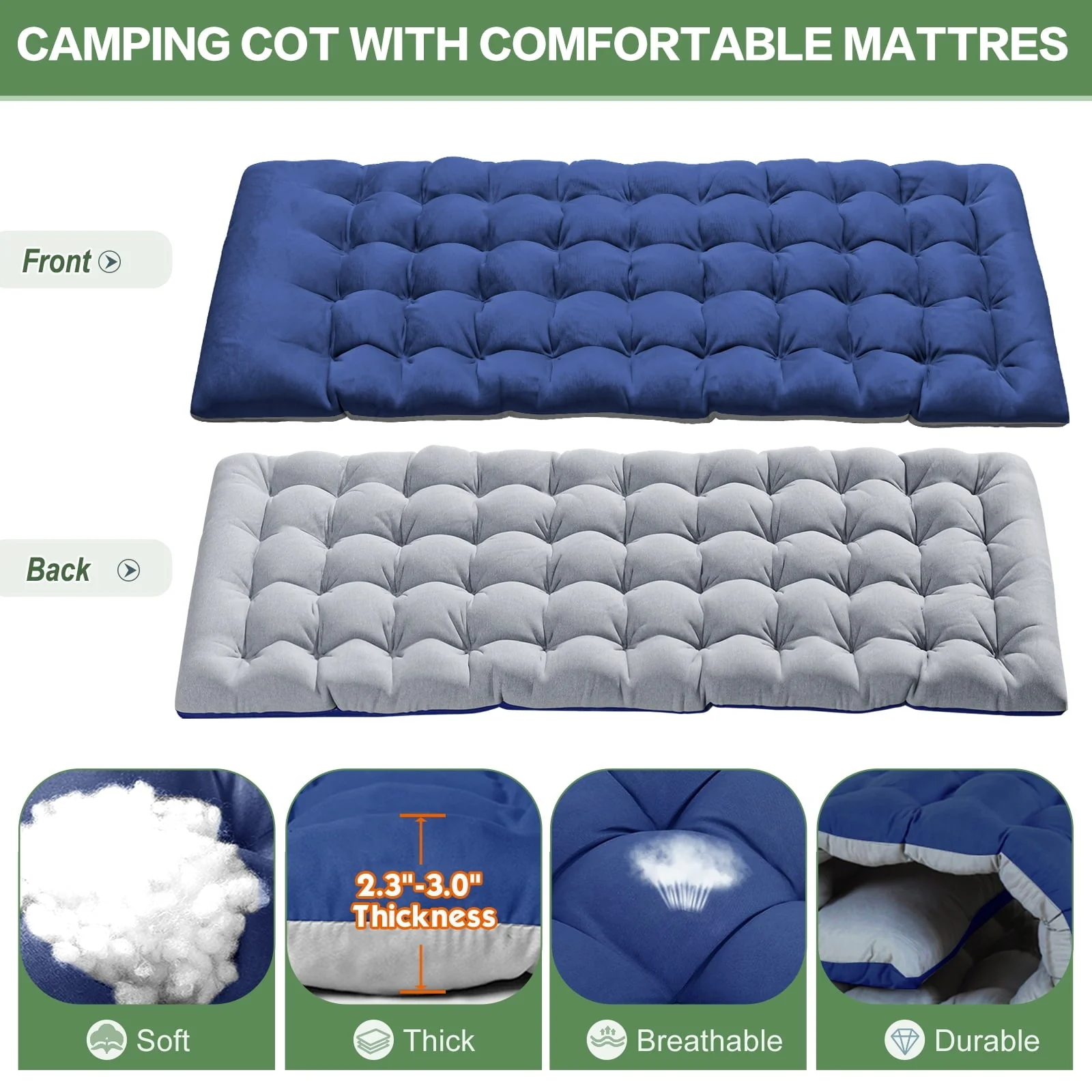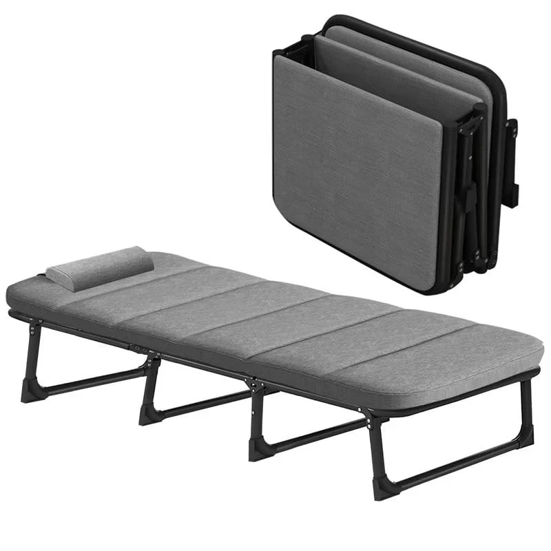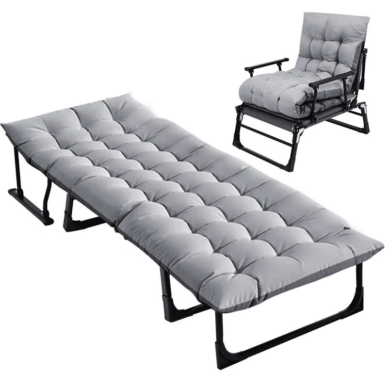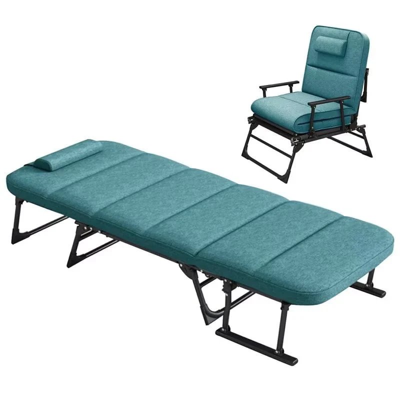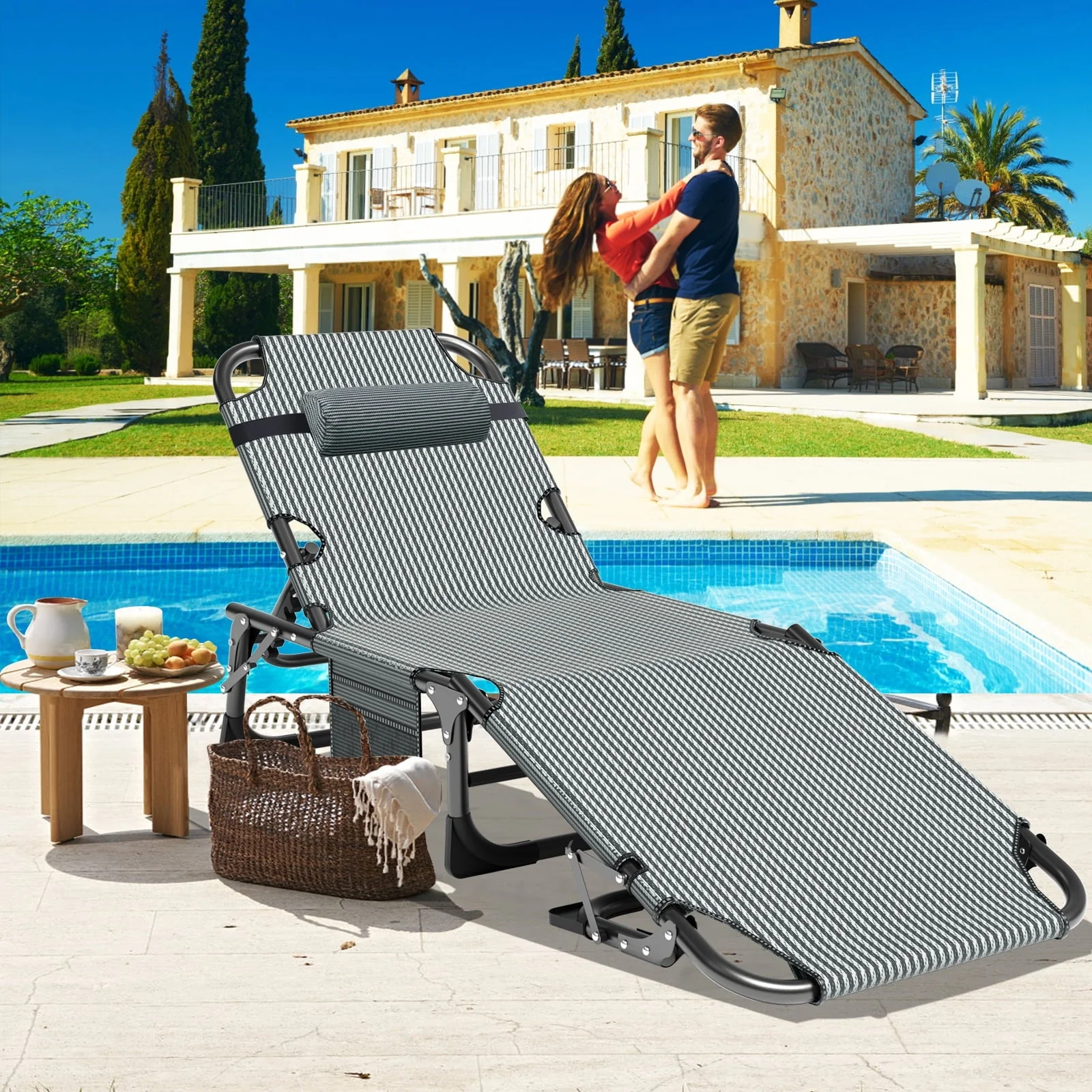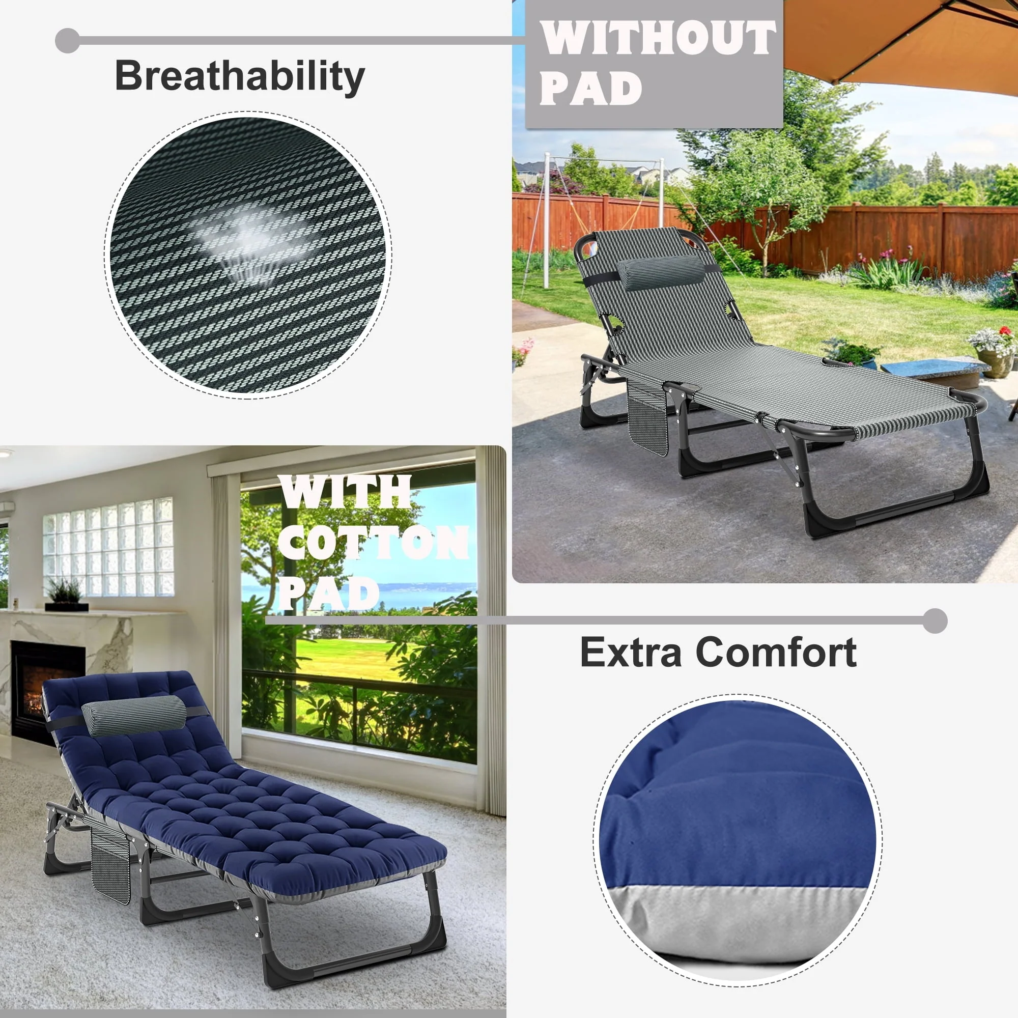 Outdoor Chaise Lounges, Adjustable 5-Position Adults Reclining Sleeping Cots are designed with 4 positions adjustable locking system, which allows you to adjust it to a comfortable position according to your needs. You can sit up, recline or lay flat. When folded up, the chair measures only : 28" x 25.6" x 6.7", making it ideal for transport and storage. When unfolded the chair measures:75.2"x 25.6"x 11.8". At 11.5 pounds of weight, very easy to be moved around. Folding Camping Bed Cots can be folded up to fit inside most car trunks. Designed for comfort: This recliner has a firm and soft surface that is perfectly balanced, and is ergonomically designed to help reduce muscle tension and stress; the beach recliner has a side pocket for your phone, books or keys; pillows Removable, can be adjusted up and down according to your needs; Multi-purpose: Tri-fold storage design, easy to transport and store. This cot will be an ideal choice for your next road trip, at home, swimming pool, lake, RV, camping, terrace, deck, tent or cabin.