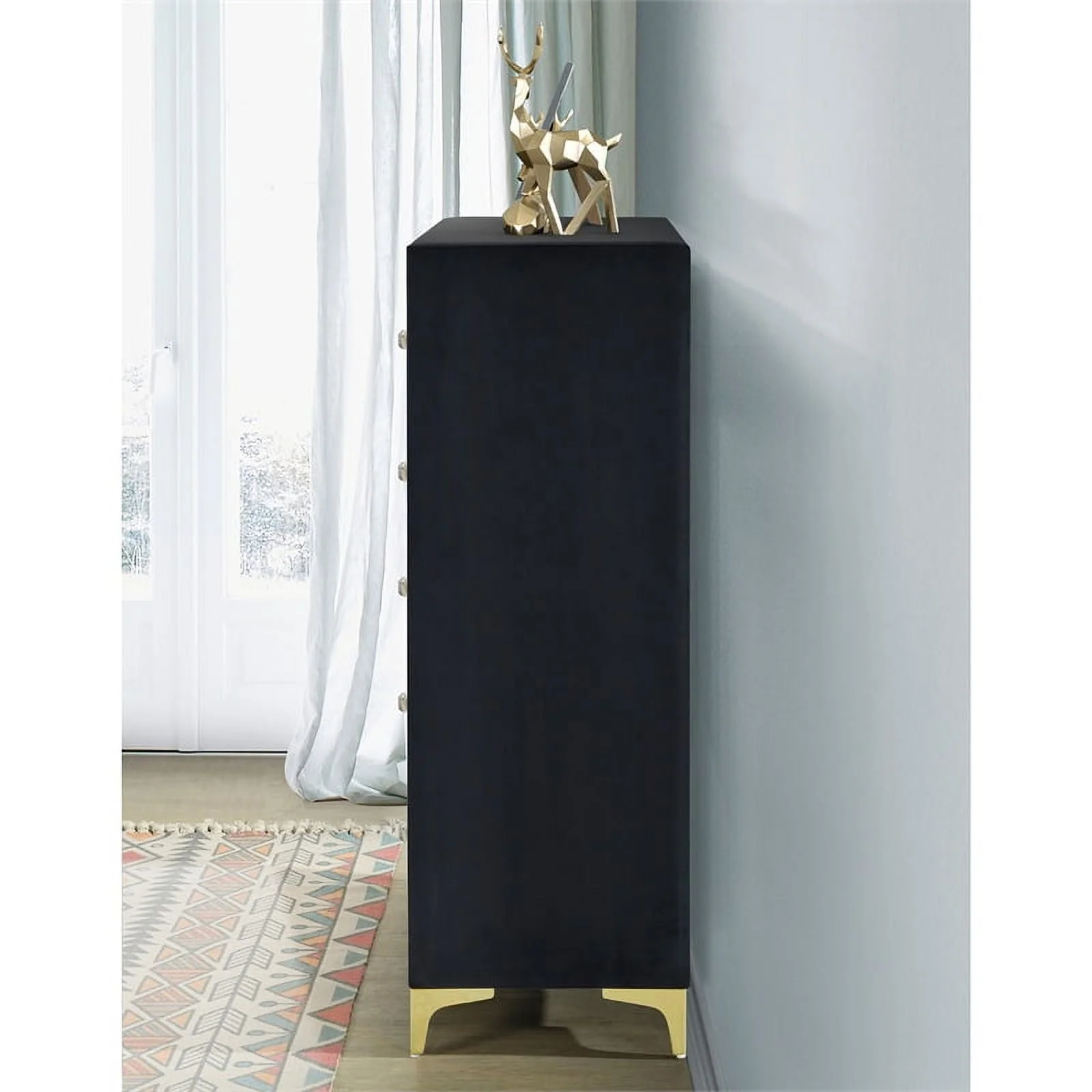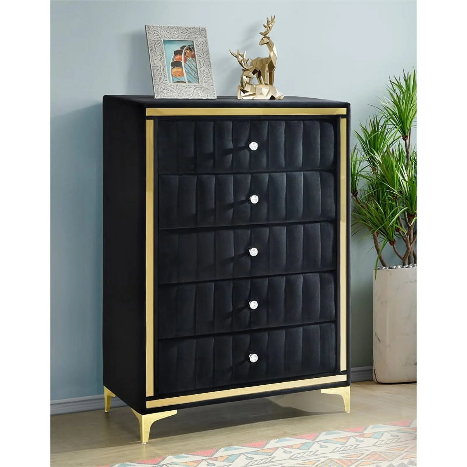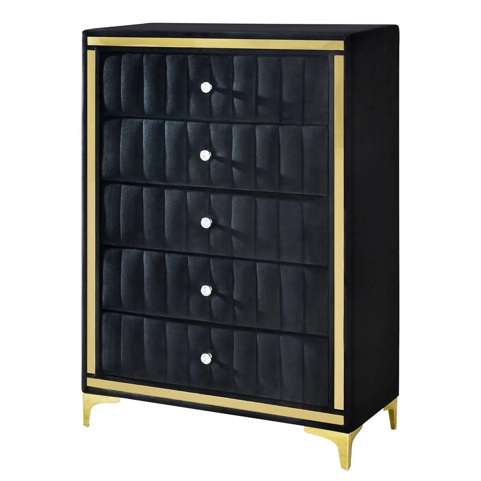 This luxurious Better Home Products Monique Velvet 5 drawer chest is the perfect addition to your home. Featuring gold legs and gold trim around, this chest will make a beautiful statement in any room. The drawers are adorned with crystal knobs, adding a touch of elegance to the piece. With plenty of storage space, this chest is ideal for bedroom, living room, or any other space that needs a touch of glamour. Plus, this chest is assembled you just need to screw legs and knobs, so you can enjoy it right away. From its eye-catching design to its sturdy construction, this velvet upholstered 5 drawer chest is sure to make a lasting impression.