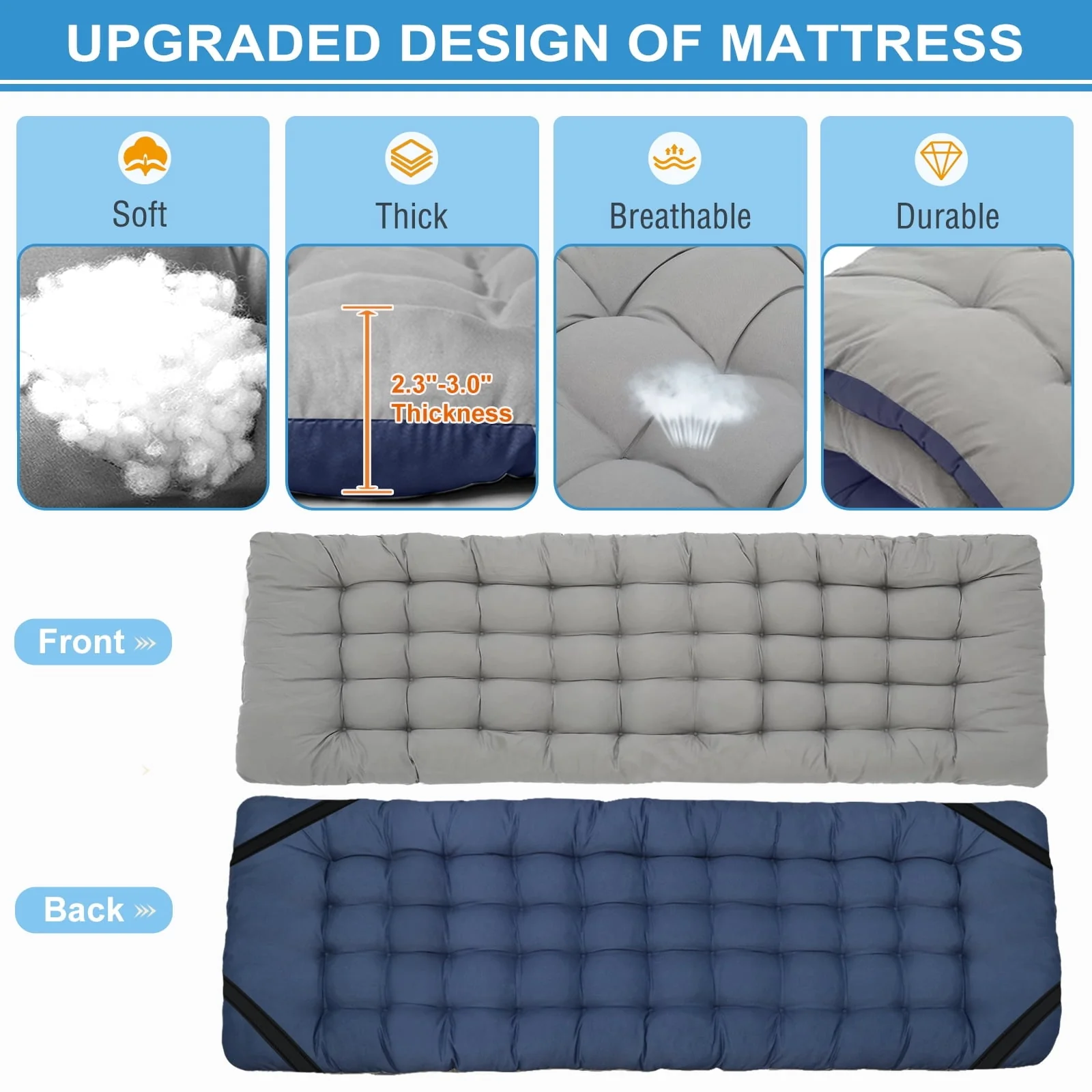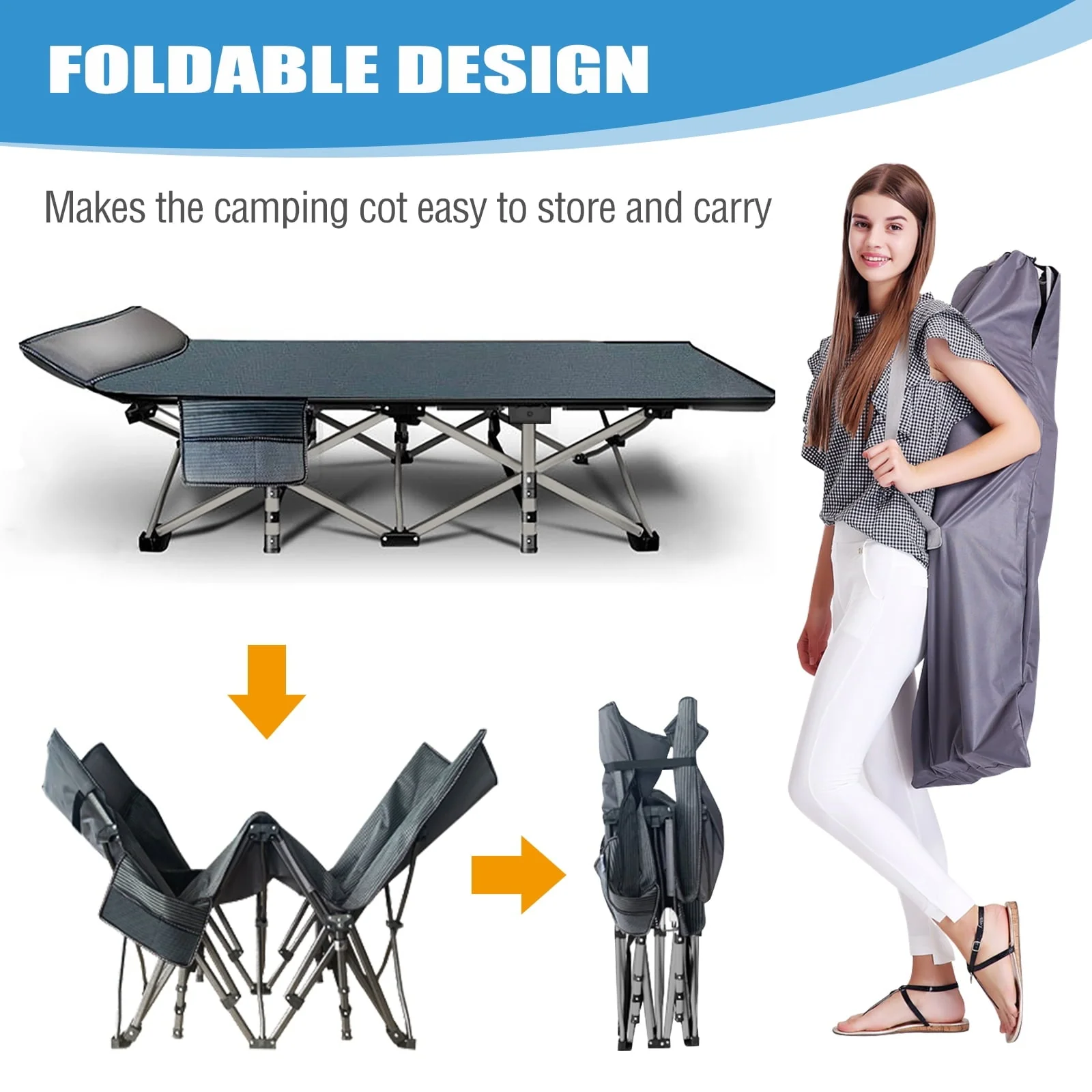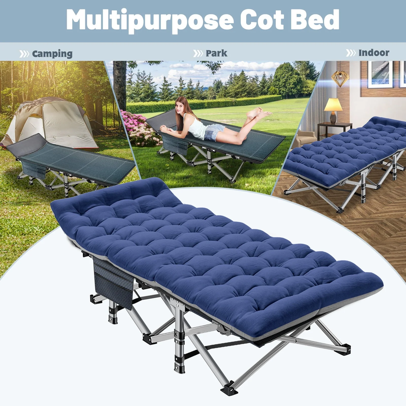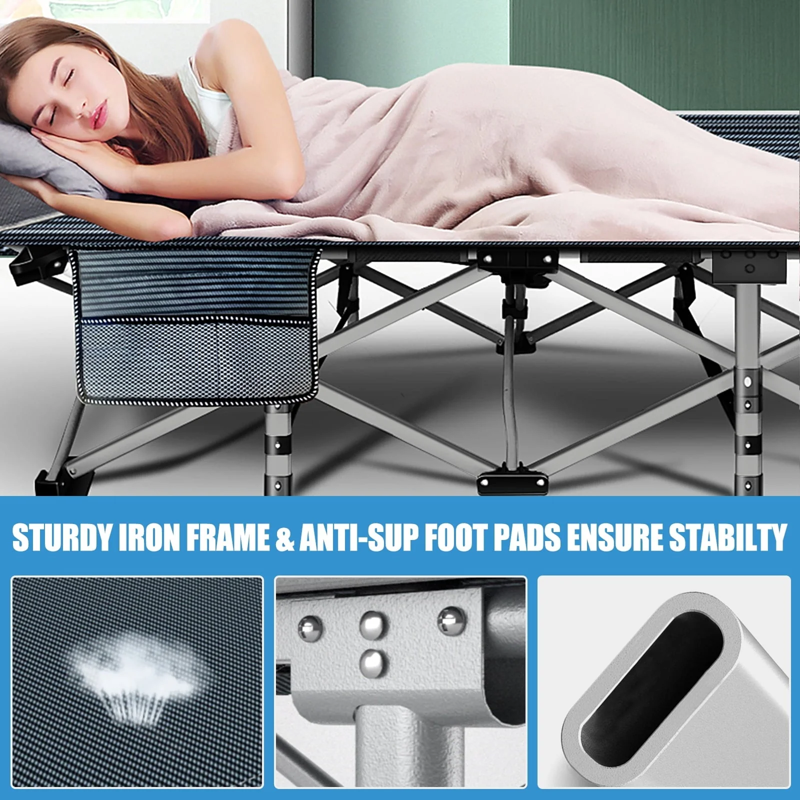 MOPHOTO folding camping bed with pearl cotton pad and carry bag can be widely used not only for camping, patio, pool furniture sunbathing in the park or your backyard, but also as an indoor bedroom, living room, office, and anywhere you need to sleep. This camping bed is made of double-layer 600D Oxford fiber, supporting up to 880 pounds, high strength, water resistant, easy to clean, more durable, and guarantees a more comfortable and healthy sleep.