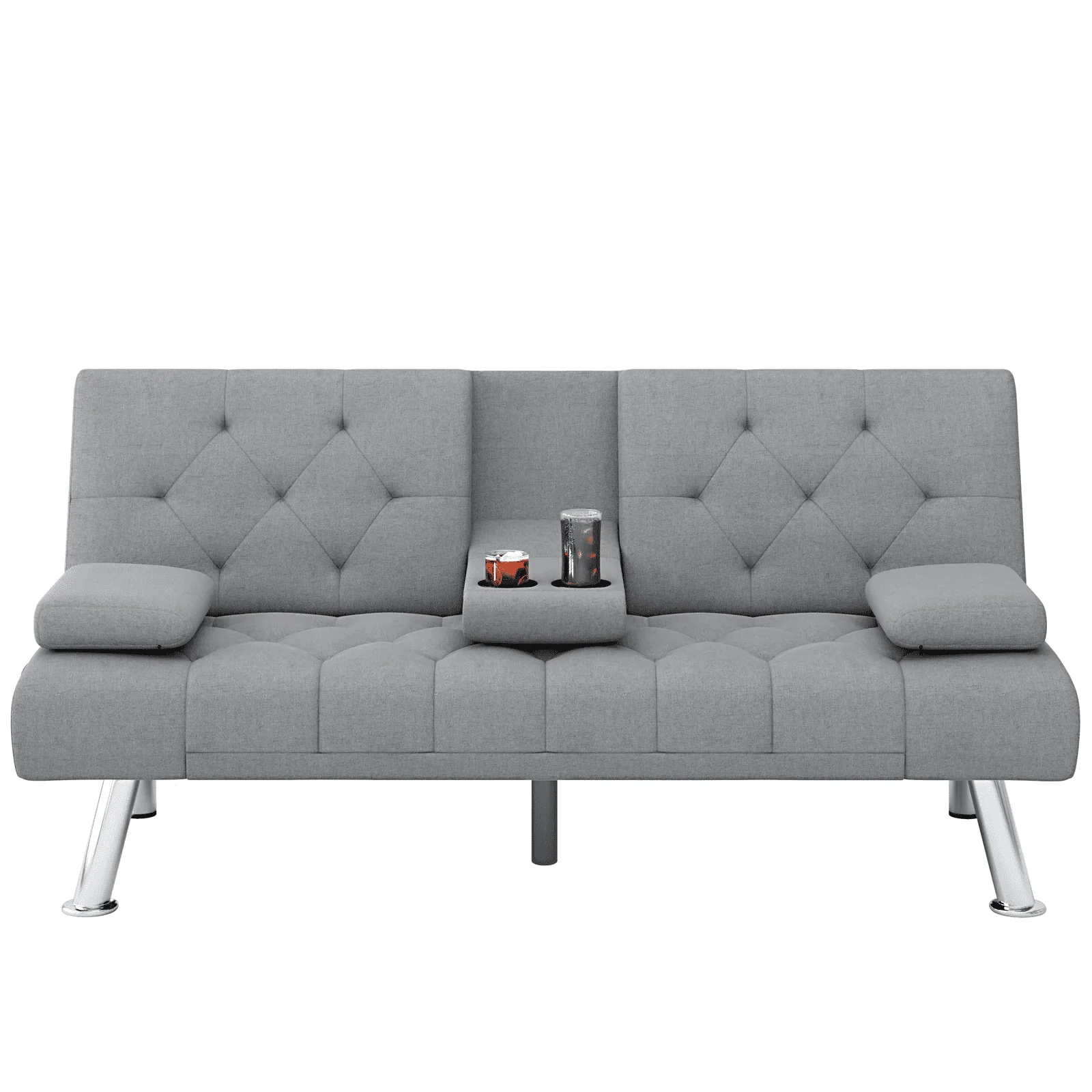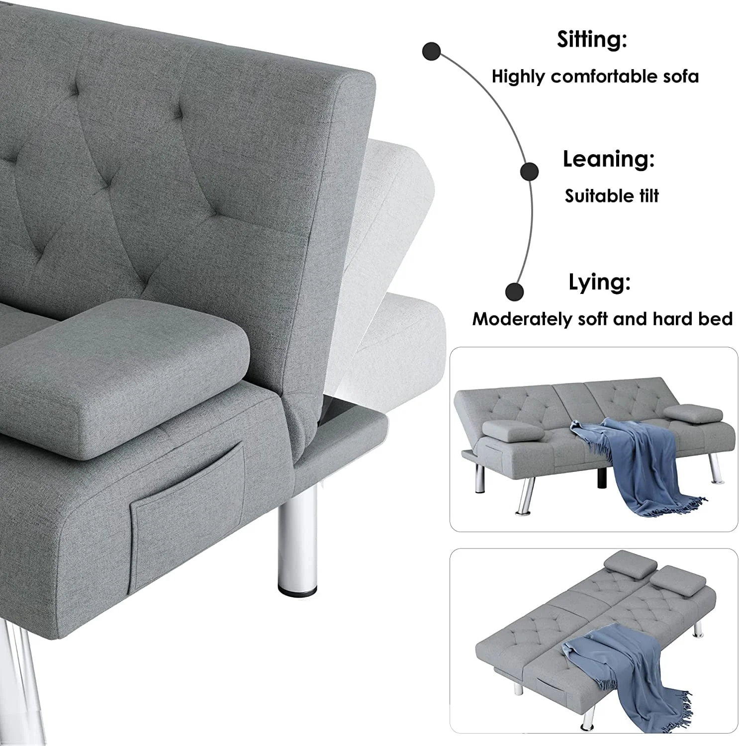 This Homfa couch sofa bed is designed with exquisite tufted linen fabric and solid wood metal legs, a drop-down table in the middle with 2 cup holders provides a convenient space for drinks. 2 Side pockets conveniently hold your remote control, magazines, and more. 2 armrests can be moved at will and can be placed anywhere. Convertible couch sofa bed with a total weight of up to 350 pounds, which will complete the modern interior of your dreams. Our couch explains the versatility of this sofa that can be used on many occasions. The headrest is a perfect partner of bed which can offer suitable support to your head. Movable headrests can meet this demand. It can also be used as armrests as you like. You will feel an incredible sleeping experience. We believe you will like the futon sofa bed.