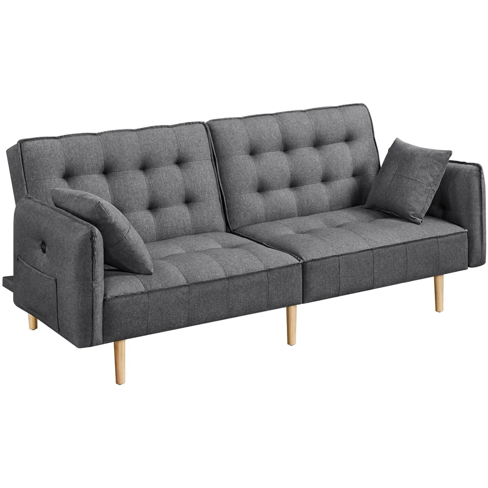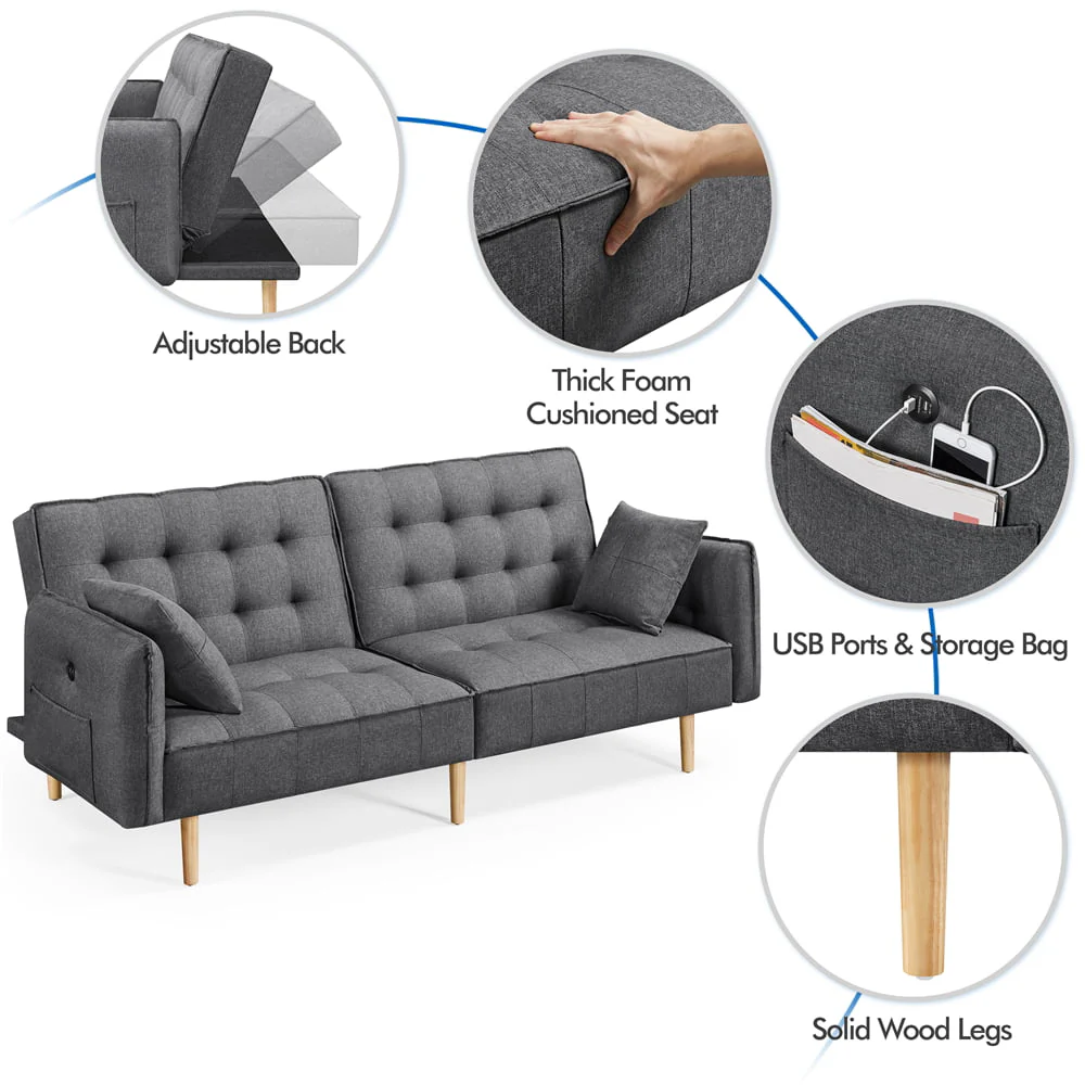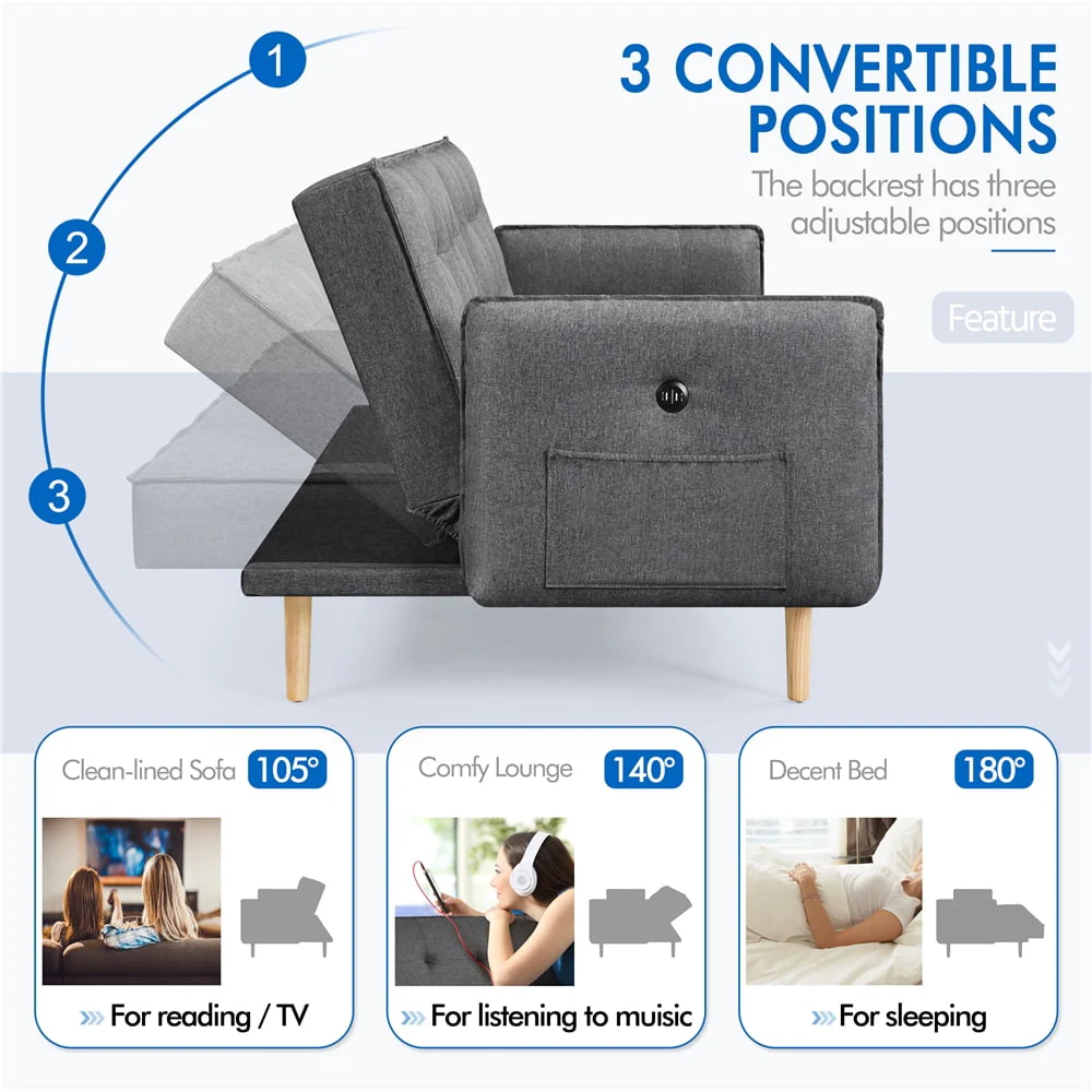 Elevate your living room with this sleek, Modern sofa bed. Our futon features USB charging ports along the arm and side pocket underneath, so you can sit comfortably while charging your devices. The convertible design allows you to transition the futon into three different angles, making it perfect for sitting up to watch TV, lounging back to relax, or having guests stay overnight. Guests are sure to rave about the plush, memory foam filled cushions when they first sit down. The oak, wooden tapered legs are sturdy and robust, and the linen fabric is soft to the touch and comfortable to cozy up in for the evening. Looking for style and function? The Alden Design Memory Foam Convertible Futon Sofa Bed with USB is the perfect choice.