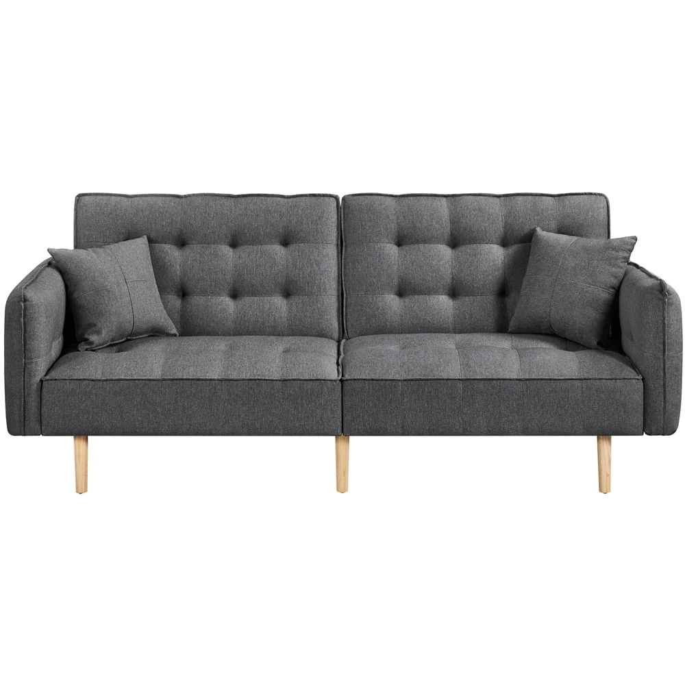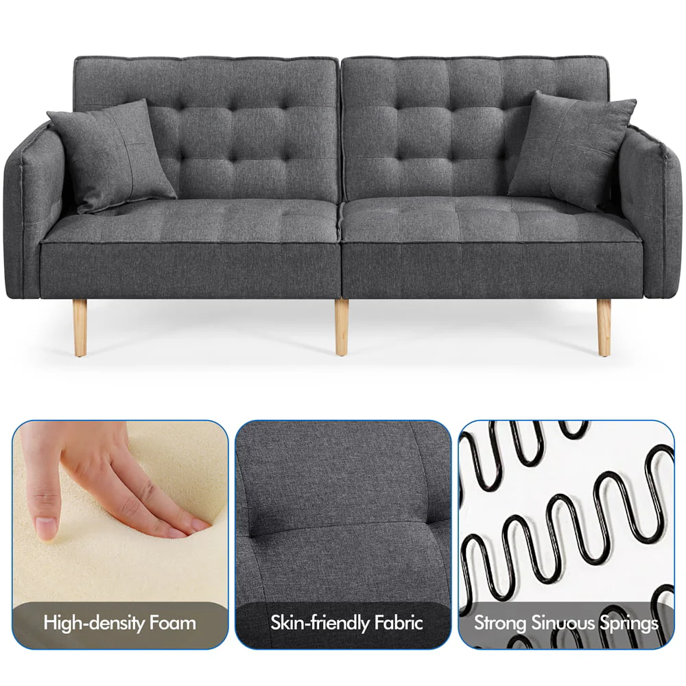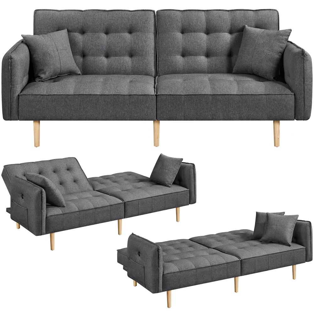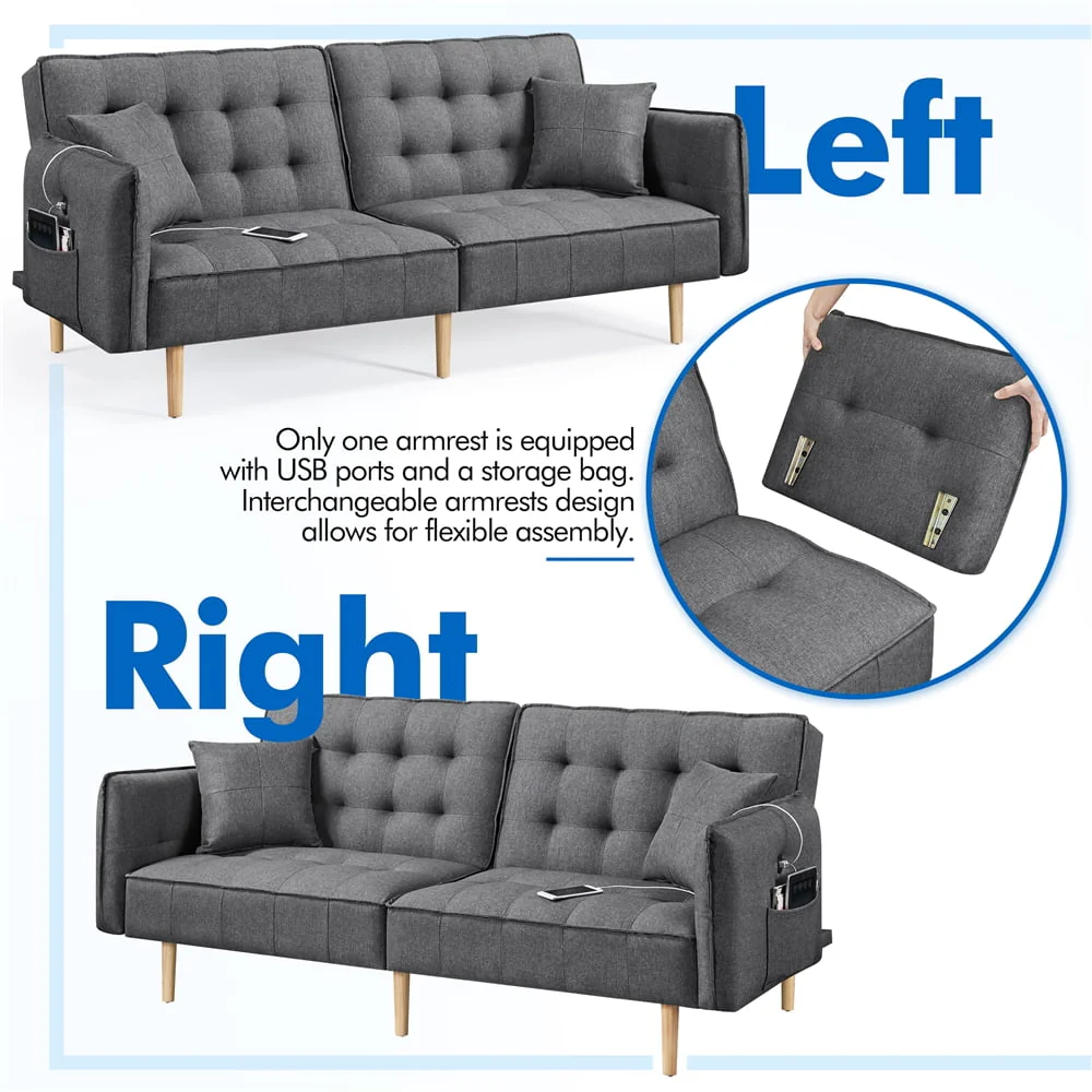 Elevate your living room with this sleek, Modern sofa bed. Our futon features USB charging ports along the arm and side pocket underneath, so you can sit comfortably while charging your devices. The convertible design allows you to transition the futon into three different angles, making it perfect for sitting up to watch TV, lounging back to relax, or having guests stay overnight. Guests are sure to rave about the plush, memory foam filled cushions when they first sit down. The oak, wooden tapered legs are sturdy and robust, and the linen fabric is soft to the touch and comfortable to cozy up in for the evening. Looking for style and function? The Alden Design Memory Foam Convertible Futon Sofa Bed with USB is the perfect choice.