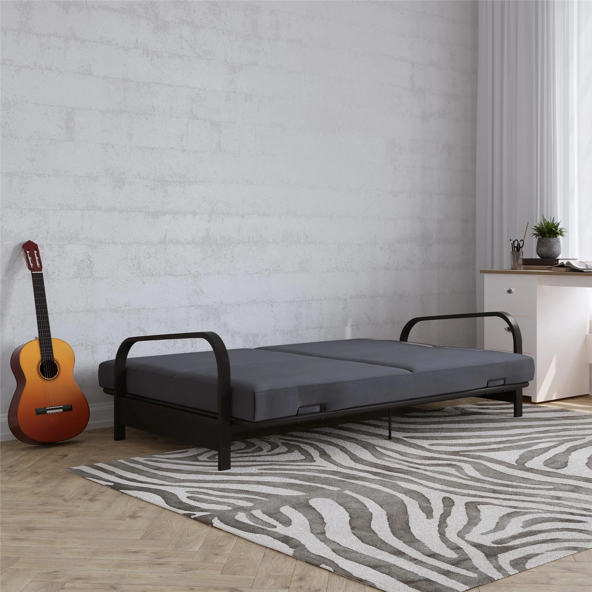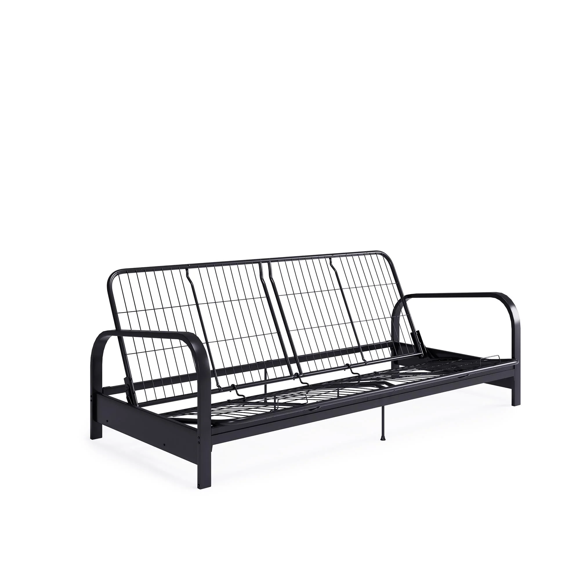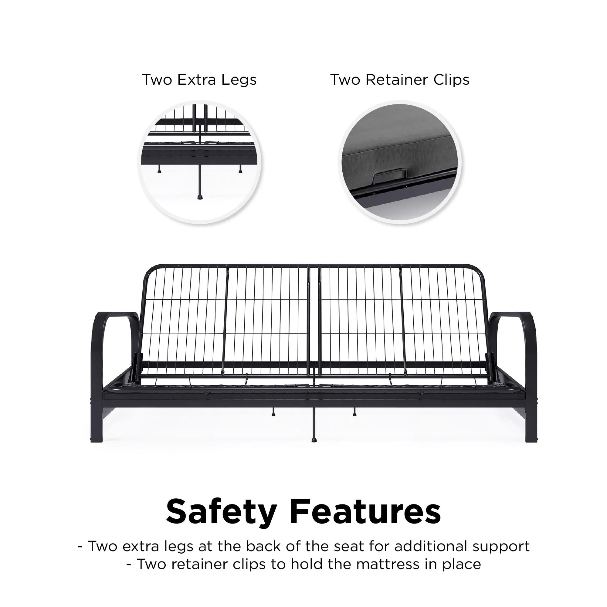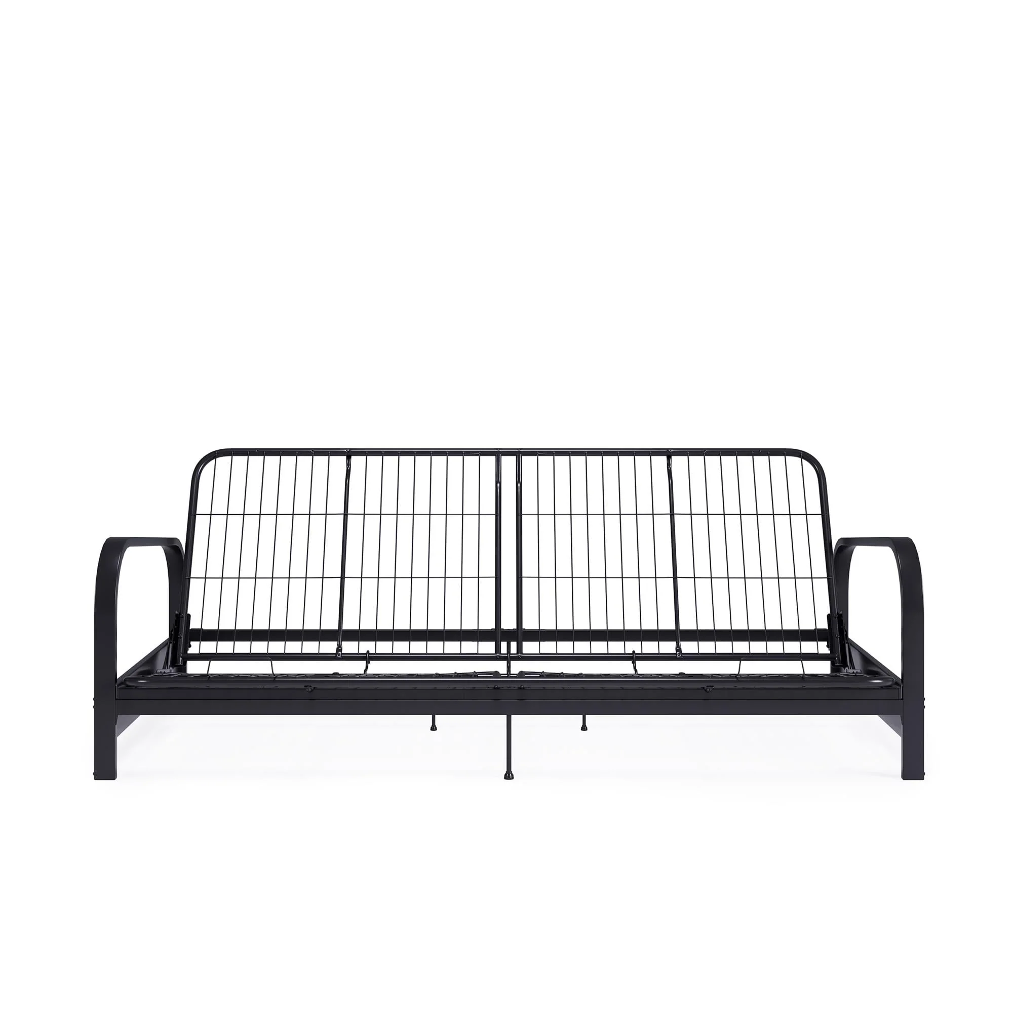 The DHP College Metal Arm Futon with Futon Mattress is the perfect futon for your home. With a compact and contemporary, this futon fits just about anywhere in your home. Its curvy silhouette in sleek black metal, makes it an excellent choice for a living room, home office or guest room. Best of all, it offers a practical solution as the back can be lowered to accommodate overnight guests. The DHP Metal Arm Futon comes with two mattress retainer clips to hold the mattress in place as well as center legs for added support and stability. The design was improved to include two additional legs at the back of the seat to provide extra support and durability. The DHP Metal Arm Futon also has a new mattress composition with firm support to withstand a 1000-cycle test for resiliency without bottoming out to feel the metal frame after long-term use.