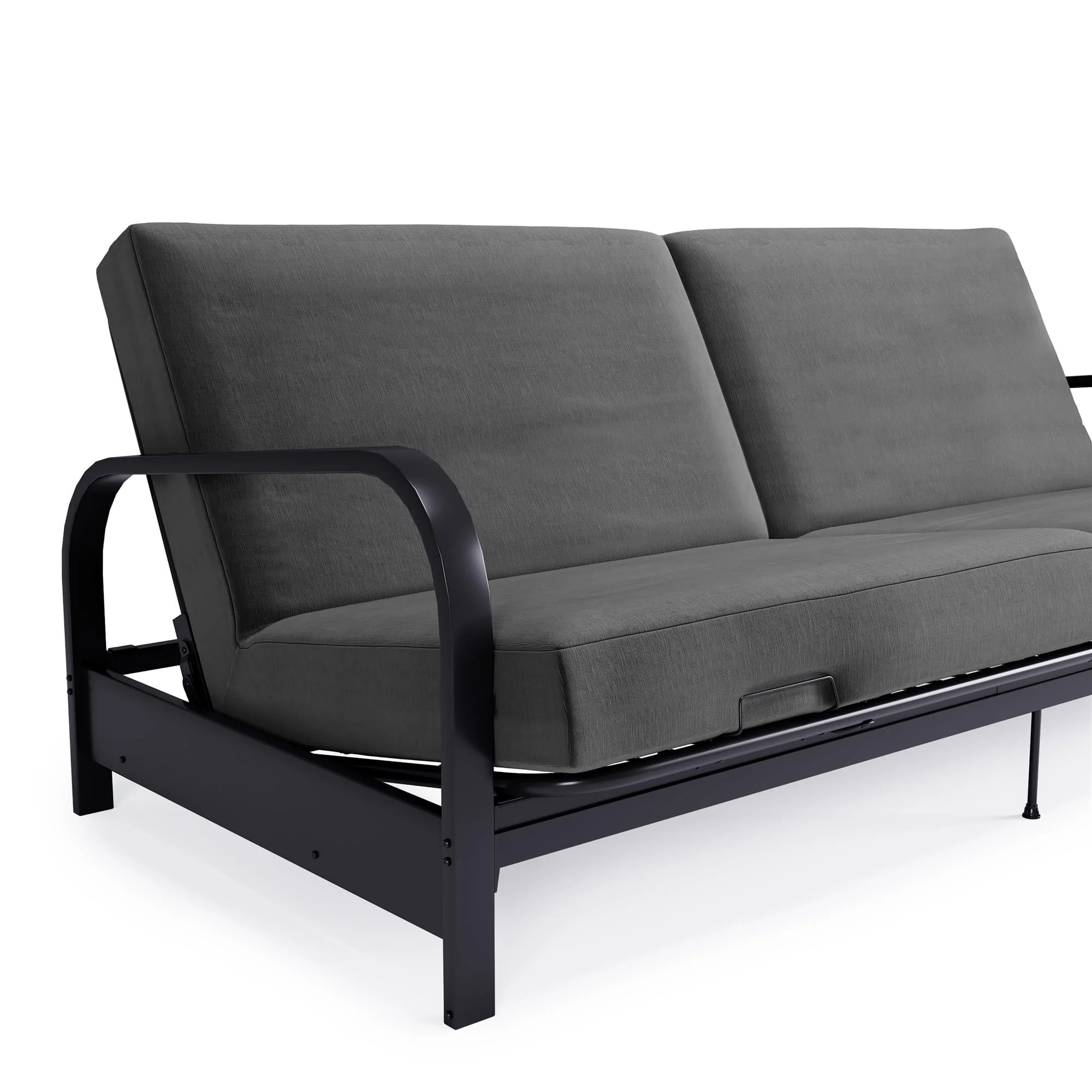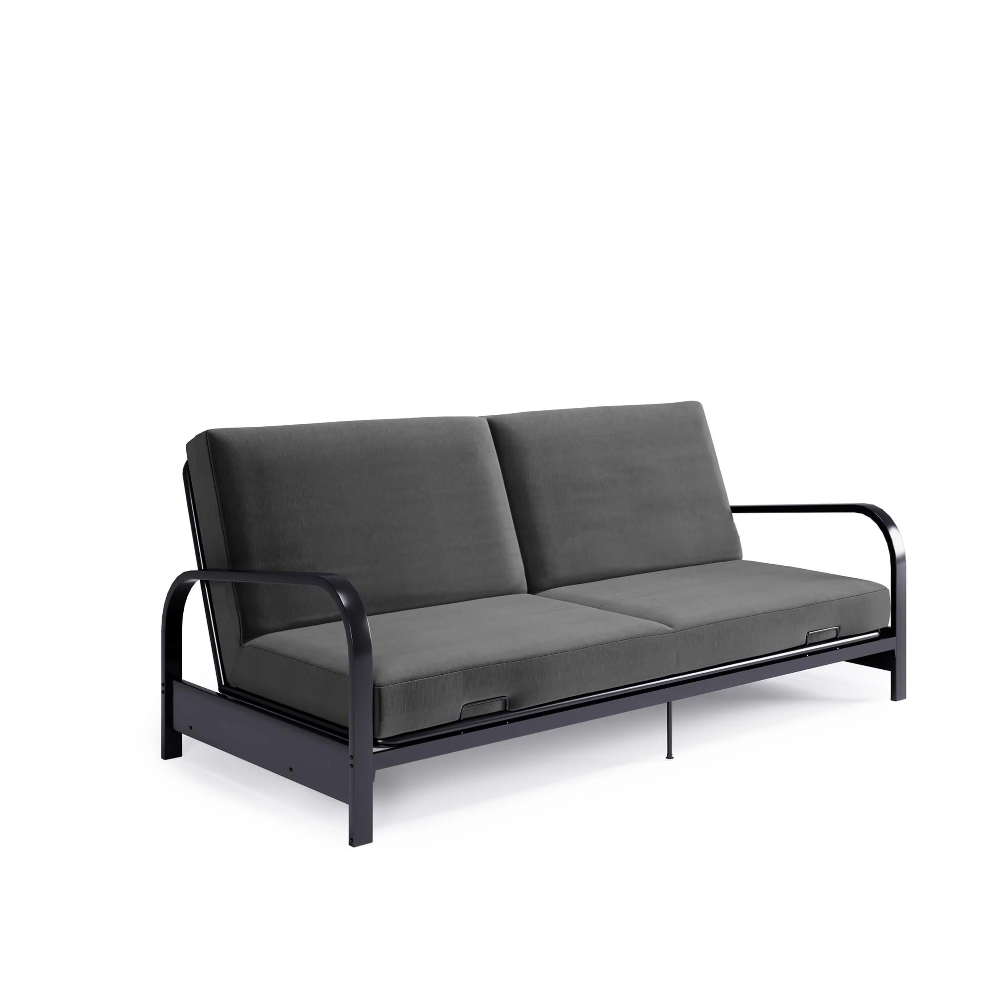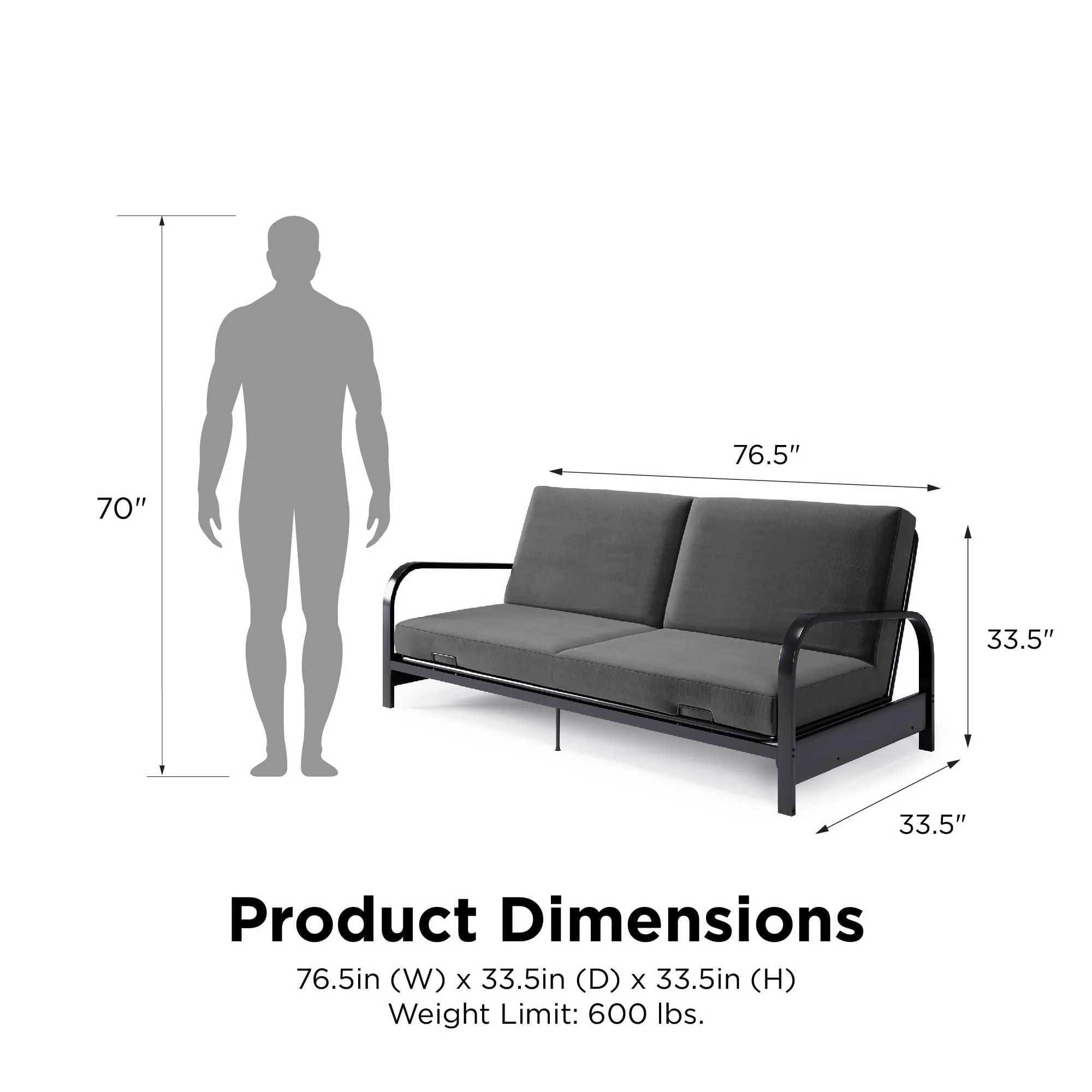 The DHP College Metal Arm Futon with Futon Mattress is the perfect futon for your home. With a compact and contemporary, this futon fits just about anywhere in your home. Its curvy silhouette in sleek black metal, makes it an excellent choice for a living room, home office or guest room. Best of all, it offers a practical solution as the back can be lowered to accommodate overnight guests. The DHP Metal Arm Futon comes with two mattress retainer clips to hold the mattress in place as well as center legs for added support and stability. The design was improved to include two additional legs at the back of the seat to provide extra support and durability. The DHP Metal Arm Futon also has a new mattress composition with firm support to withstand a 1000-cycle test for resiliency without bottoming out to feel the metal frame after long-term use.