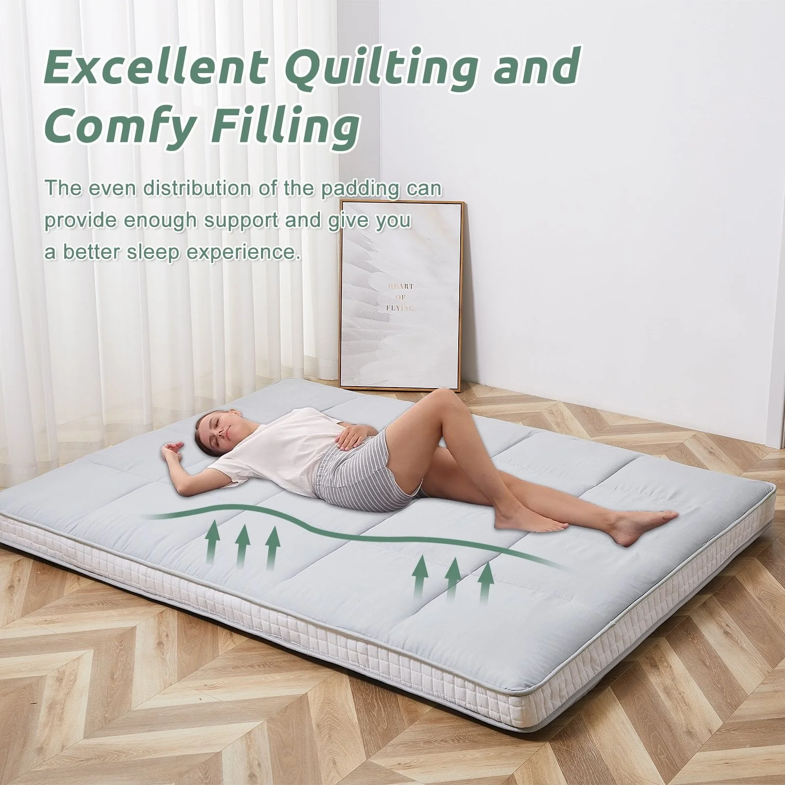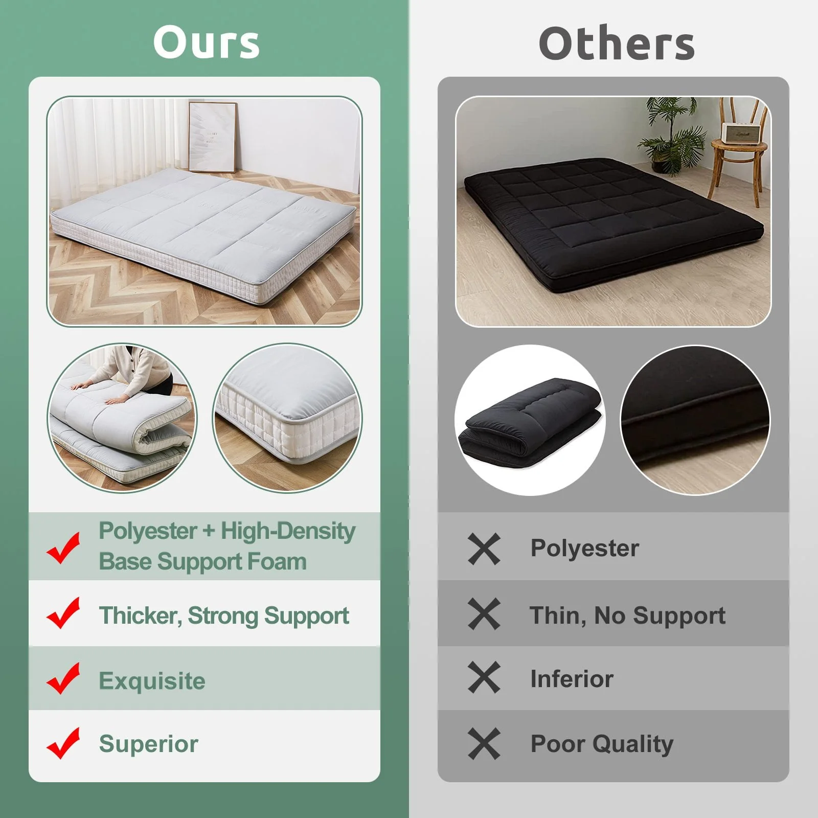 ABORON Japanese 4 inch Thicker Patterned Futon Mattress.Polyester cover material will bring you the best sleeping feeling, also using a chequer-shaped design on the futon mattress will make it more classic and elegant. Queen Size: 60" wide x 80" long, Full Size: 54" wide x 80" long, Twin size:39 " wide x 80" long,4 inch thickness.Weight: 12/17/19 lbs.The whole set include 1 futon mattress, 1 pair of bandage, 1 canvas storage bag.For better storage and carrying, the mattress are equipped with straps and storage bag.The diamond patterned futon mattress make you feel more comfortable to sleep on the floor. The futon mattress has two cord - like seam that runs along the edges of the mattress surface to prevent edge collapse. The surface adopts square pattern quilting and top upholstery provides the mattress with its comfort.Thick high-density base support foam will offer a good support and polyester filling provides you with moderate softness,all these making you fall asleep.This floor mattress is an ideal floor bed choice for guest room, hotel, dormitory, hospital, travel and your guest. It can be used as floor mattress, camping mat, bedroom futon, living room futon, floor lounger, tatami mat, sleeping floor mat, guest bed, Japanese bed mat, also can be kids play mat, floor pillow.