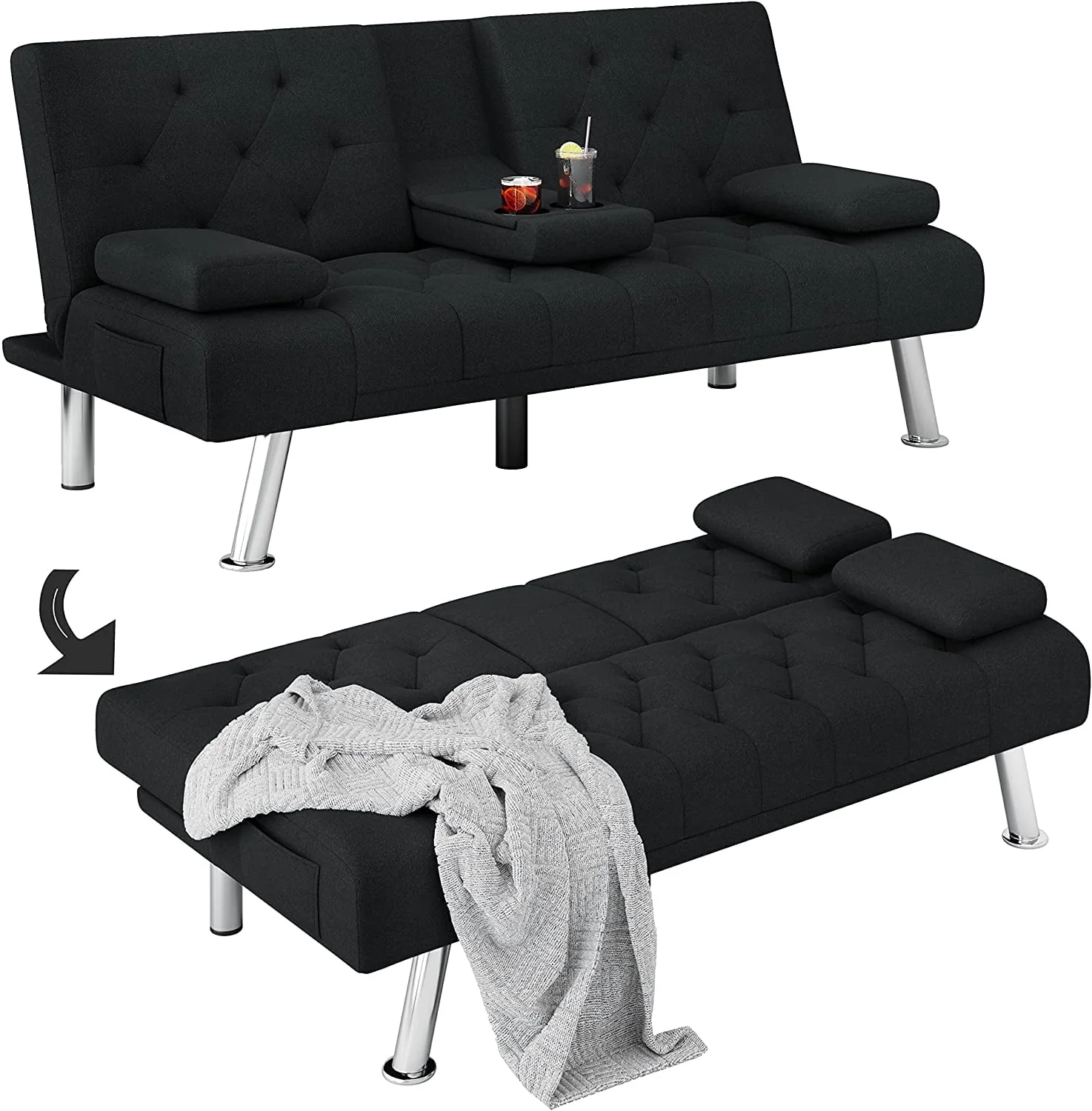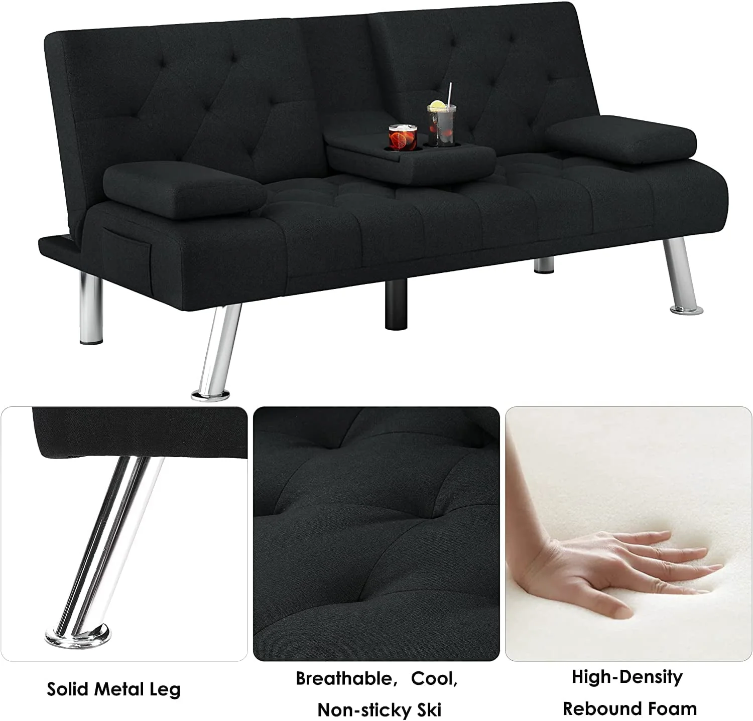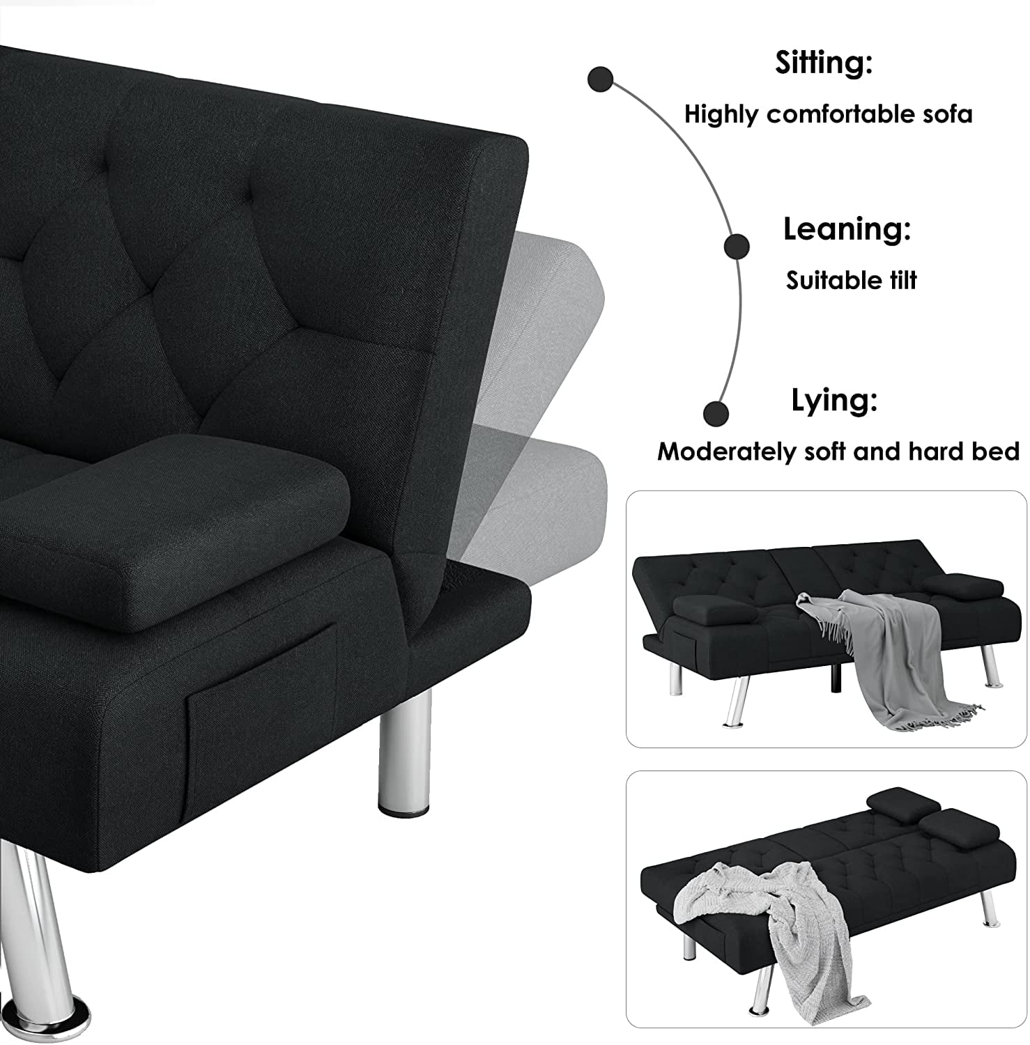 This Homfa couch sofa bed is designed with exquisite tufted linen fabric and solid wood metal legs, a drop-down table in the middle with 2 cup holders provides a convenient space for drinks. 2 Side pockets conveniently hold your remote control, magazines, and more. 2 armrests can be moved at will and can be placed anywhere. Convertible couch sofa bed with a total weight of up to 350 pounds, which will complete the modern interior of your dreams. Our couch explains the versatility of this sofa that can be used on many occasions. The headrest is a perfect partner of bed which can offer suitable support to your head. Movable headrests can meet this demand. It can also be used as armrests as you like. You will feel an incredible sleeping experience. We believe you will like the futon sofa bed.