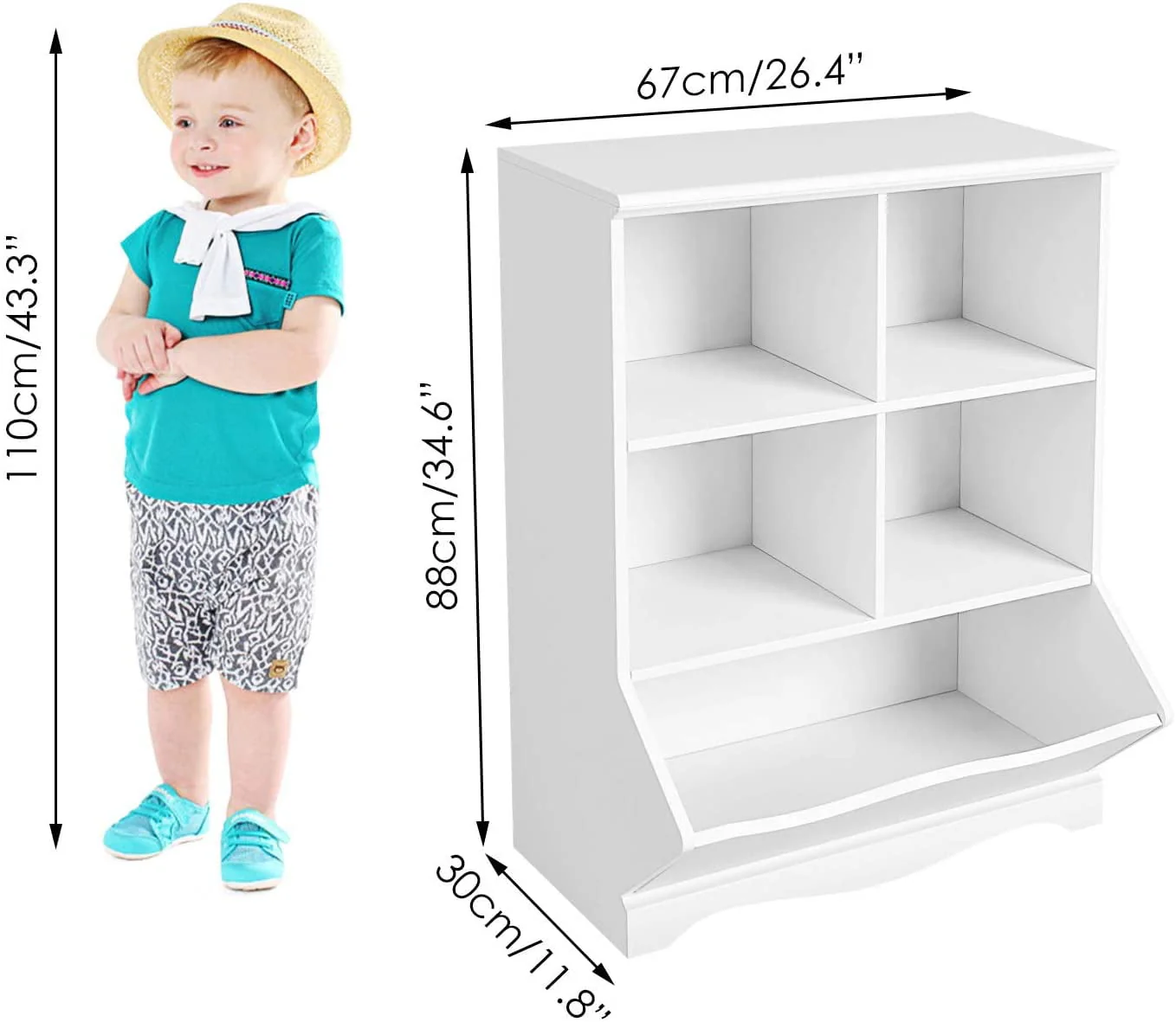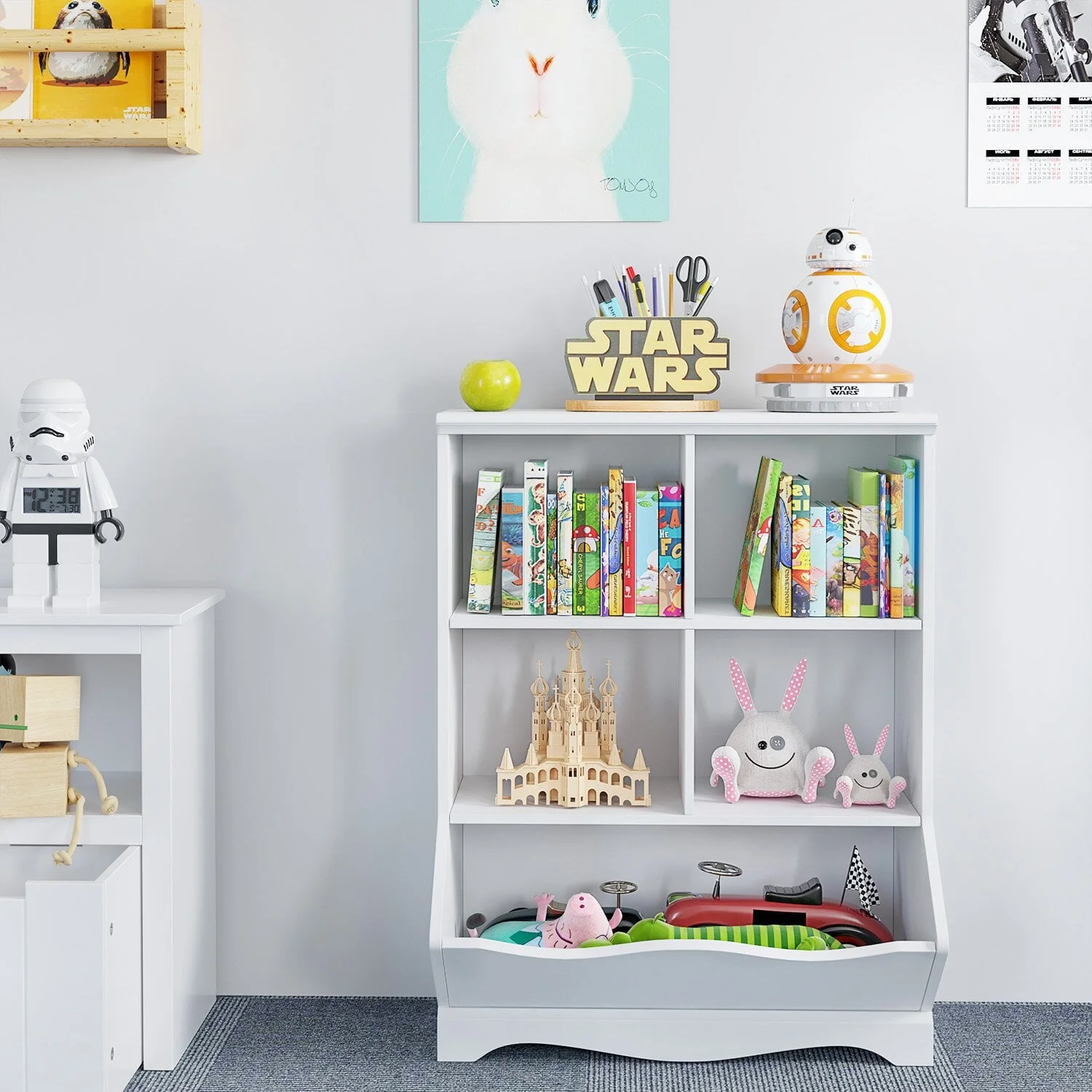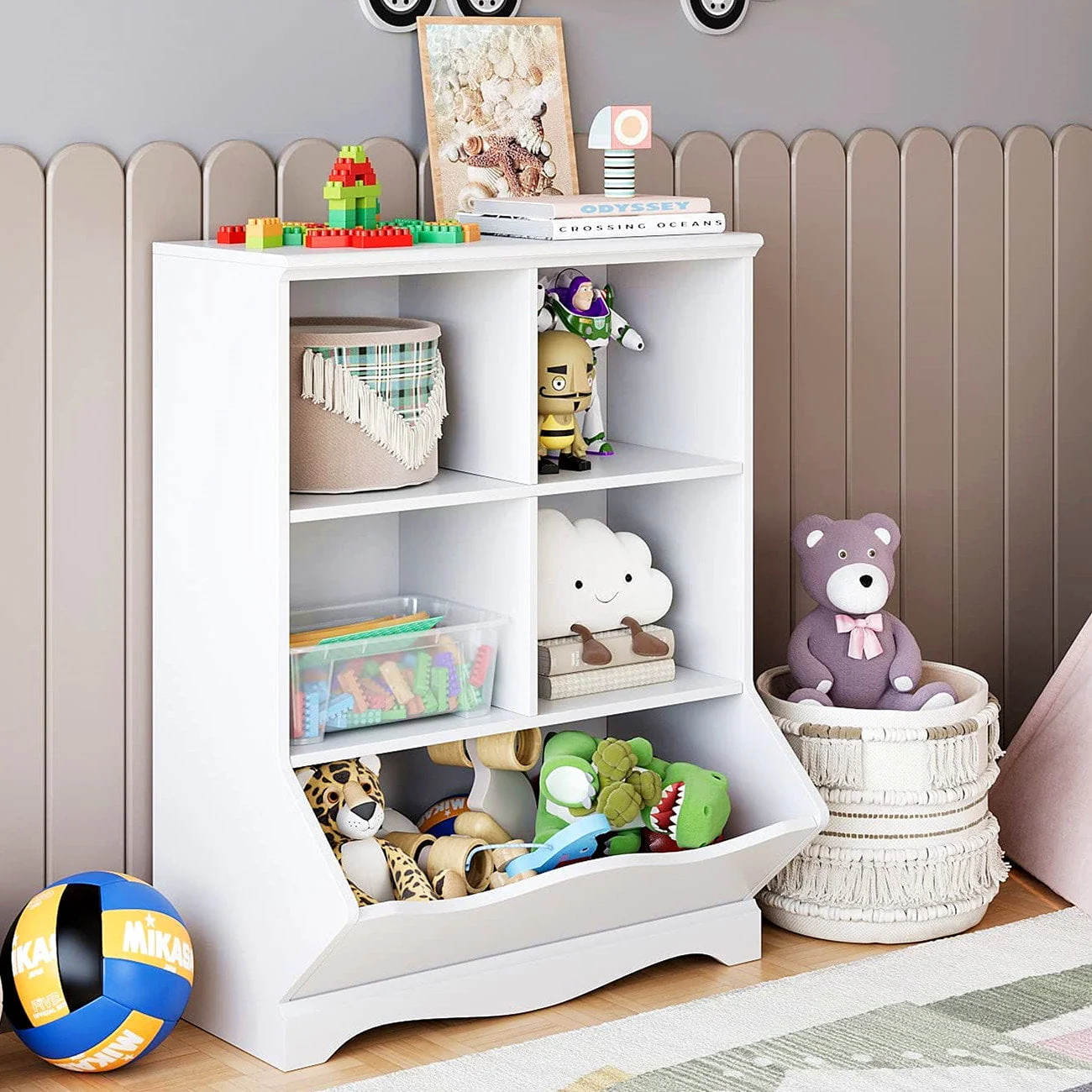 With four-compartment cubbies and one large bottom bin, this toy storage cubby can easily store and showcase kinds of belongings like books, toys, art supplies, and more, making your cluttered room neat and organized in a good manner rather than having a bunch of toy boxes all over. In addition, you can add fabric or weave bins to create fun concealed storage.This toy box with bookshelf is a perfect catch-all for stuffed animals, comic books, or own clothes.