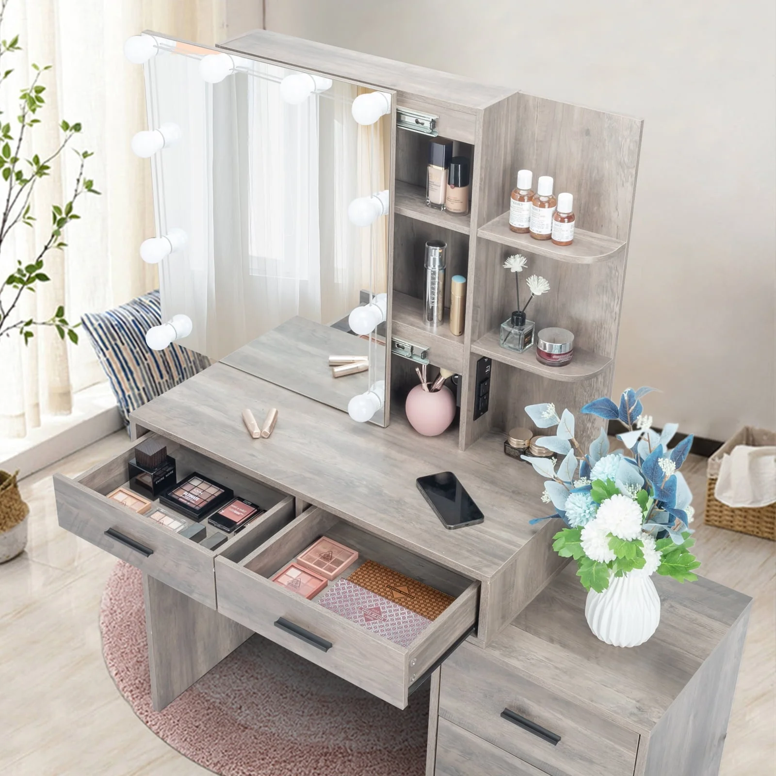 This is a multi-functional dressing table. The structure design of 5 drawers, 2 shelves and 1 mirror cabinet allows the storage of this product. The object space is greatly improved; 3 colors are adjustable, white light/warm white/warm light, which can be switched at will in different application scenarios.