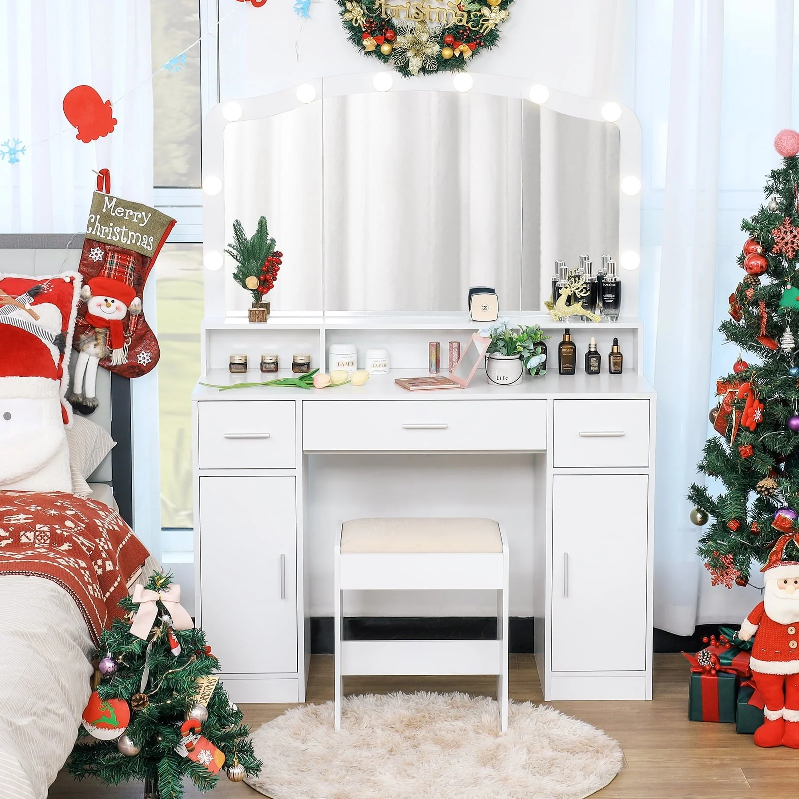 The sleek design, modern and simple white look and 10 Hollywood Light Bulbs make this vanity a bewitching highlight to your bedroom or dressing area. Also if you are the man who is struggling to find a birthday gift, anniversary gift or other special day gift, letting this makeup table a surprise for your girlfriend, mom, wife, it will be smart and unique!