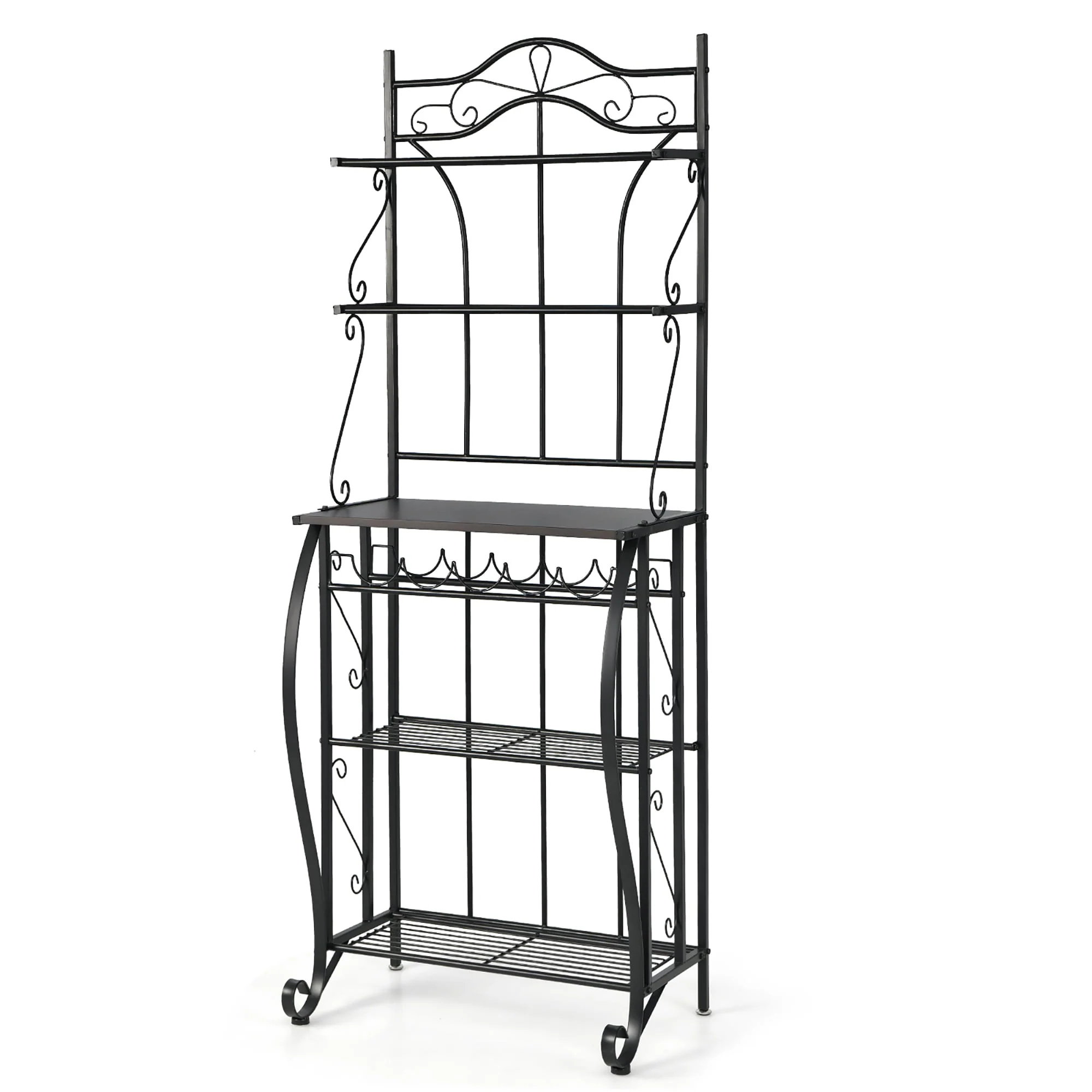 With a compact vertical design, this kitchen stand allows you to access plenty of storage space without taking up too much space. The spacious countertop, 5-bottle wine rack 4 metal mesh shelves provides sufficient storage space for your kitchenware, dinnerware, wine, food and other kitchen supplies. Meanwhile, the rustproof steel frame, adjustable foot pads plus anti-toppling device create an extremely solid and stable construction, which ensures that the freestanding storage unit can serve you for a long time. As pretty as practical, it’s ideal for kitchen, living room, dining room, pantry, etc. You can use it as a plant stand, sideboard cabinet or display shelf, according to your different needs.