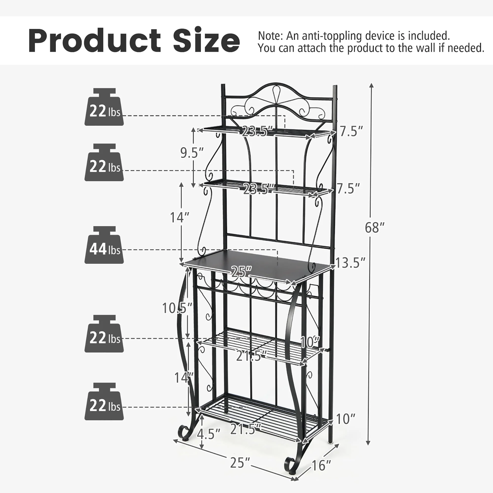 Weight Capacity of Each Metal Shelf: 22 lbs