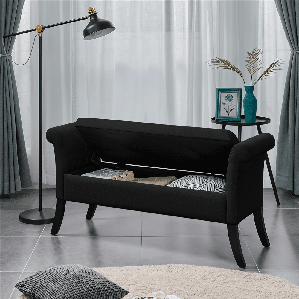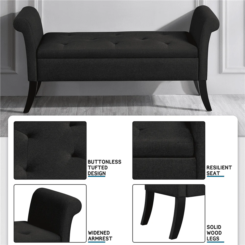 Get yourself a versatile ottoman bench to help you out with seasonal accessories, blankets, books, and pillows. This functional storage bench will make you enjoy the moment spent at home. Crafted out of sturdy and durable MDF boards and pine wood legs, this bench is of excellent weight capacity. The skin-friendly breathable fabric is long-wearing and soft to touch, and the high-density foam serves elastic and firm to sit on. The hidden storage space is spacious that is perfect for limited space. This storage bench can be used in entryway or living room as a bench, sofa or ottoman, all up to you!