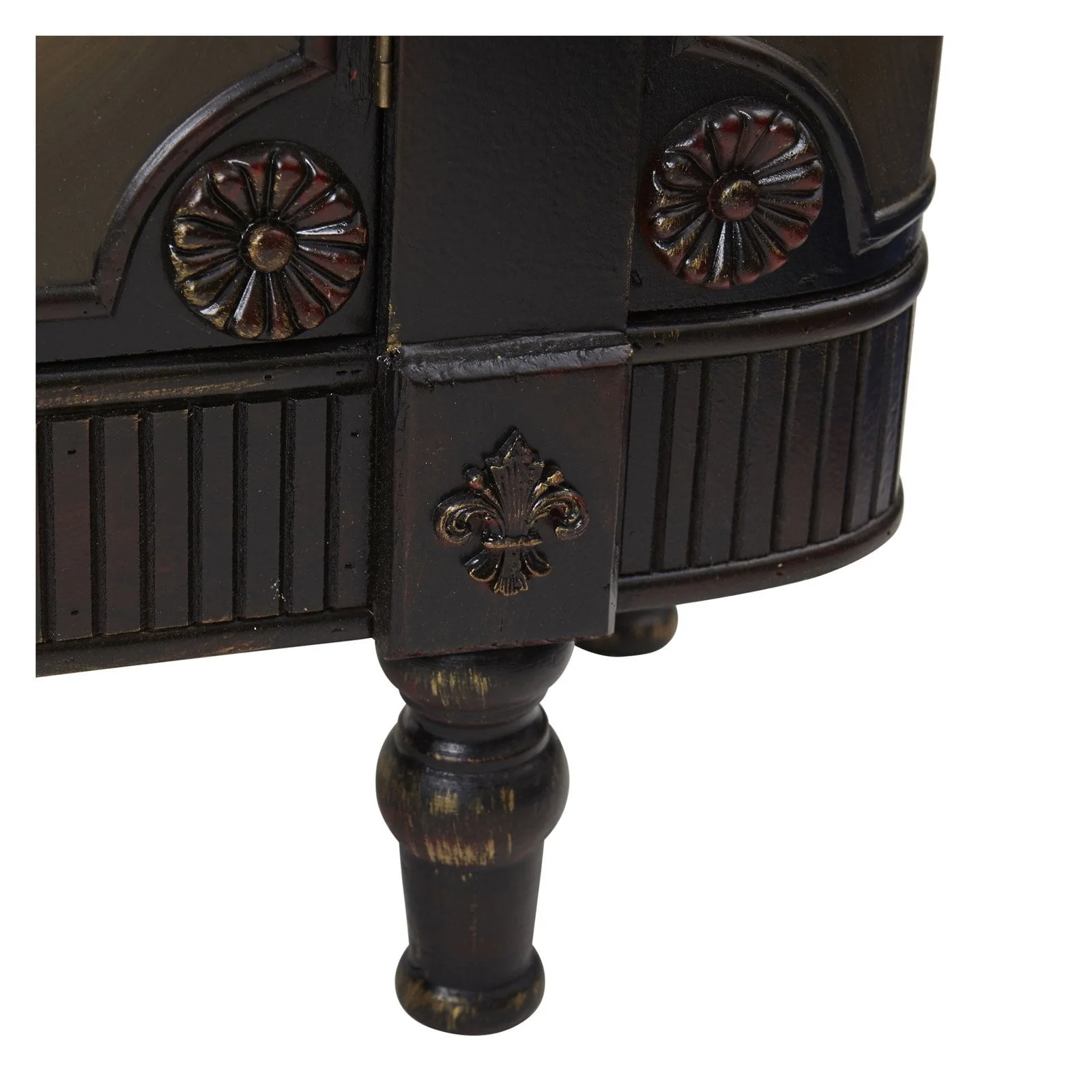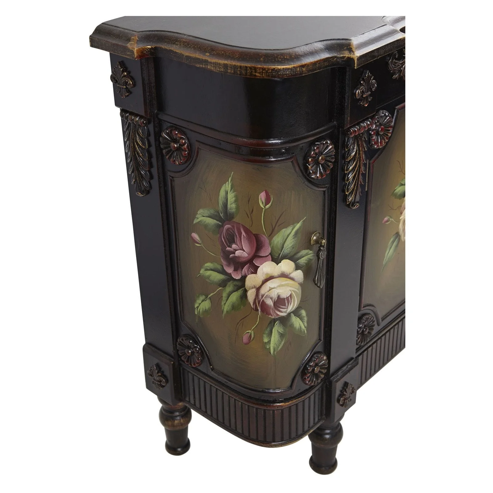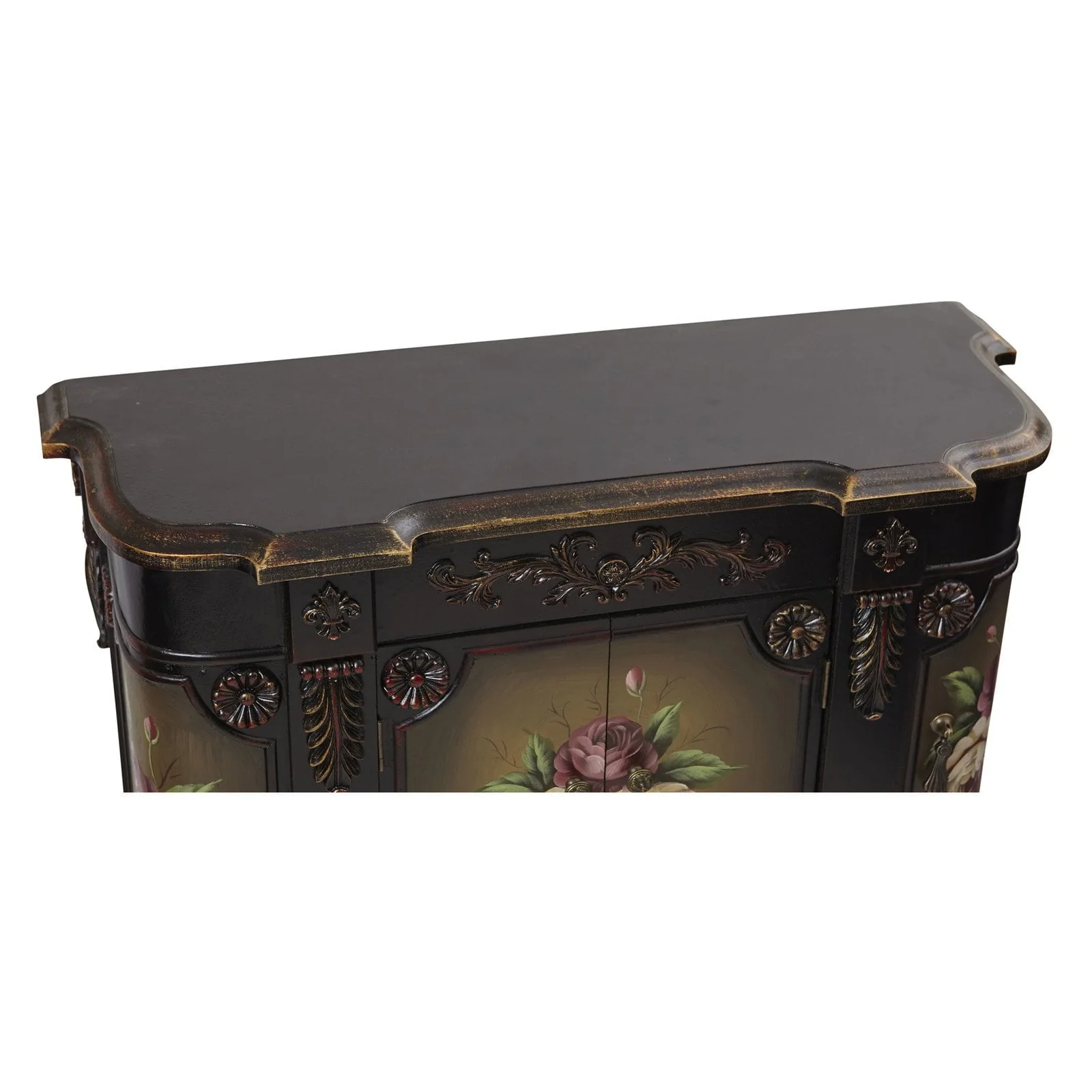 Finished in a rich brown, this vintage style floor cabinet measures 28” tall and 31.25” wide, making it the perfect storage solution for extra household items. Mount a sunburst mirror and display books, clocks or lavender for a French-inspired vignette in the hallway. The four-door cabinet can also store china and silverware for a traditional, elegant style dining room. A glossy finish and subtle gold accents highlight the ornamental designs and intricate crown molding on the cabinet’s doors. Each door features a dusty pink peony motif.