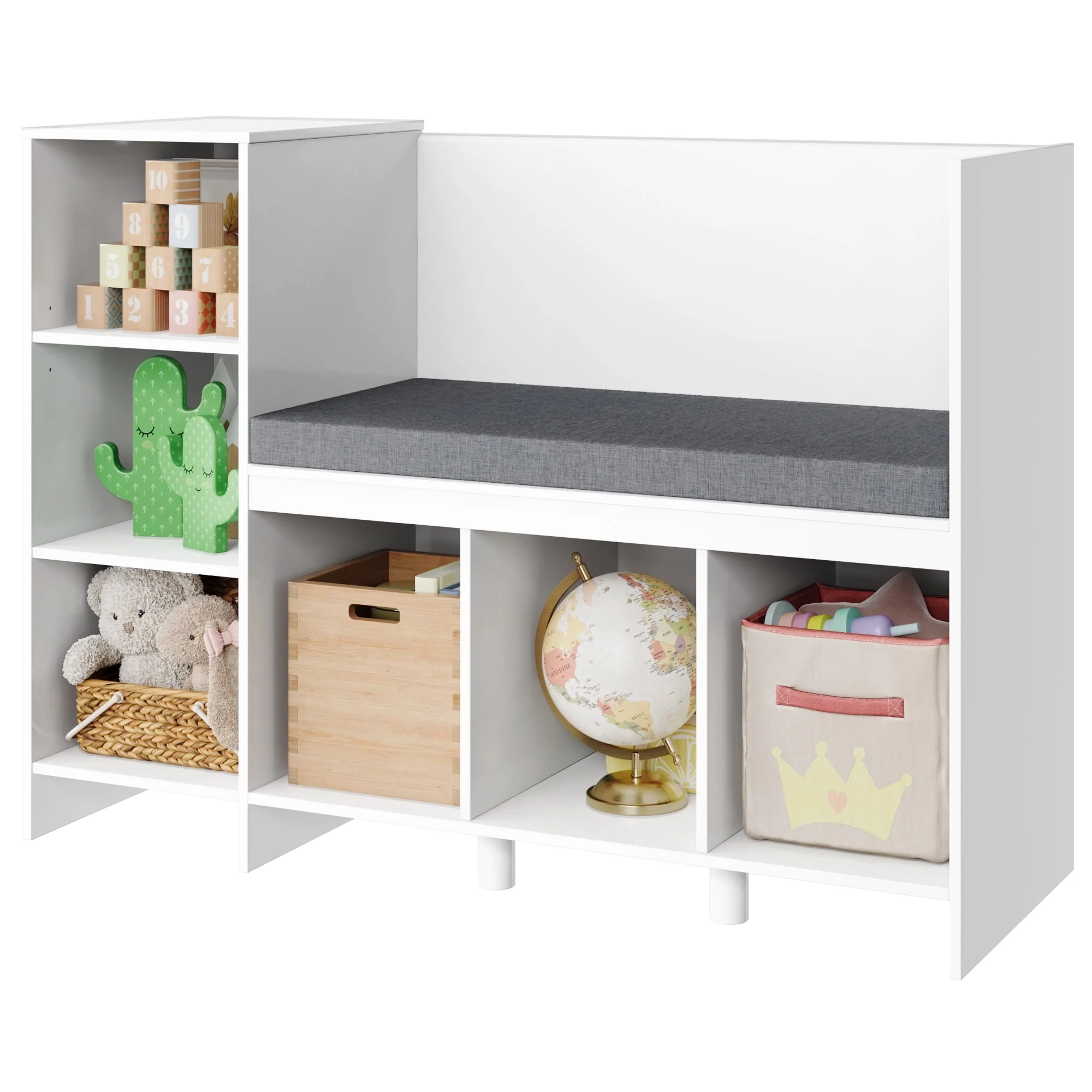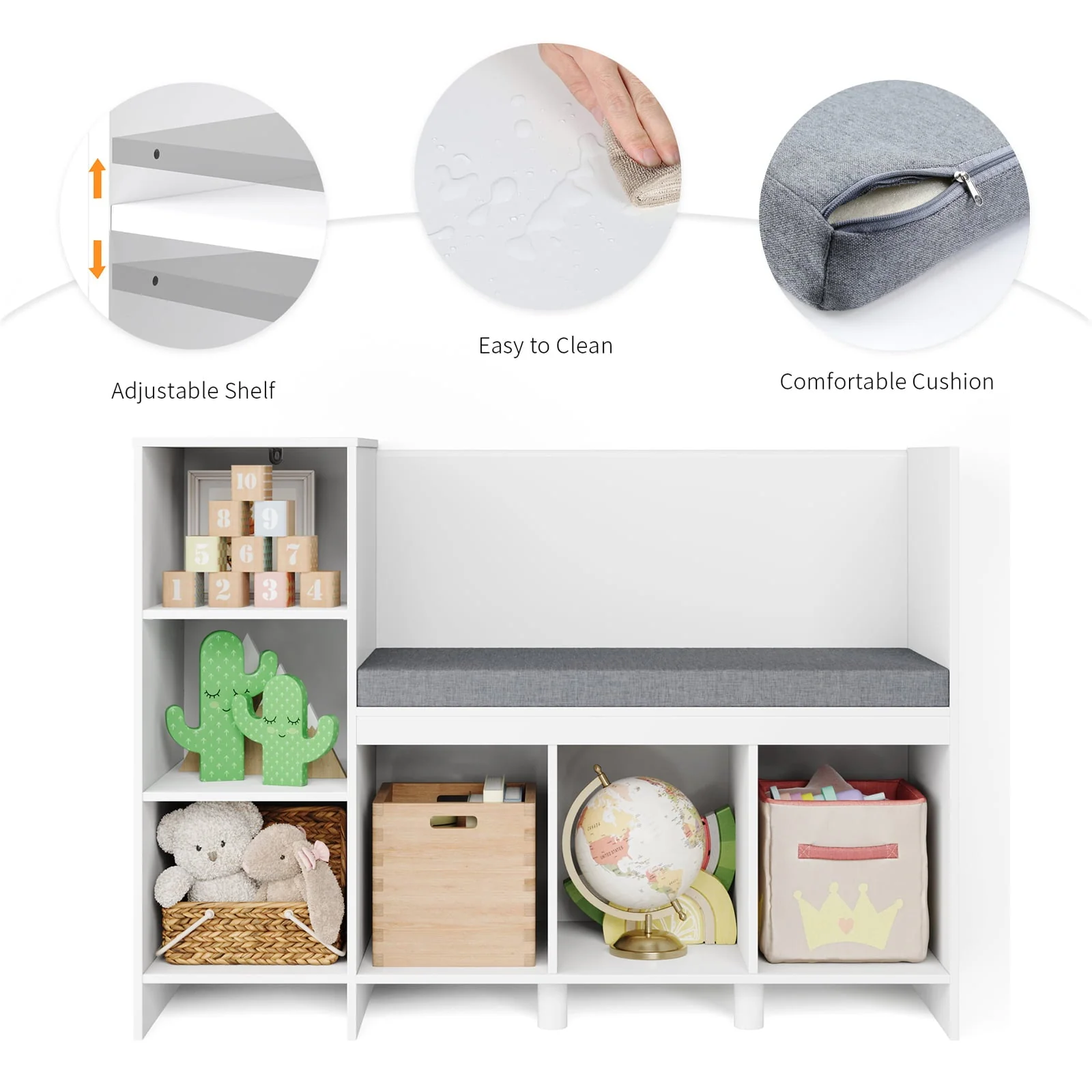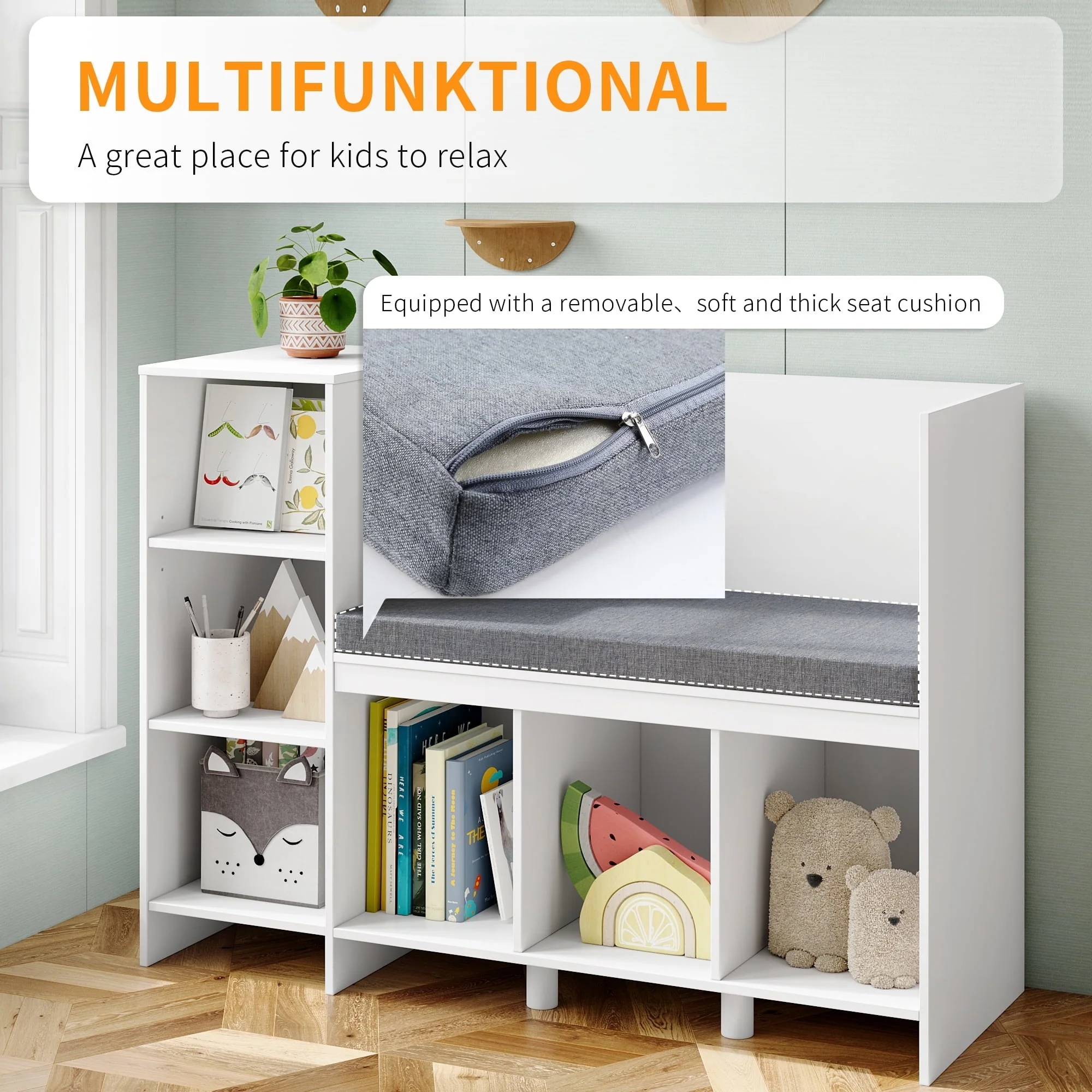 Kids, curl up with a favorite book and always have a cozy spot for story time with this multifunctional furniture piece! This children's storage rack has 6 storage compartments, of which the first storage compartment shelf on the left can be adjusted. There is enough space for books, blankets, stuffed animals, and more. The removable upholstery is comfortable and easy to clean. Made from safe and durable materials, this combination bookshelf and cubby is the perfect reading corner that any child will love. This charming piece of furniture looks great in any room and is the perfect storage and reading bench for young readers.