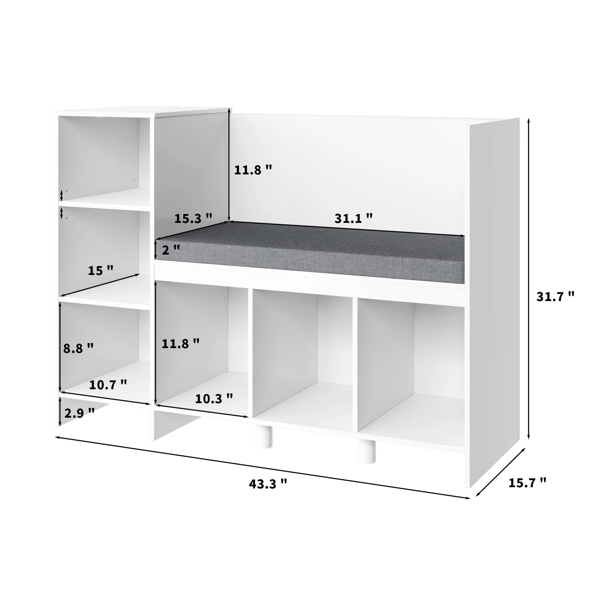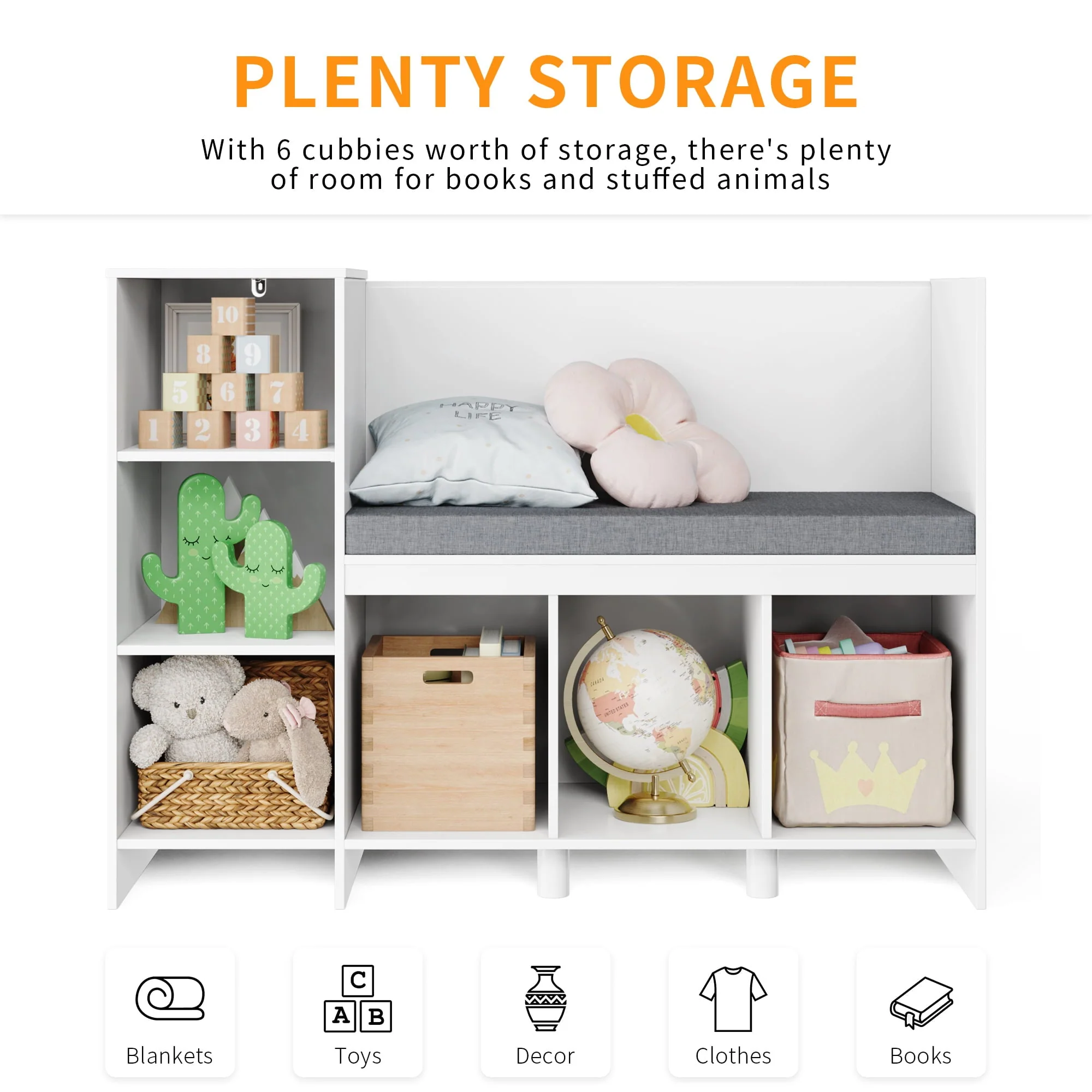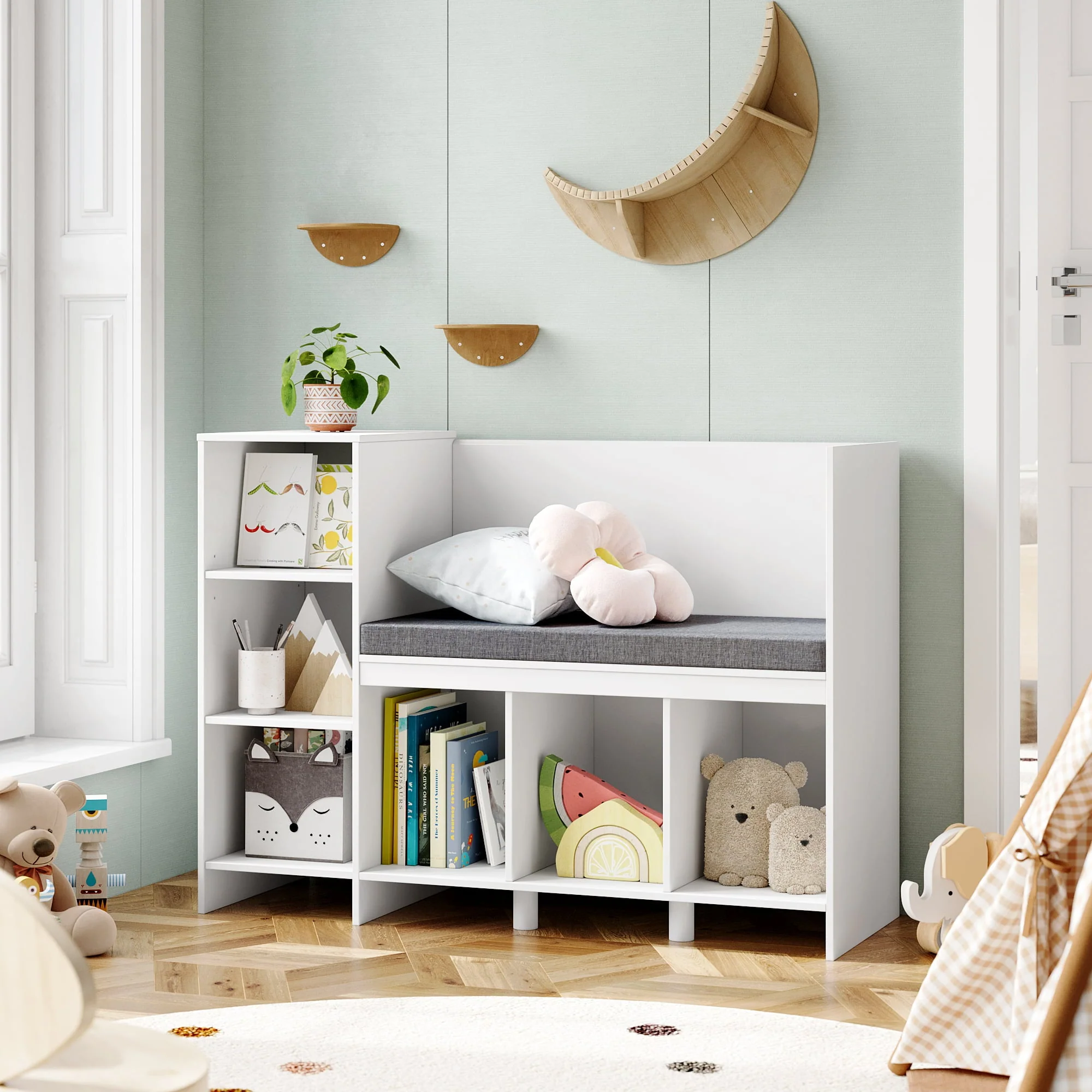 Kids, curl up with a favorite book and always have a cozy spot for story time with this multifunctional furniture piece! This children's storage rack has 6 storage compartments, of which the first storage compartment shelf on the left can be adjusted. There is enough space for books, blankets, stuffed animals, and more. The removable upholstery is comfortable and easy to clean. Made from safe and durable materials, this combination bookshelf and cubby is the perfect reading corner that any child will love. This charming piece of furniture looks great in any room and is the perfect storage and reading bench for young readers.