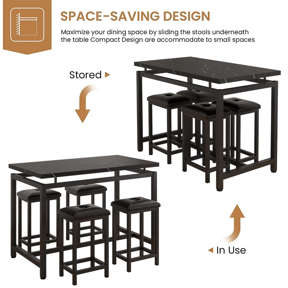 This dining set is very compact to takes up little space for storage. You can place them neatly under the table when not in use. The bar stools and the table can be perfectly integrated to save more space for you, which is ideal for small rooms.