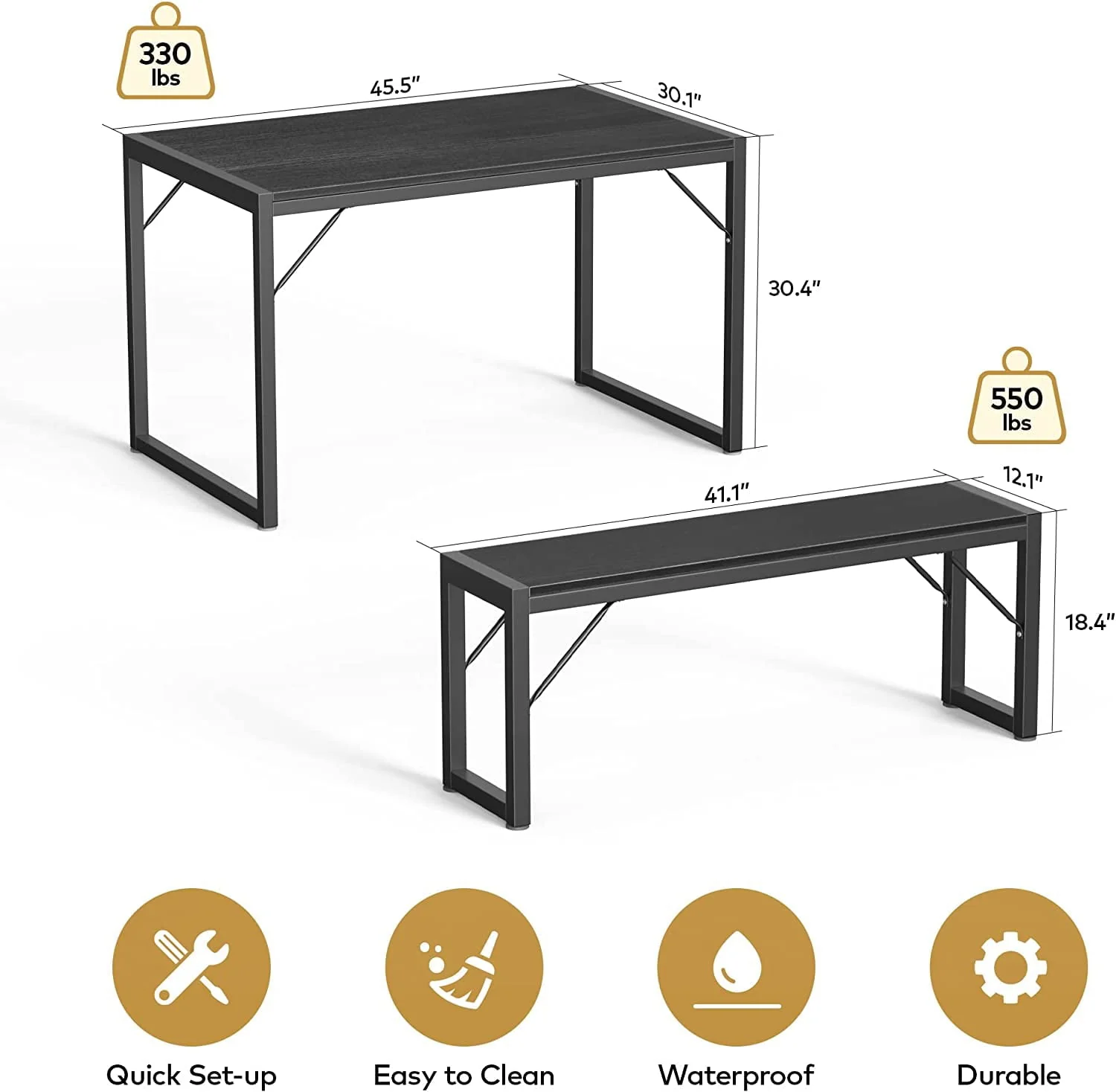 This black dining room table and chairs set is made of a combination of high quality steel frame and sturdy MDF table-top plate. The stable triangle structure between each shelf provides you with strong support and is very safe. Table: 330lbs; Bench (per): 550lbs