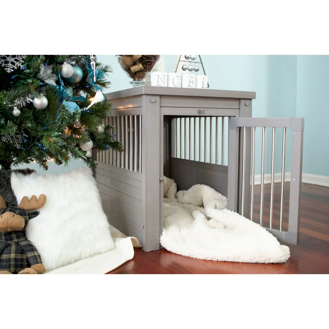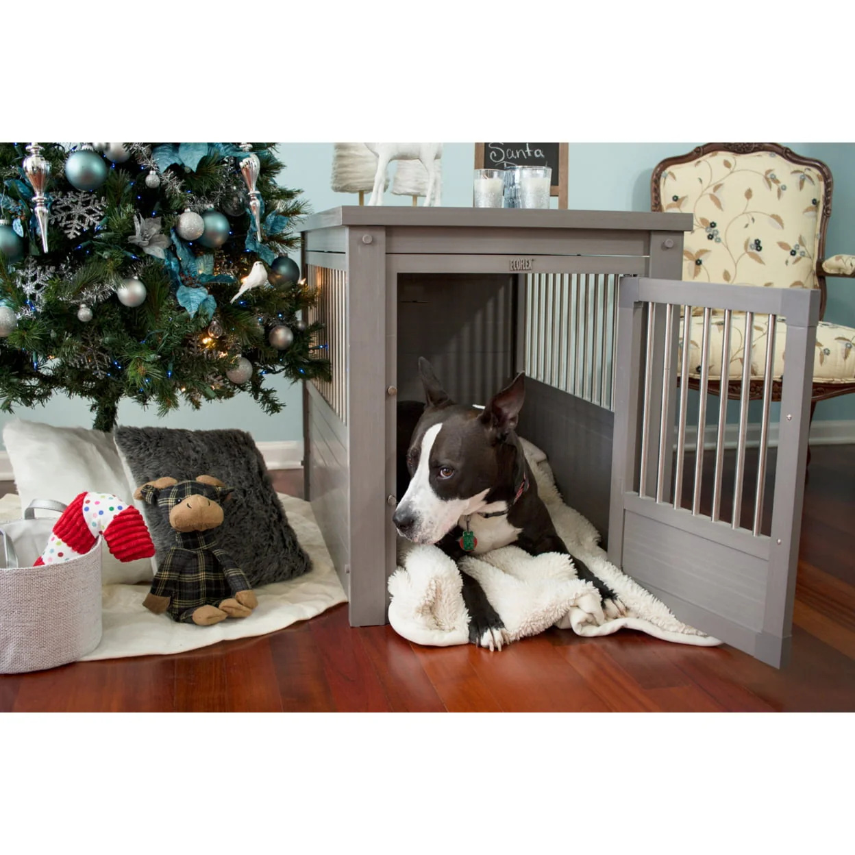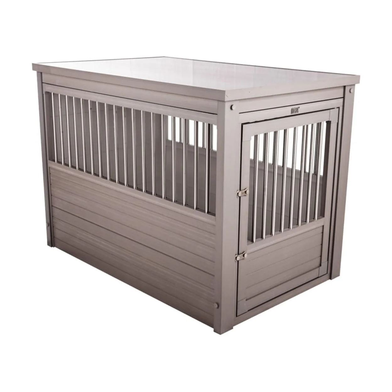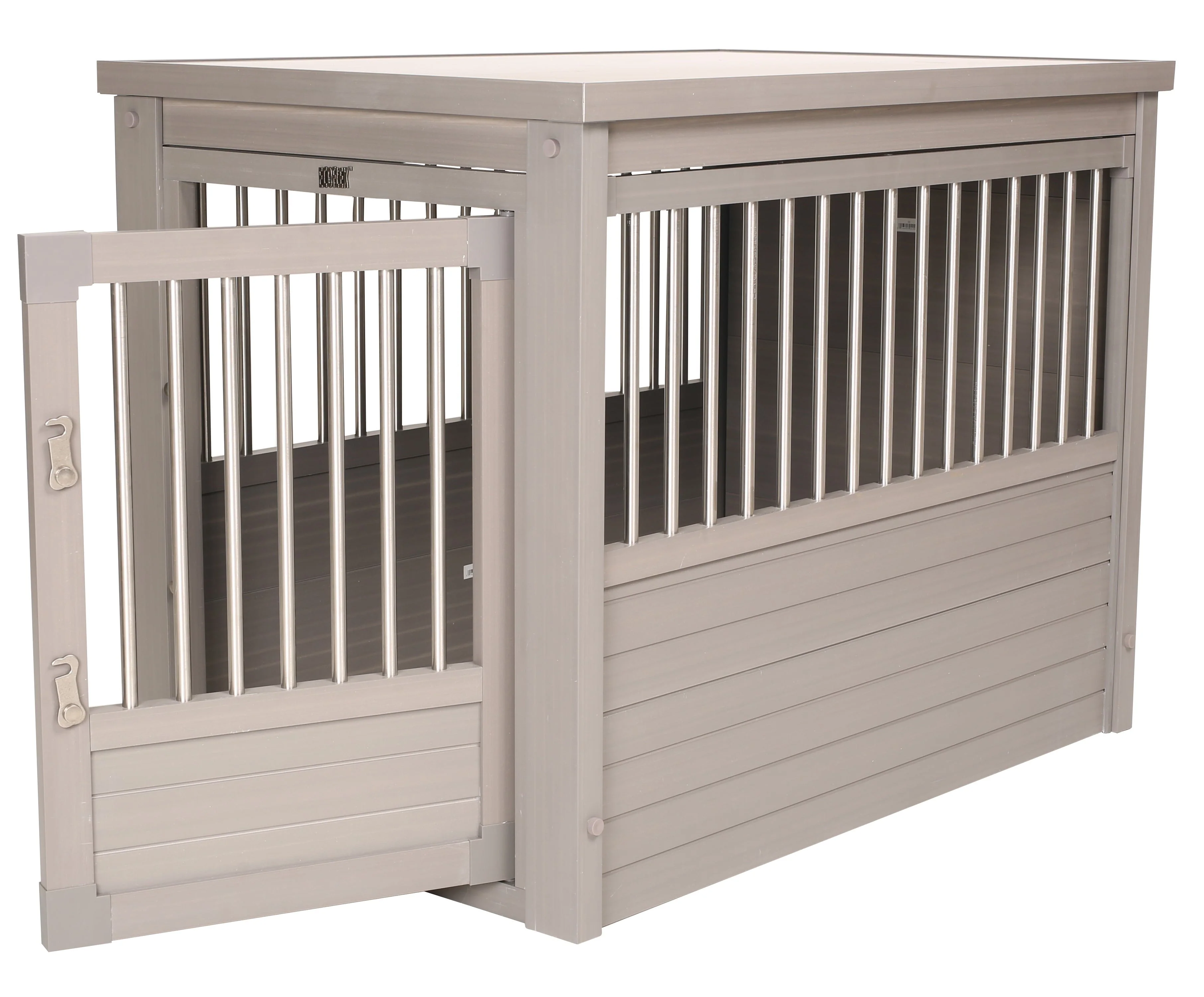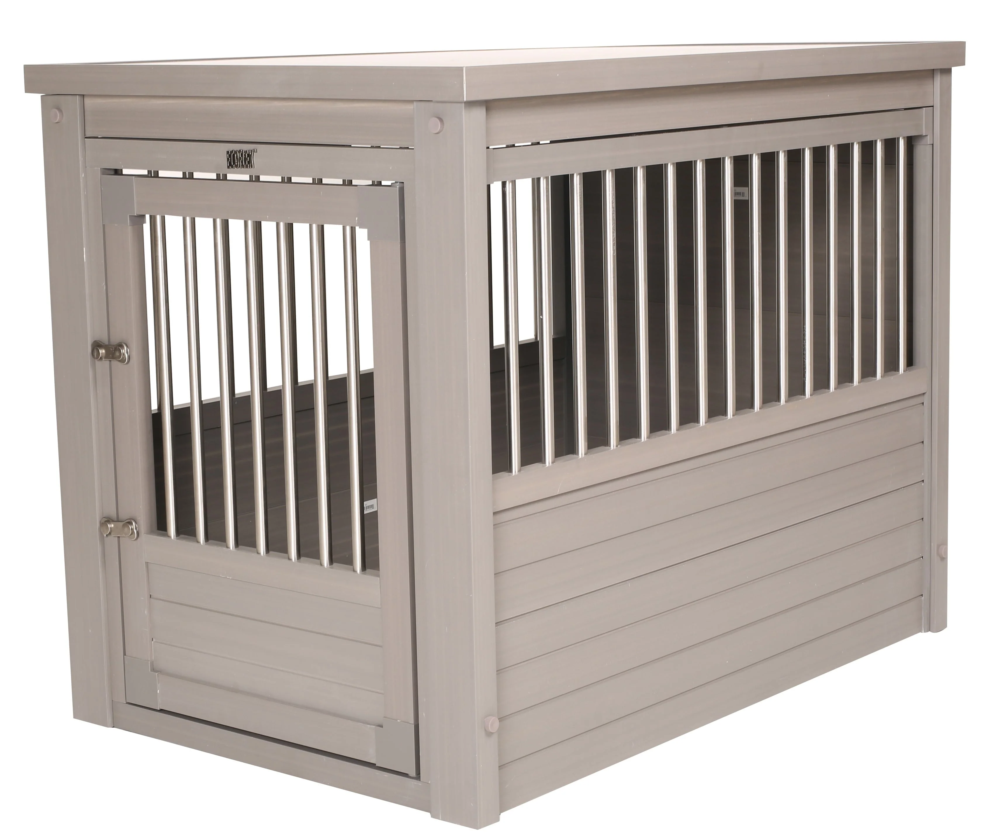 This ECOFLEX Dog Crate End Table is the perfect place for your pet when they are indoors. This ECOFLEX Crate End Table can easily do double duty in many houses where it can serve as an end table in the family room, bedroom or living room. Made of ECOFLEX material. ECOFLEX is a proprietary formula that incorporates reclaimed wood and plastic into the material that allows the product to be eco-friendly and a great value as it will outlast most other products. Can be painted to coordinate with your other furnishings and inspire your pet style. Removable tabletop for easy cleaning. Color will never fade. Front door latches securely and cannot be accidentally opened. Small and Medium crates have one secure latch. Large and Extra-Large crates have two secure latches. Crates are made for dogs that are familiar with crates and are less likely to chew. Spindles made of stainless-steel tubing. Please note that any crate that isn’t 100% wire or metal could be chewed. This ECOFLEX Dog Crate melds form and function into a crate that can double as a piece of your home décor. Available in four sizes. Small for dogs up to 20 lbs. Medium for dogs up to 50 lbs. Large for dogs up to 80 lbs. Extra-Large for dogs up to 100 lbs. This product may not be a good fit for dogs that suffer from anxiety. Small Dimensions: Exterior 23.8" L x 18.2" W x 22.2" H Interior 21" L x 15.4" W x 18" H Medium Dimensions: Exterior 29.5" L x 21.1" W x 25.2" H Interior: 26.8" L x 17.7" W x 20.9" H Large Dimensions: Exterior 35.9" L x 23.7" W x 28" H Interior 33.2" L x 21.3" W x 23.7" H Extra Large Dimensions: Exterior 42.6" L x 27.6" W x 30.9" H Interior 39.8" L x 24.6" W x 29.1" H