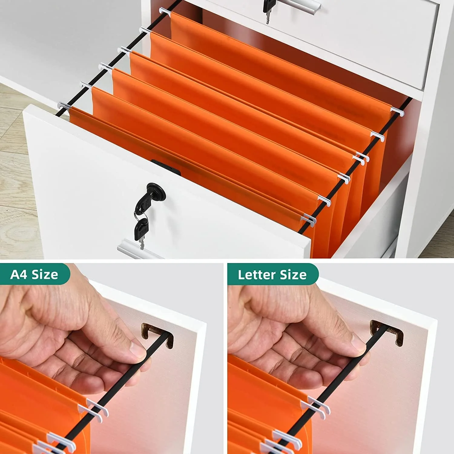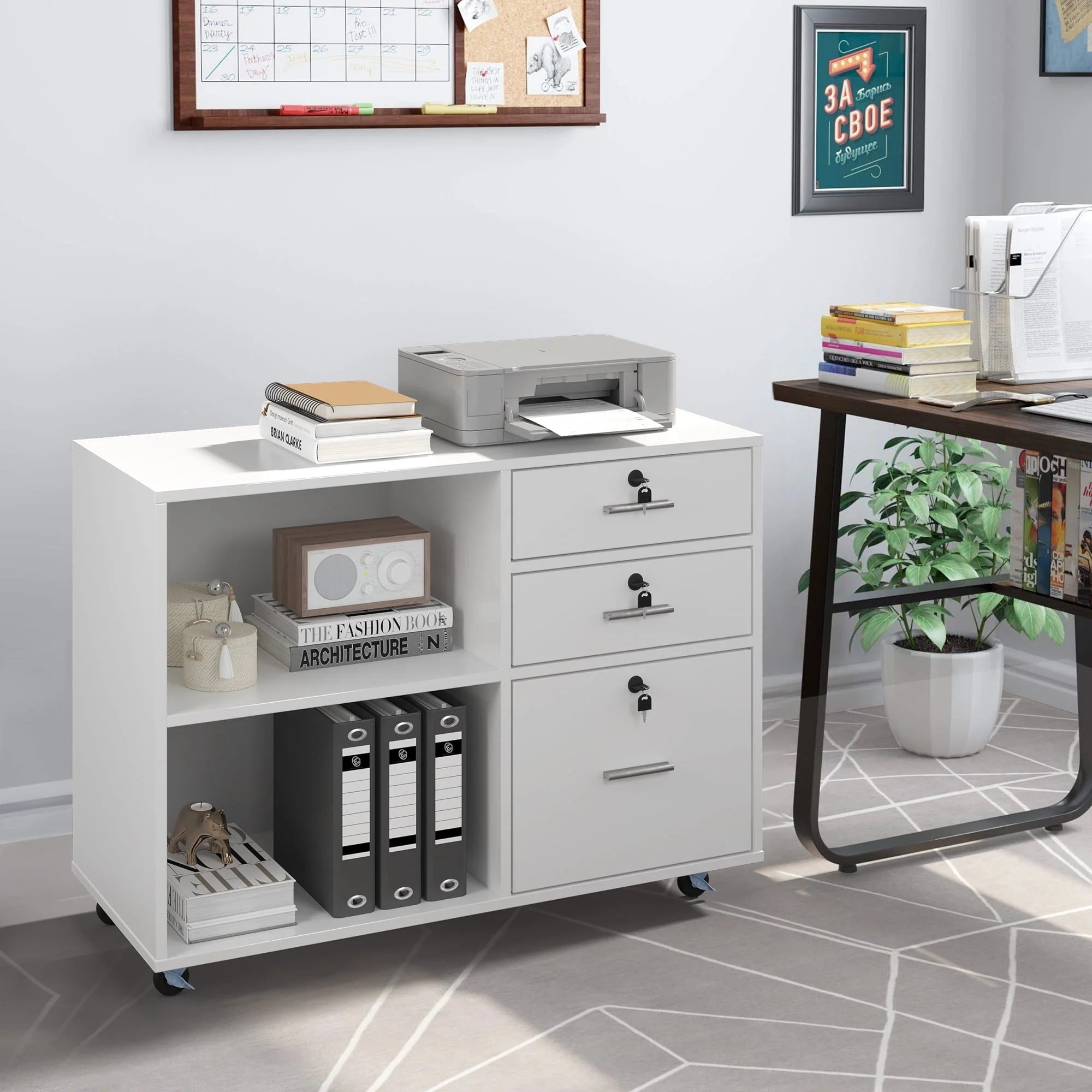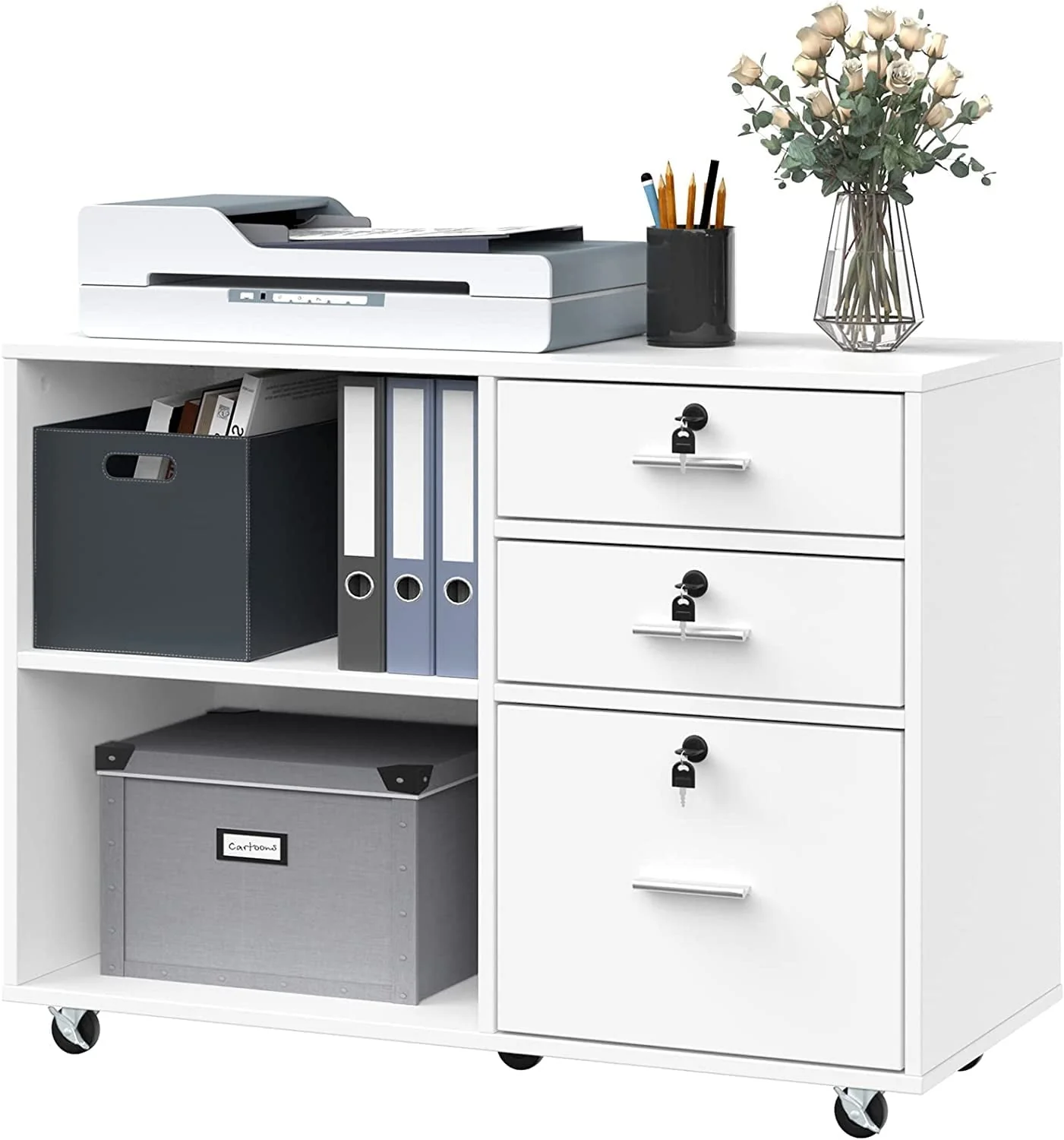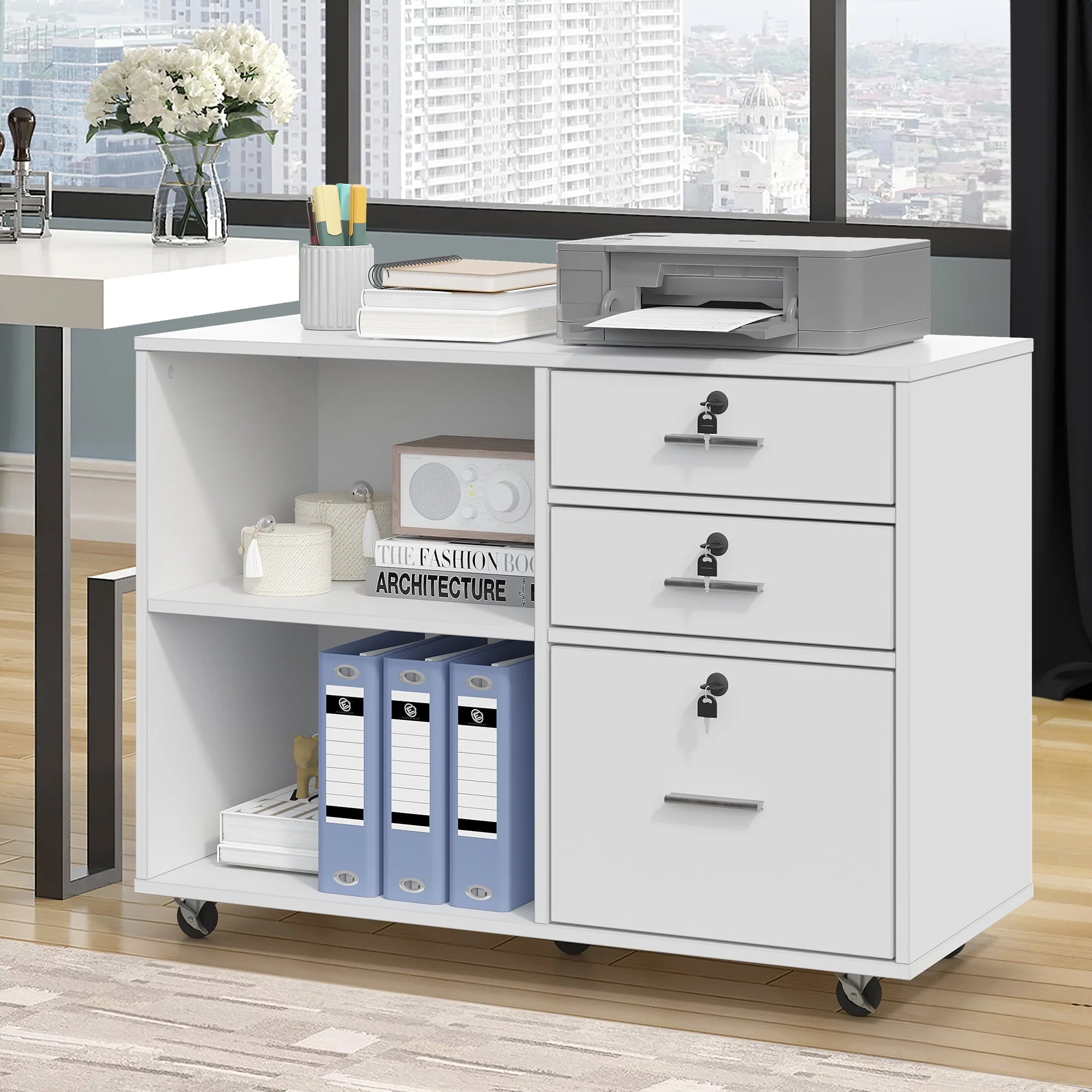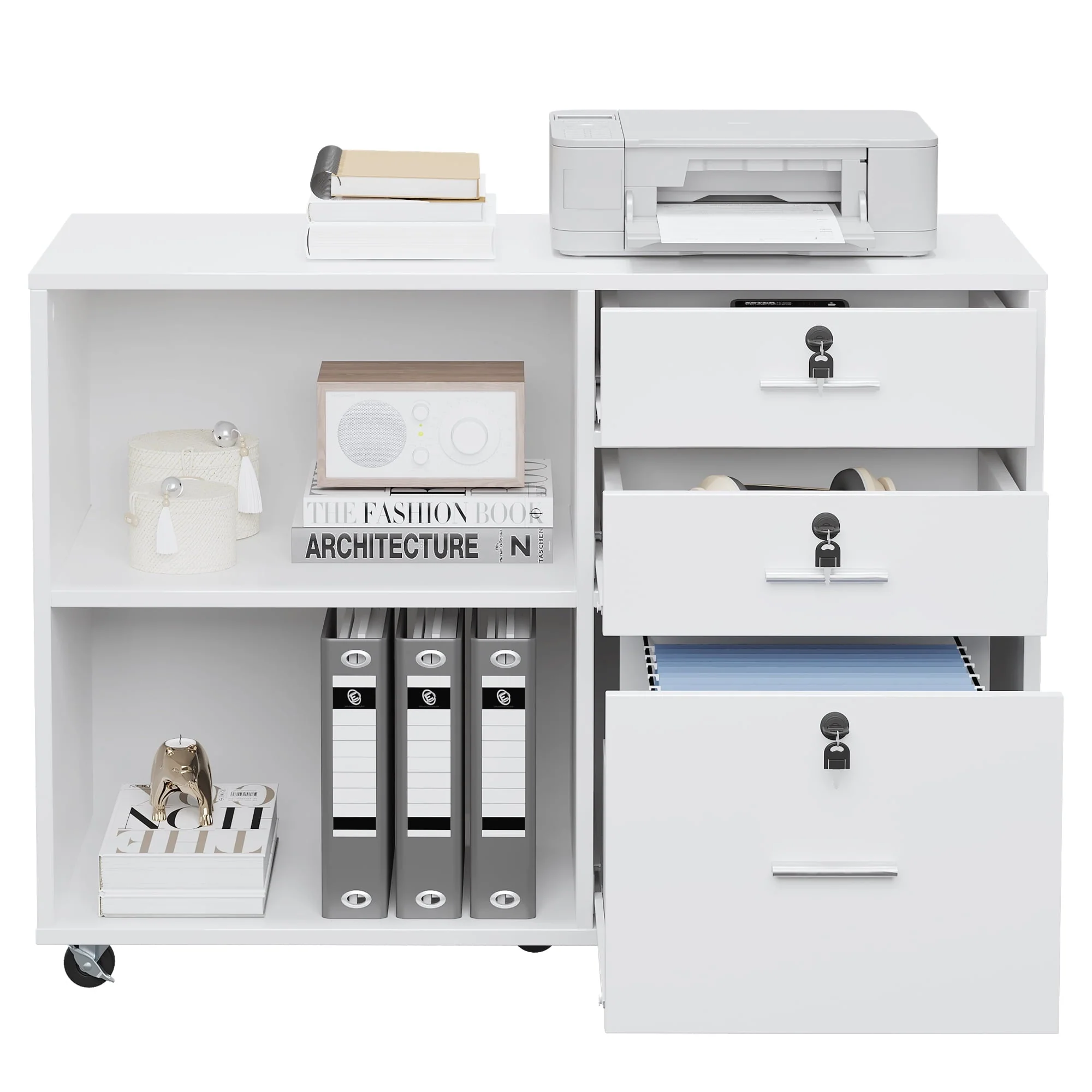 • DEXTRUS 3 Drawer Wood Lateral Filing Cabinet with Locks, Printer Stand Storage File Cabinet with Shelves for Home Office, White