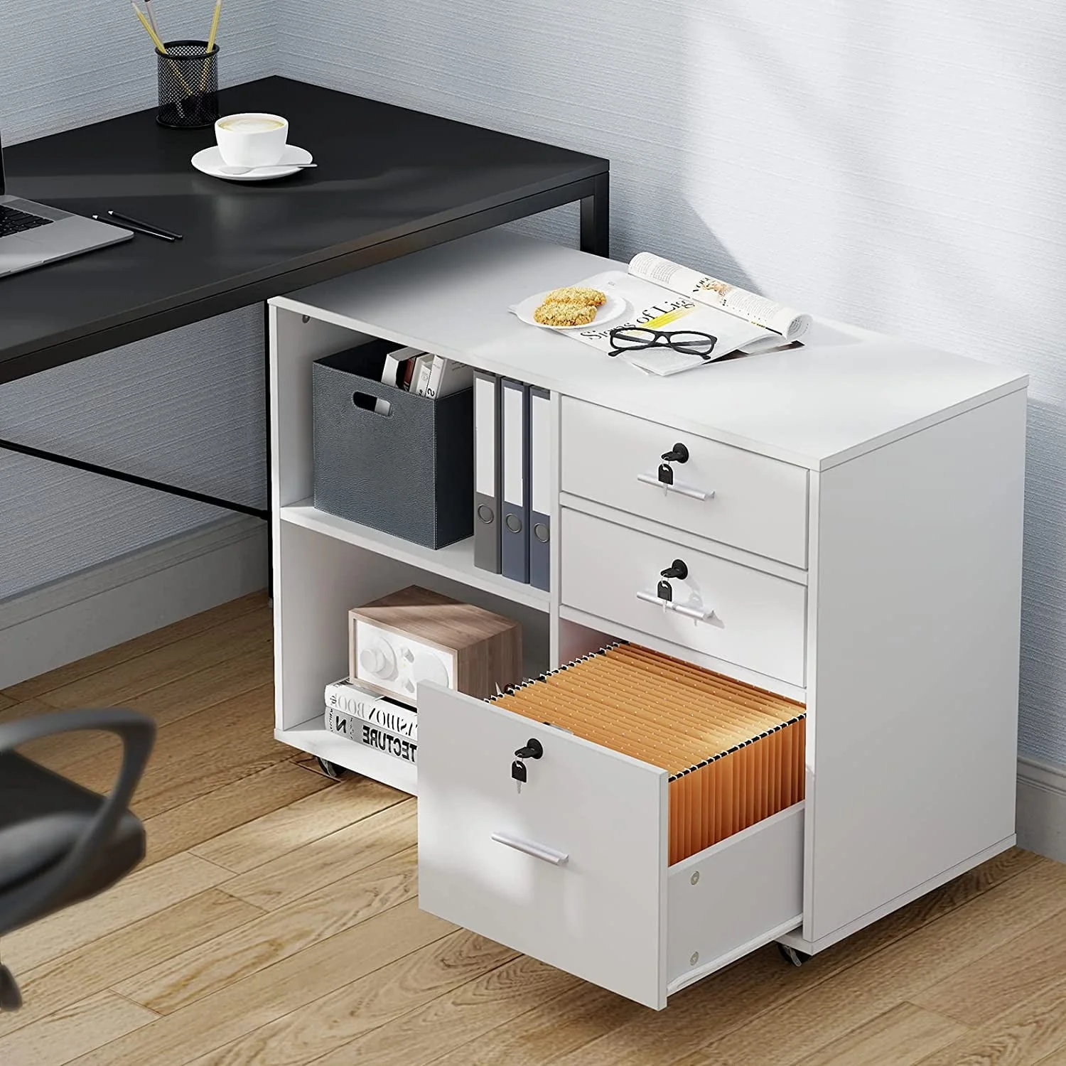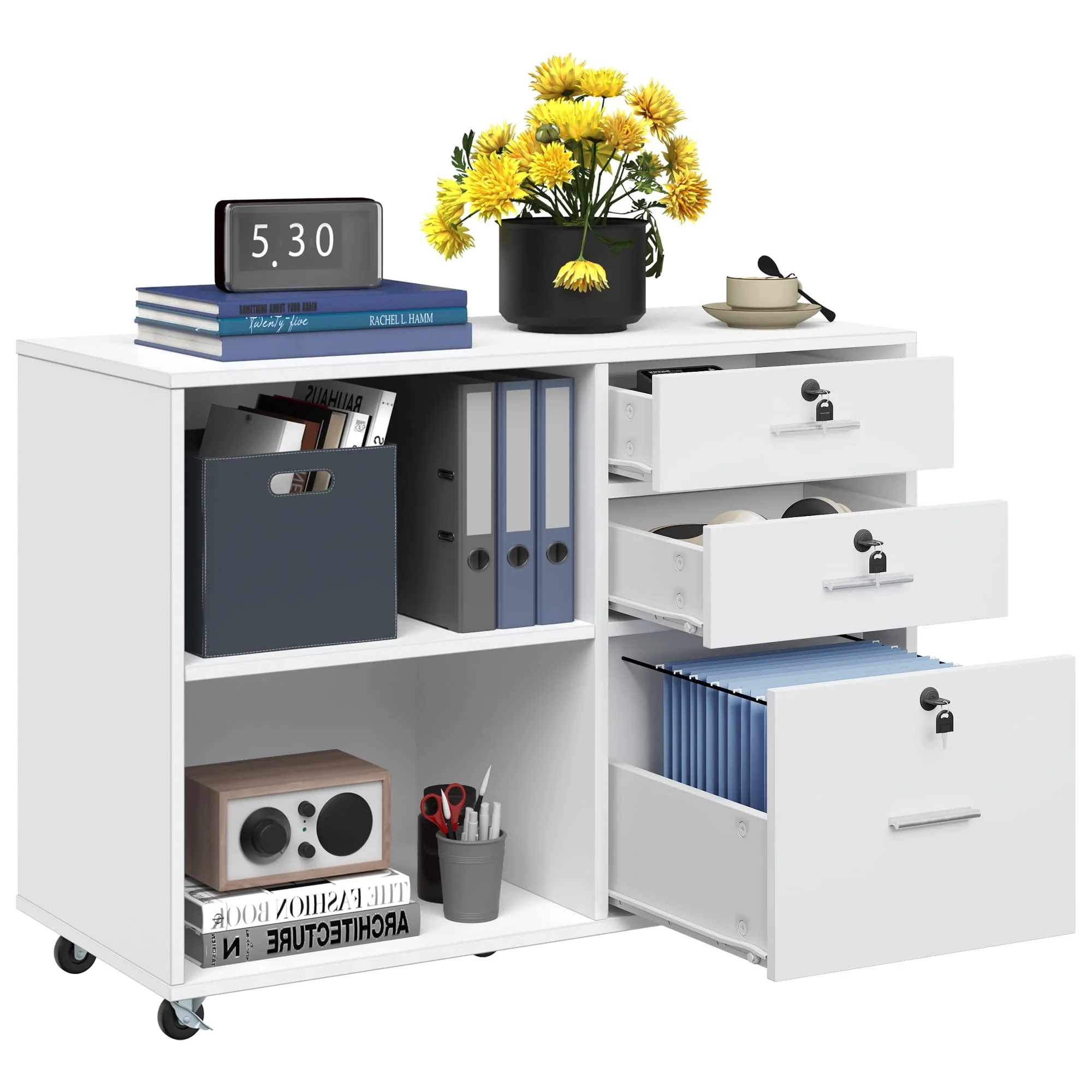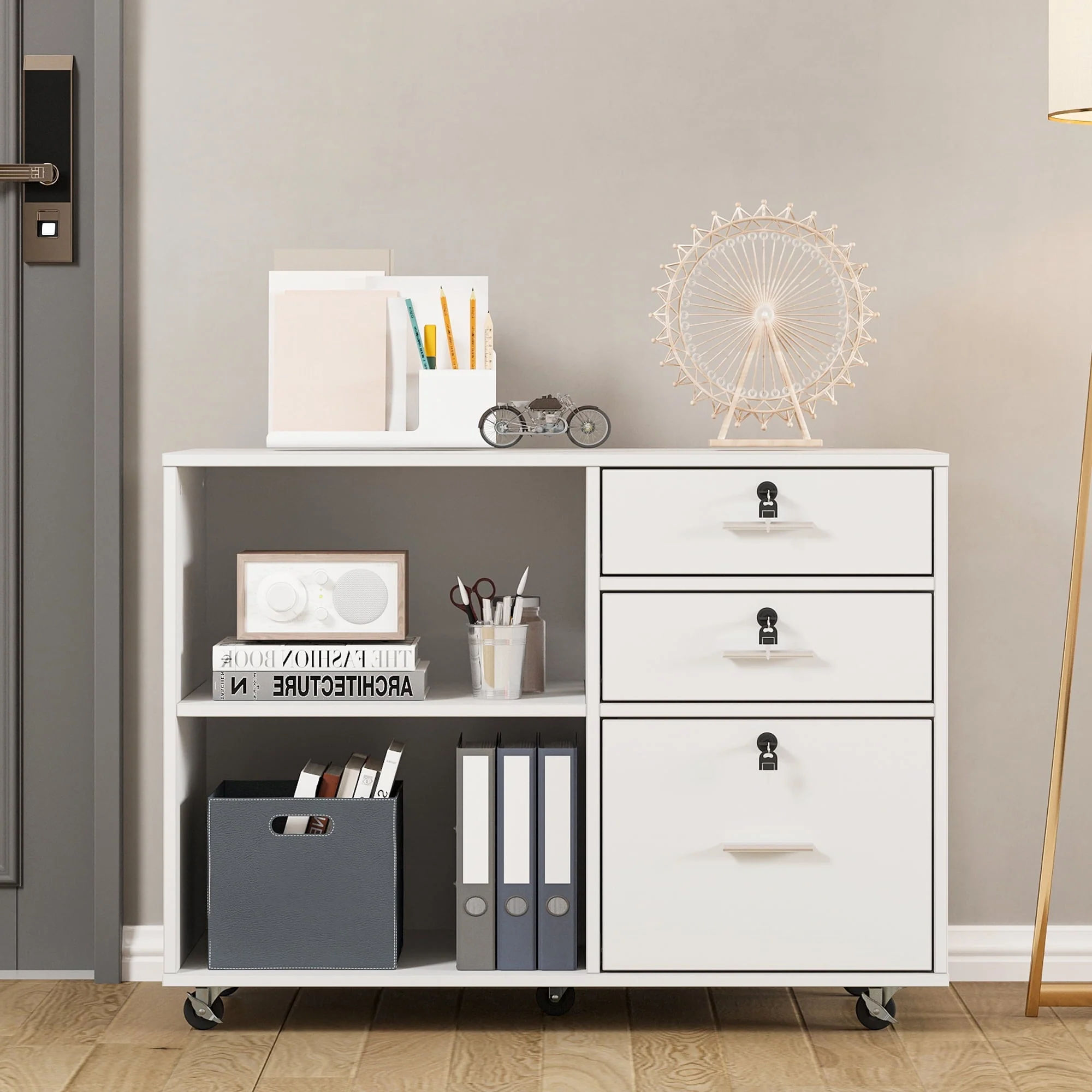 This 35” wide Wood File Cabinet offers plenty of out-of-sight storage as well as a roomy top that works as an extension of your desk. It is a 3 Drawer Mobile Lateral Filing Cabinet made from engineered wood with a neutral finish, and it sits on five casters, so it’s easily mobile across most surfaces. The three lockable drawers open and close on ball bearing glides for smooth operation, providing secure storage options. The lower drawer is fitted with an adjustable bar for hanging folders, making it a versatile Filing Cabinet with Locks. What’s more, the two open shelves are ideal for books and stacks of paperwork, offering additional storage space. Top with your printer/scanner or decor to lend some ambiance to your workspace. Full assembly is required.