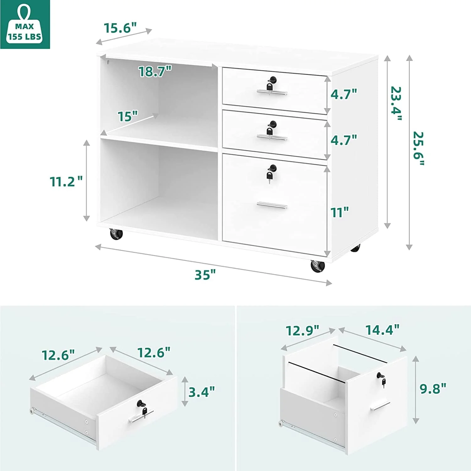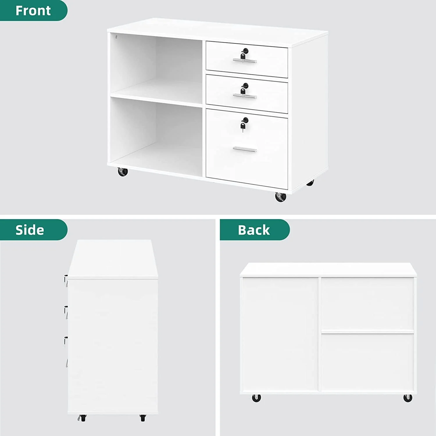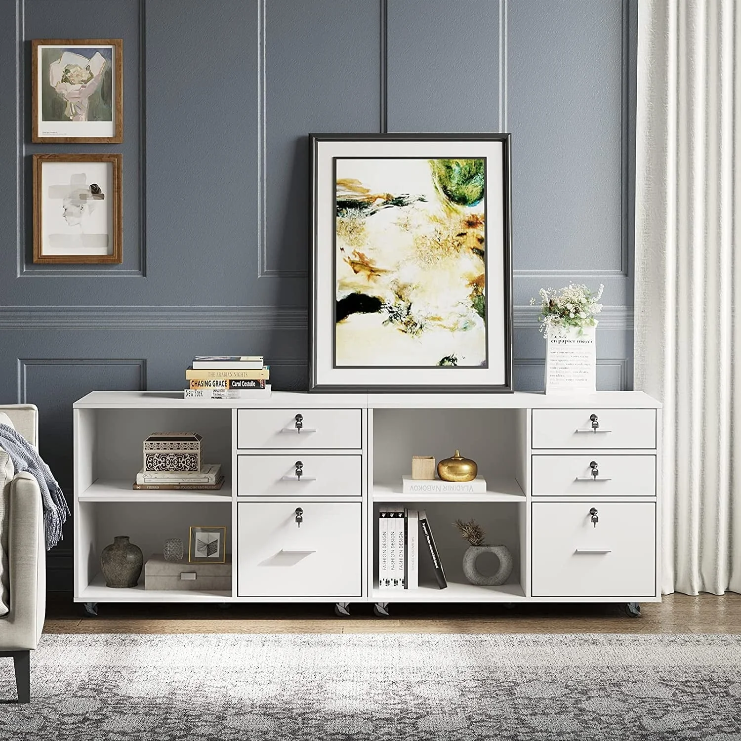 This 35” wide Wood File Cabinet offers plenty of out-of-sight storage as well as a roomy top that works as an extension of your desk. It is a 3 Drawer Mobile Lateral Filing Cabinet made from engineered wood with a neutral finish, and it sits on five casters, so it’s easily mobile across most surfaces. The three lockable drawers open and close on ball bearing glides for smooth operation, providing secure storage options. The lower drawer is fitted with an adjustable bar for hanging folders, making it a versatile Filing Cabinet with Locks. What’s more, the two open shelves are ideal for books and stacks of paperwork, offering additional storage space. Top with your printer/scanner or decor to lend some ambiance to your workspace. Full assembly is required.
