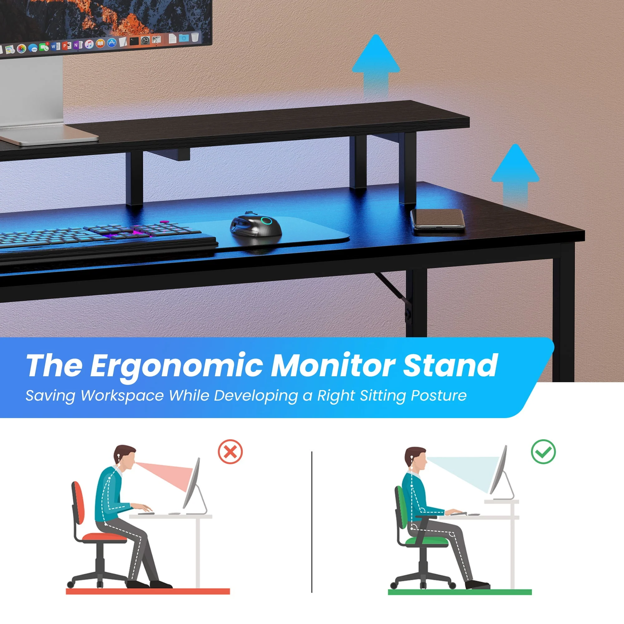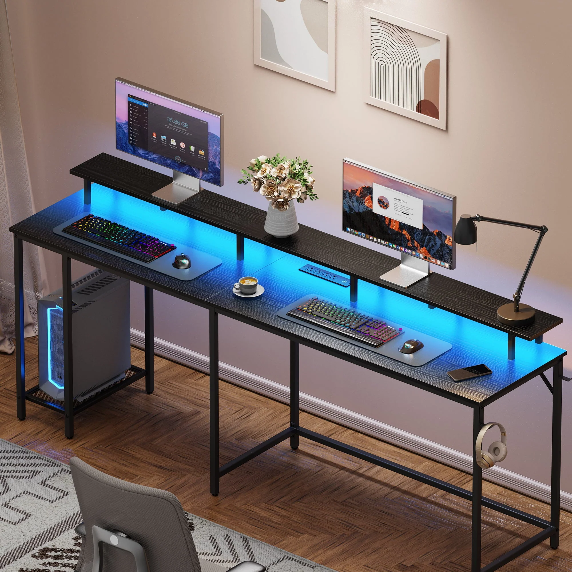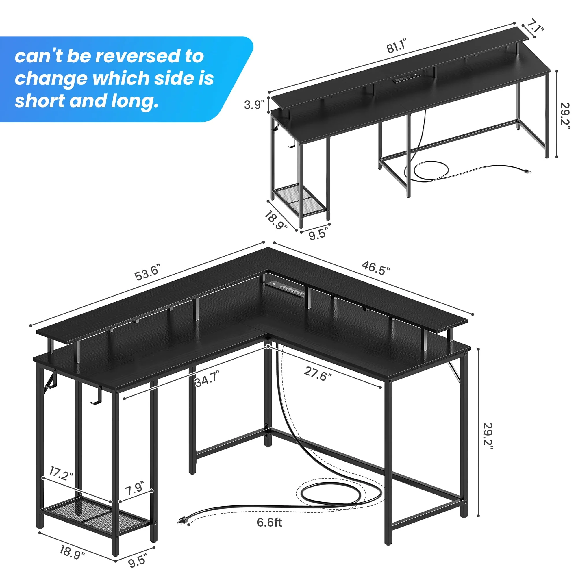 Invite a new workstation to refresh your home office space, this l shaped gaming desk with led lights comes with cool light strips, and with the convenience of the remote control, you can effortlessly adjust the vibrant LED light strips of this computer desk to match your desired mood. And the spacious desktop not only accommodates various office items like laptops, books, and collectables..., but also is equipped with 4 AC outlets and 2 USB ports on the desktop to facilitate your charging time. The multiple shelves under the long desk add more storage space for your books, files or other office devices, the leg space underneath is also ample for your comfort. Durable particle board and sturdy metal frame of the gaming desk ensure long-time service. Adjustable feet make this L office desk stable on the floor. Plus:All components are numbered, tools are provided and with a clear instruction, assembly can be easy. If you are looking for a new home office desk, look no further and get this gaming desk with storage.