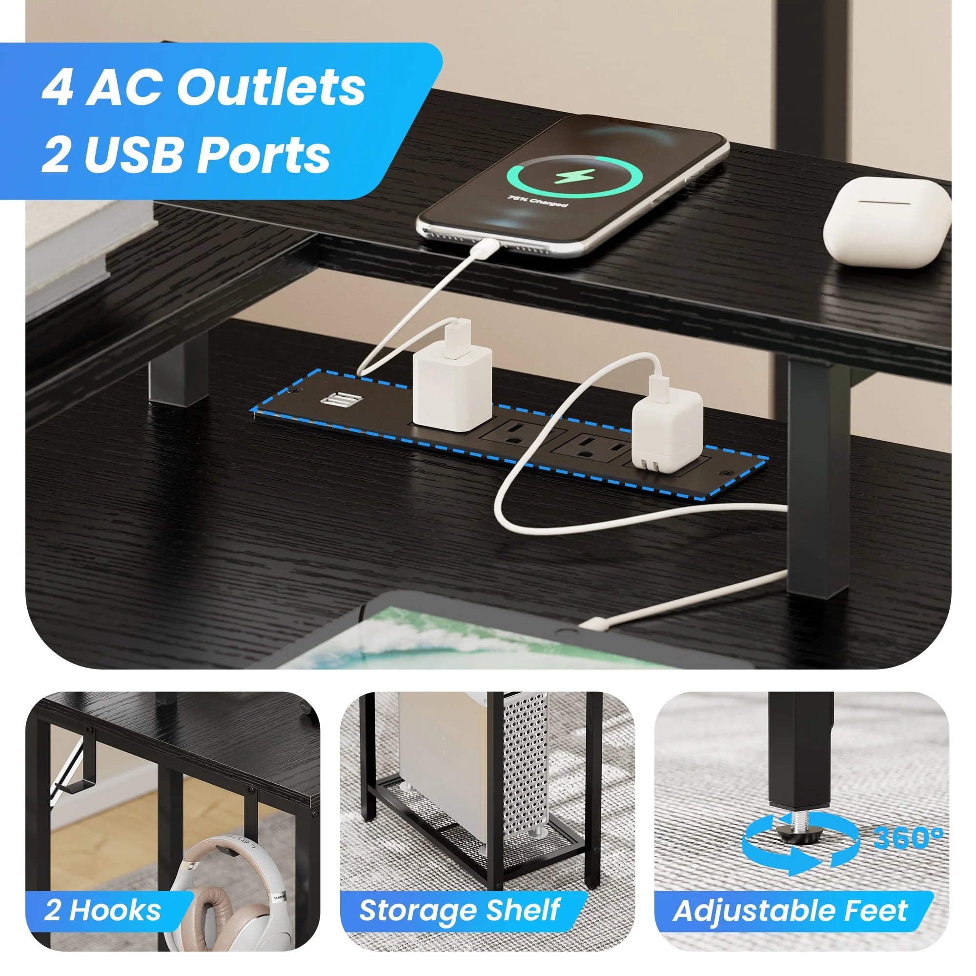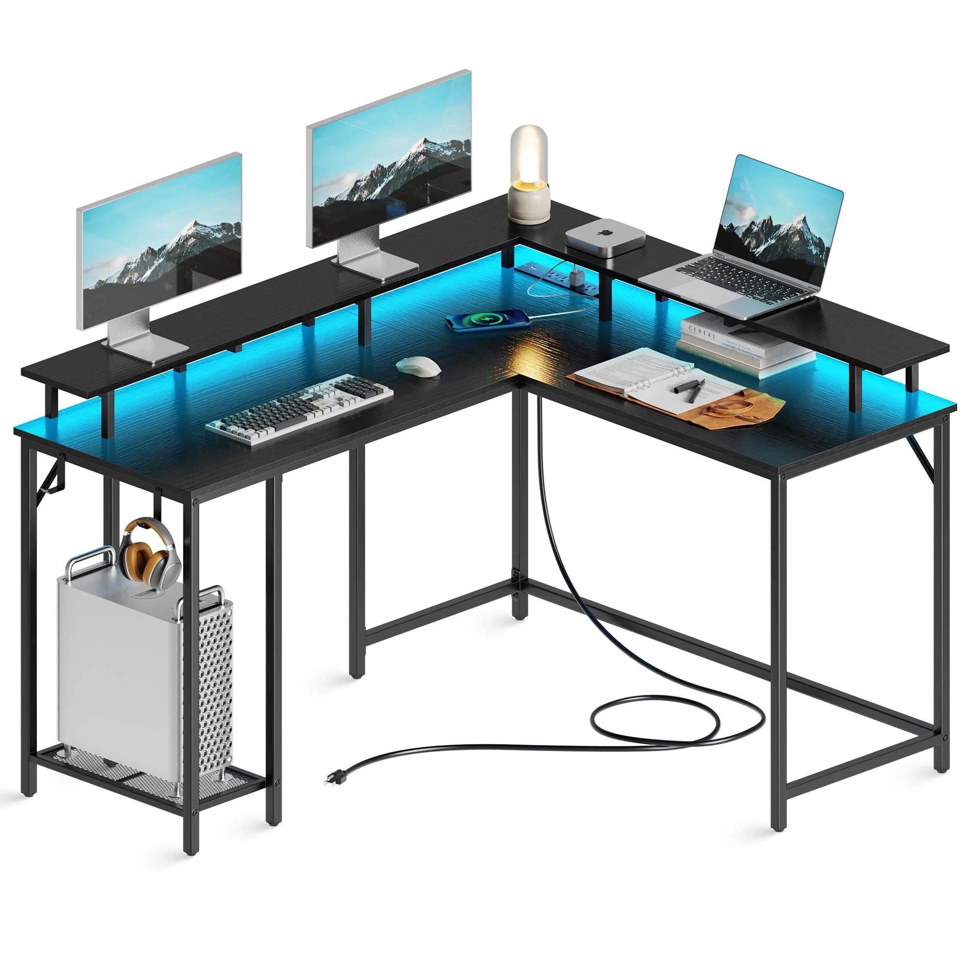 • SUPERJARE L Shaped Desk with Outlets & USB Ports, Computer Desk with LED Light Strip, Corner Gaming Desk, L Office Desk, Monitor Stand, Hooks, and Storage Shelves, Black