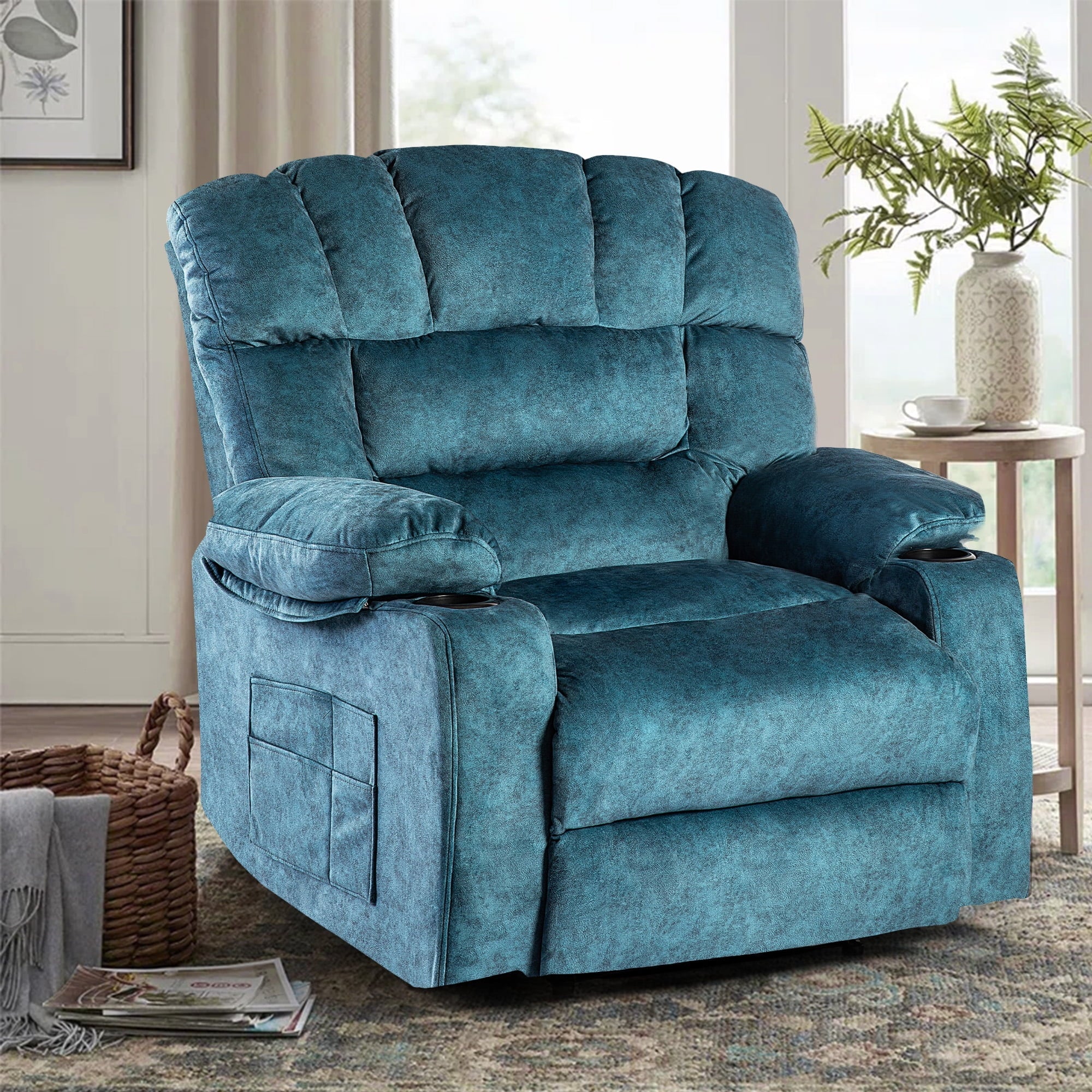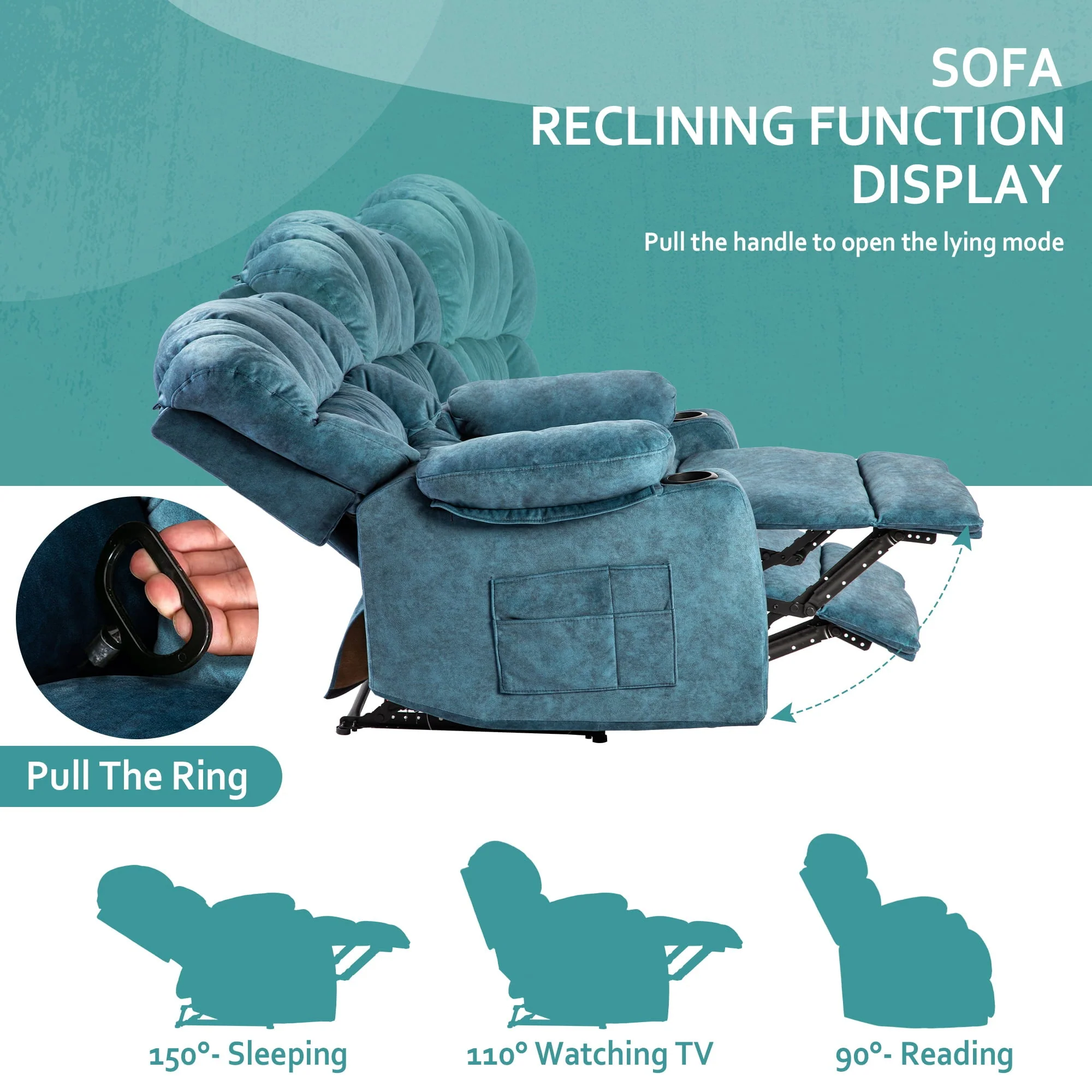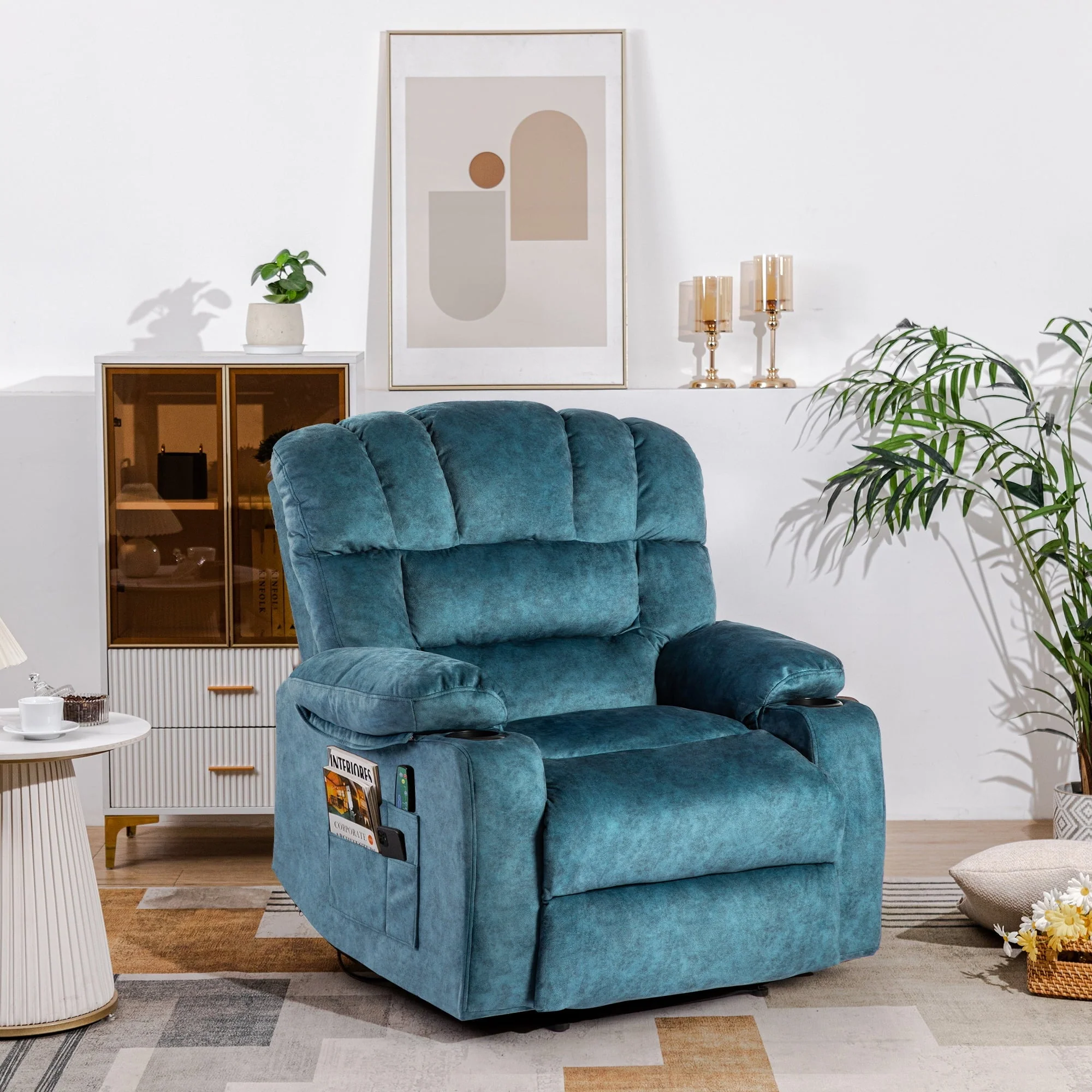 This COLERLINE 40.9" Wide Super Soft and Oversize Modern Design Velvet Upholstered Manual Recliner Chair with Heating and Massage uses breathable and high-quality velvet fabric for upholstery material, which is very easy to take care of and very comfortable to touch. With high-density foam and laminated veneer lumber (LVL) system to provide maximum comfort and stability, this manual recliner chair with two overstuffed pillows on the head and back in different using of reading book, watching TV, chatting and sleeping, provide extreme comfort for your neck, back, and lumbar. This oversize and overstuffed leather recliner is also a good choice for a big man. Featuring an oversized design, it widens seat, spacious back rest and powerful seat allow a capacity of 330 pounds at max. Smoothly reclining mechanism for a great lounging experience, a simple pull to a lever on the side gives a smooth, quiet, and effortless recline as you sit back and relax in style and ultimate comfort. Suitable for the living room, bedroom, and home theater room, clean lines set off a classic and luxurious style of decoration.
