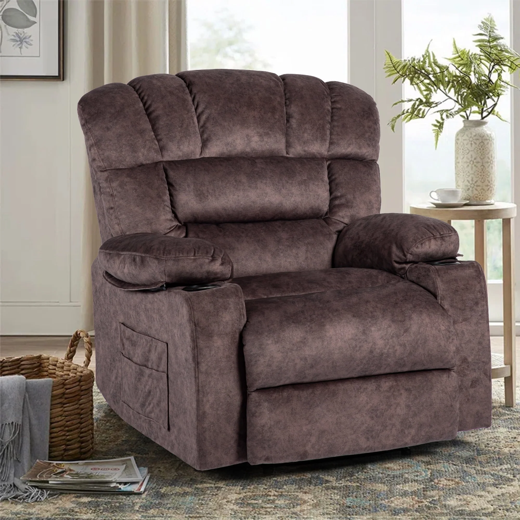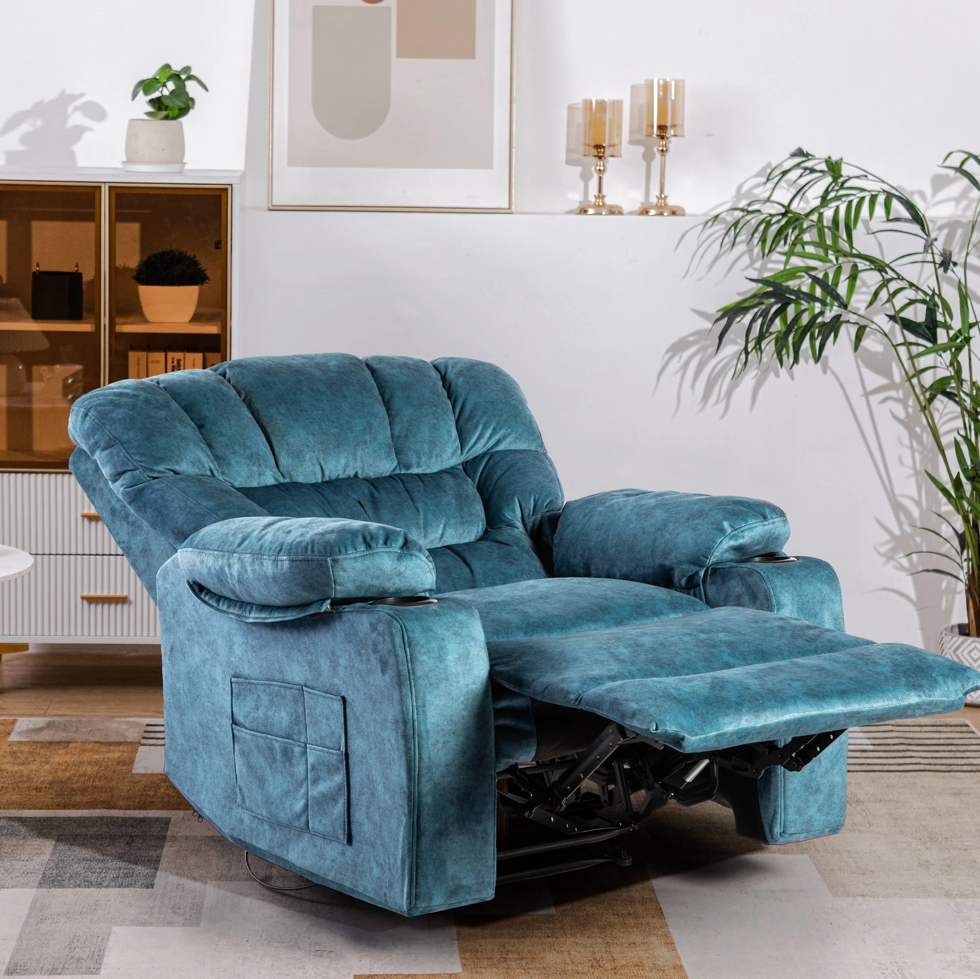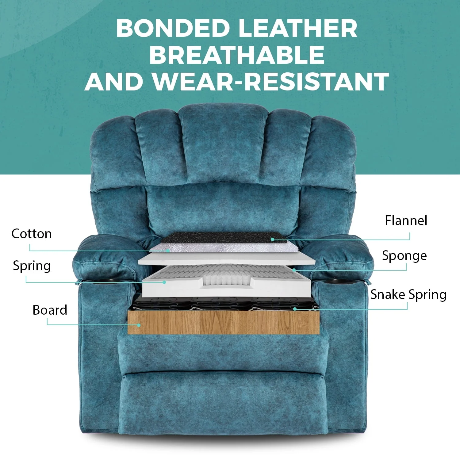 This COLERLINE 40.9" Wide Super Soft and Oversize Modern Design Velvet Upholstered Manual Recliner Chair with Heating and Massage uses breathable and high-quality velvet fabric for upholstery material, which is very easy to take care of and very comfortable to touch. With high-density foam and laminated veneer lumber (LVL) system to provide maximum comfort and stability, this manual recliner chair with two overstuffed pillows on the head and back in different using of reading book, watching TV, chatting and sleeping, provide extreme comfort for your neck, back, and lumbar. This oversize and overstuffed leather recliner is also a good choice for a big man. Featuring an oversized design, it widens seat, spacious back rest and powerful seat allow a capacity of 330 pounds at max. Smoothly reclining mechanism for a great lounging experience, a simple pull to a lever on the side gives a smooth, quiet, and effortless recline as you sit back and relax in style and ultimate comfort. Suitable for the living room, bedroom, and home theater room, clean lines set off a classic and luxurious style of decoration.