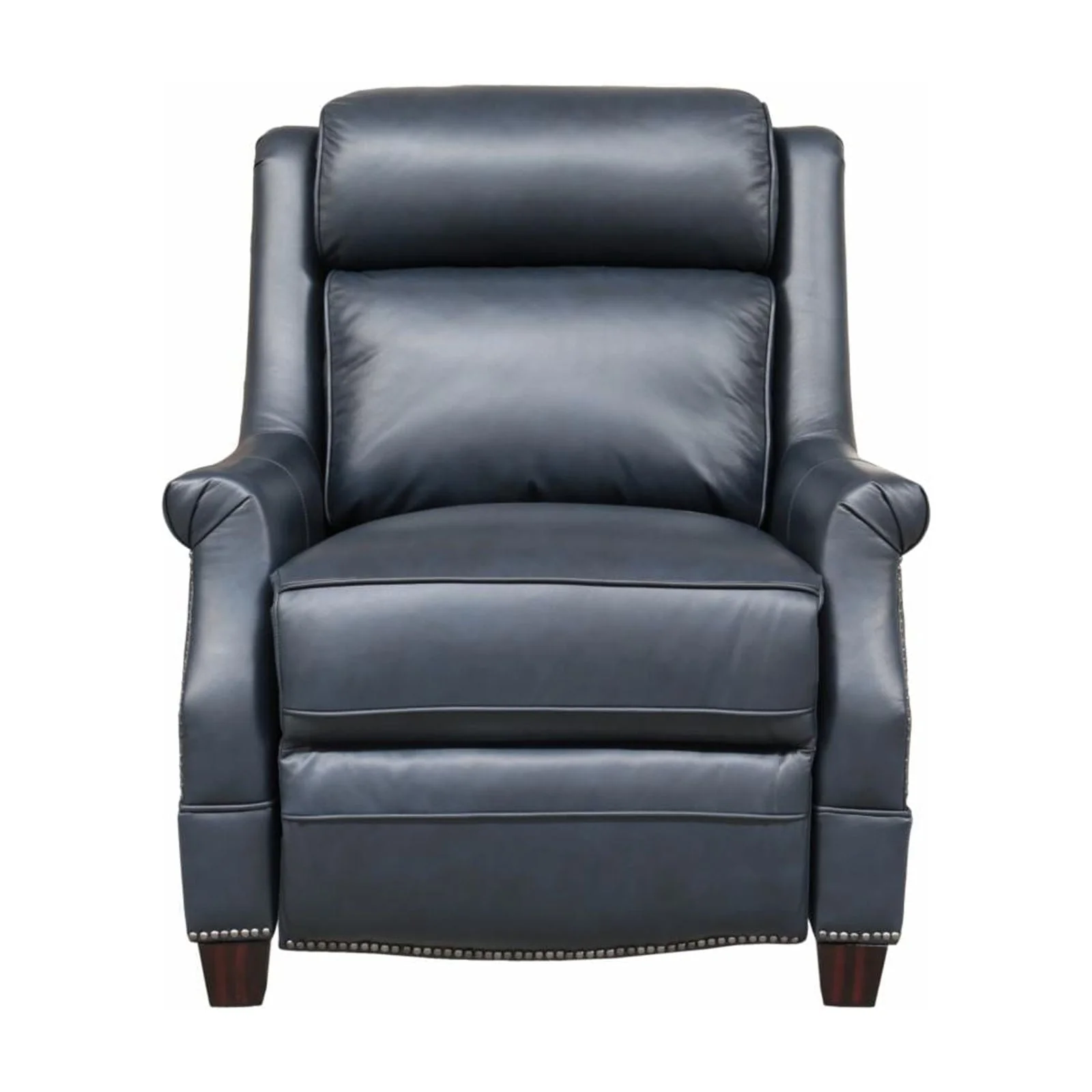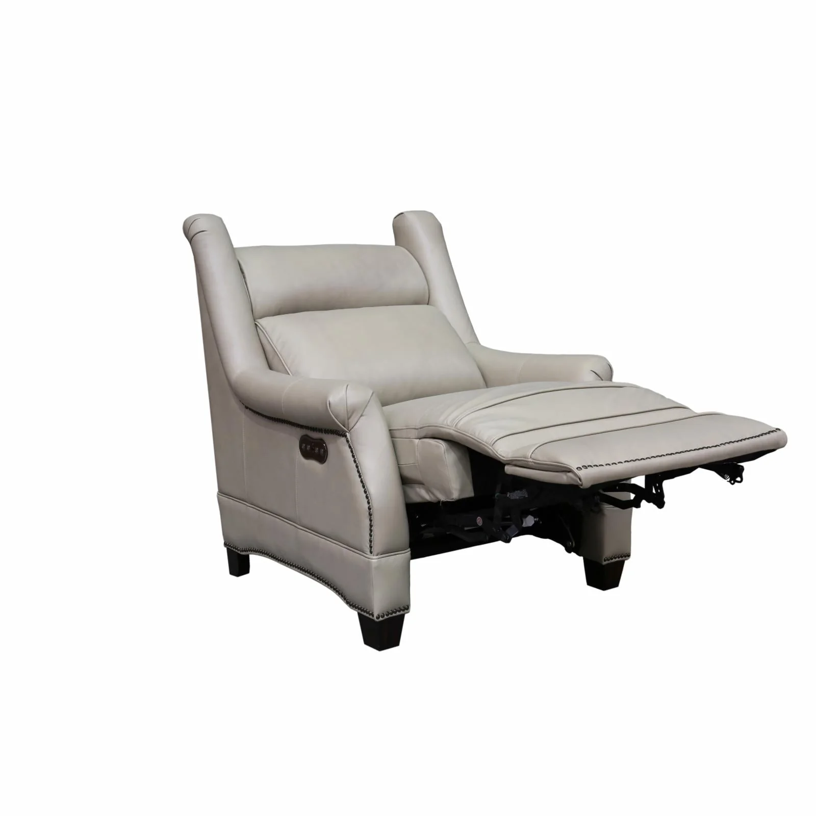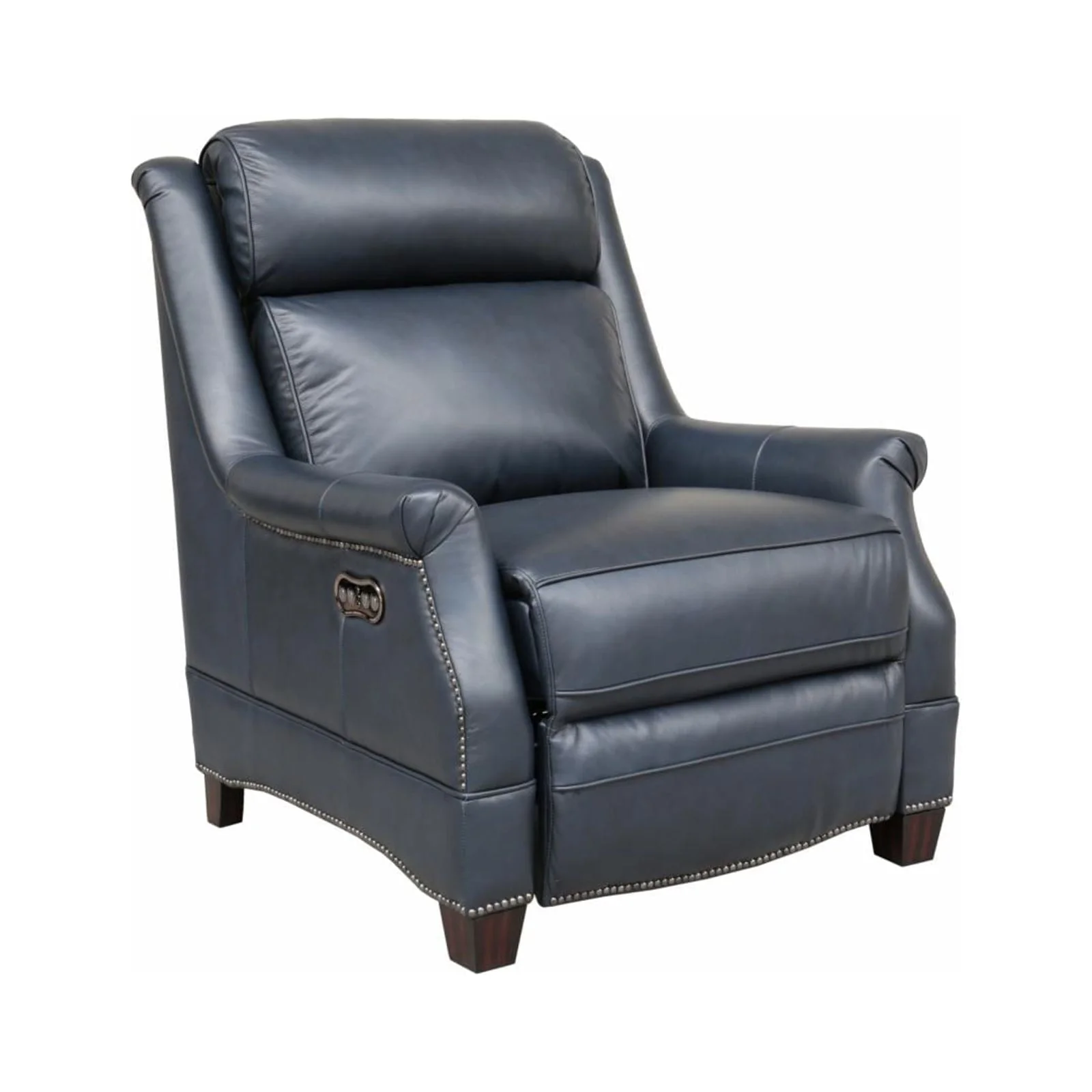 The Barcalounger Warrendale Leather Power Recliner is a traditionally styled smaller scale power recliner with articulated power head rest. it features a winged pub back design, pleated shaped arms, and box seat styled pad over chaise seating with pocketed coil springs encased in foam, wrapped in Dacron with down blend feather topper. Nail head trim accents the wings, arms, shaped bottom rail and foot board. Wood legs are in a reddish-brown merlot finish. Power button have USB port, memory button and auto close button