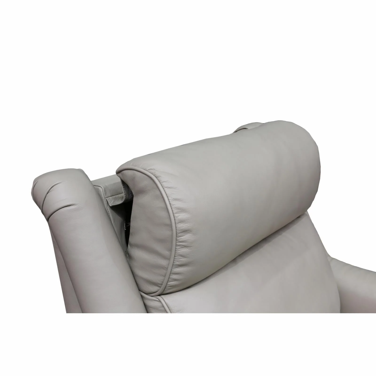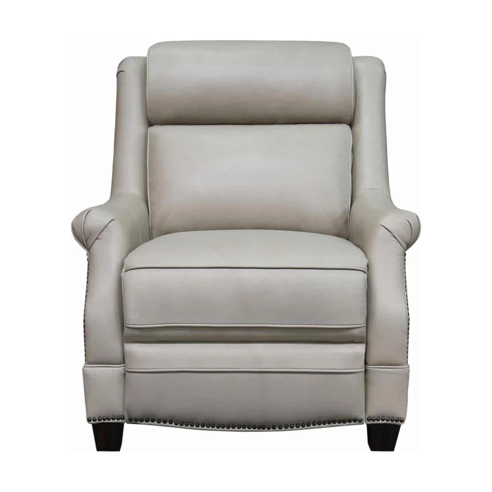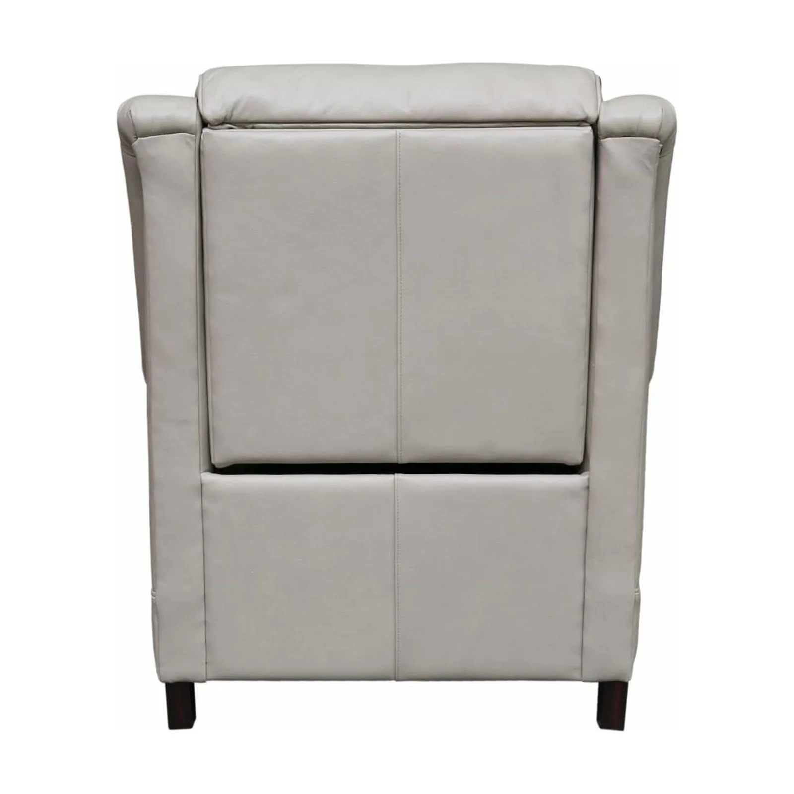 The Barcalounger Warrendale Leather Power Recliner is a traditionally styled smaller scale power recliner with articulated power head rest. it features a winged pub back design, pleated shaped arms, and box seat styled pad over chaise seating with pocketed coil springs encased in foam, wrapped in Dacron with down blend feather topper. Nail head trim accents the wings, arms, shaped bottom rail and foot board. Wood legs are in a reddish-brown merlot finish. Power button have USB port, memory button and auto close button