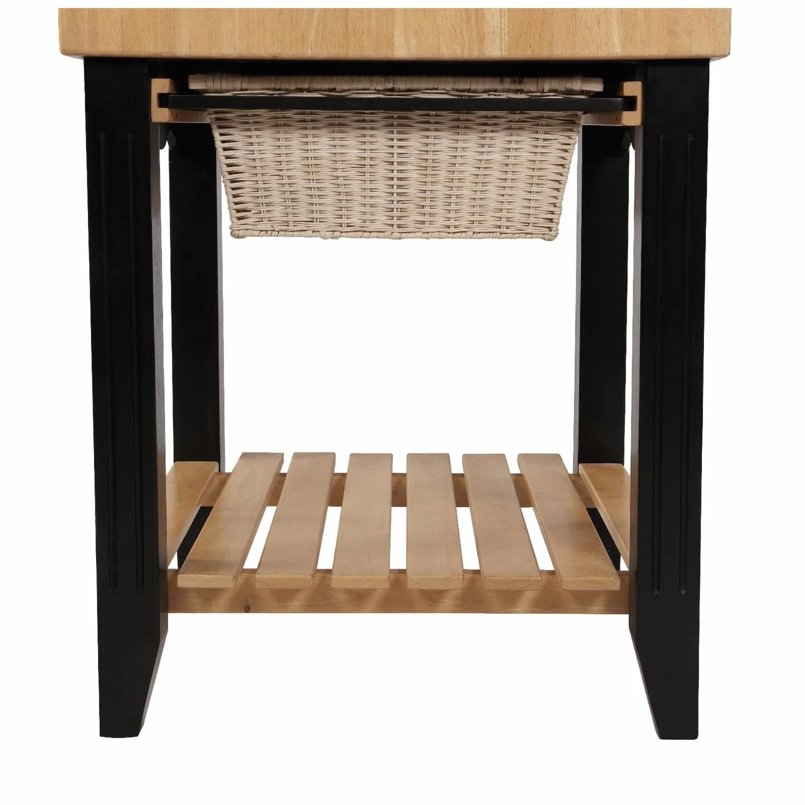 A Powell Kolton square kitchen island that is your kitchen storage and food preparation center essential for gourmet food preparation with butcher block top, 2 basket pull out drawers, slat easy access storage base shelf, 4 utensil hooks, and adjustable glides. Includes accessory kit containing spoon, spatula and tongs. Finished in Black. Some assembly required.