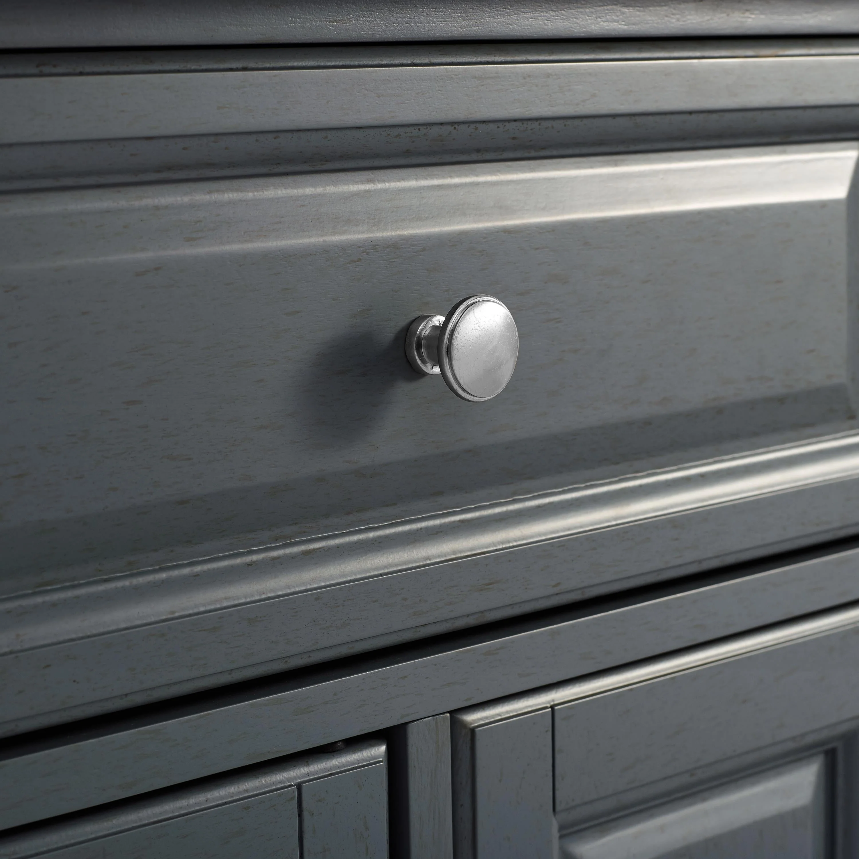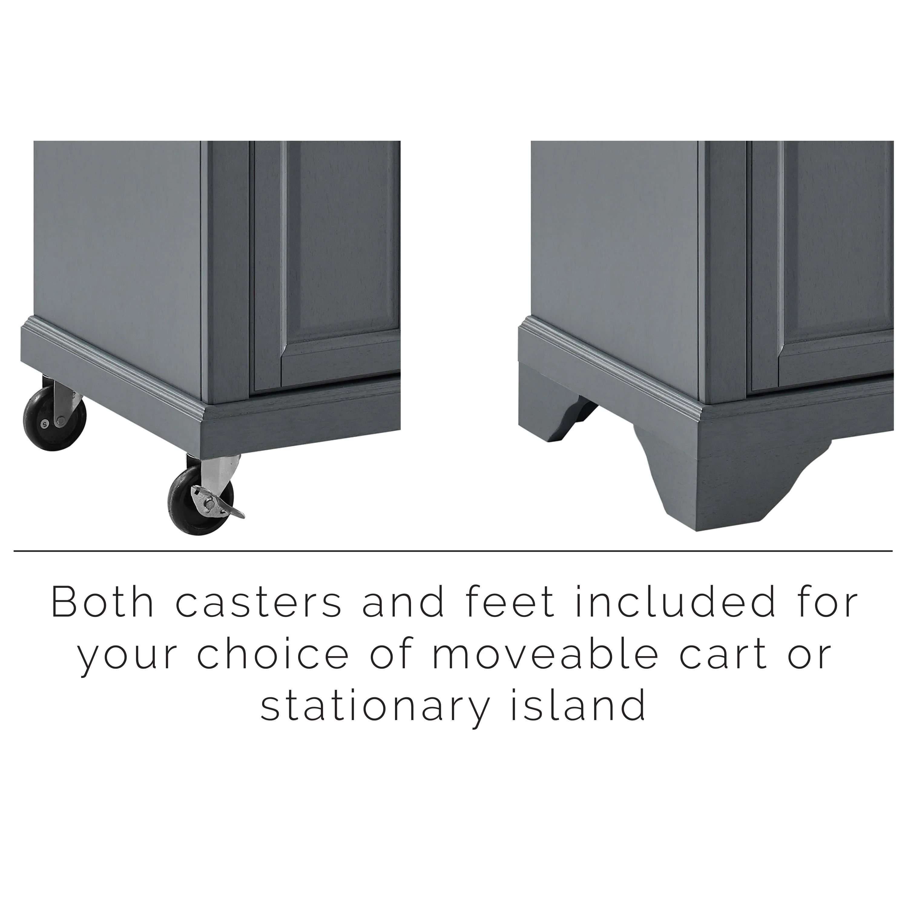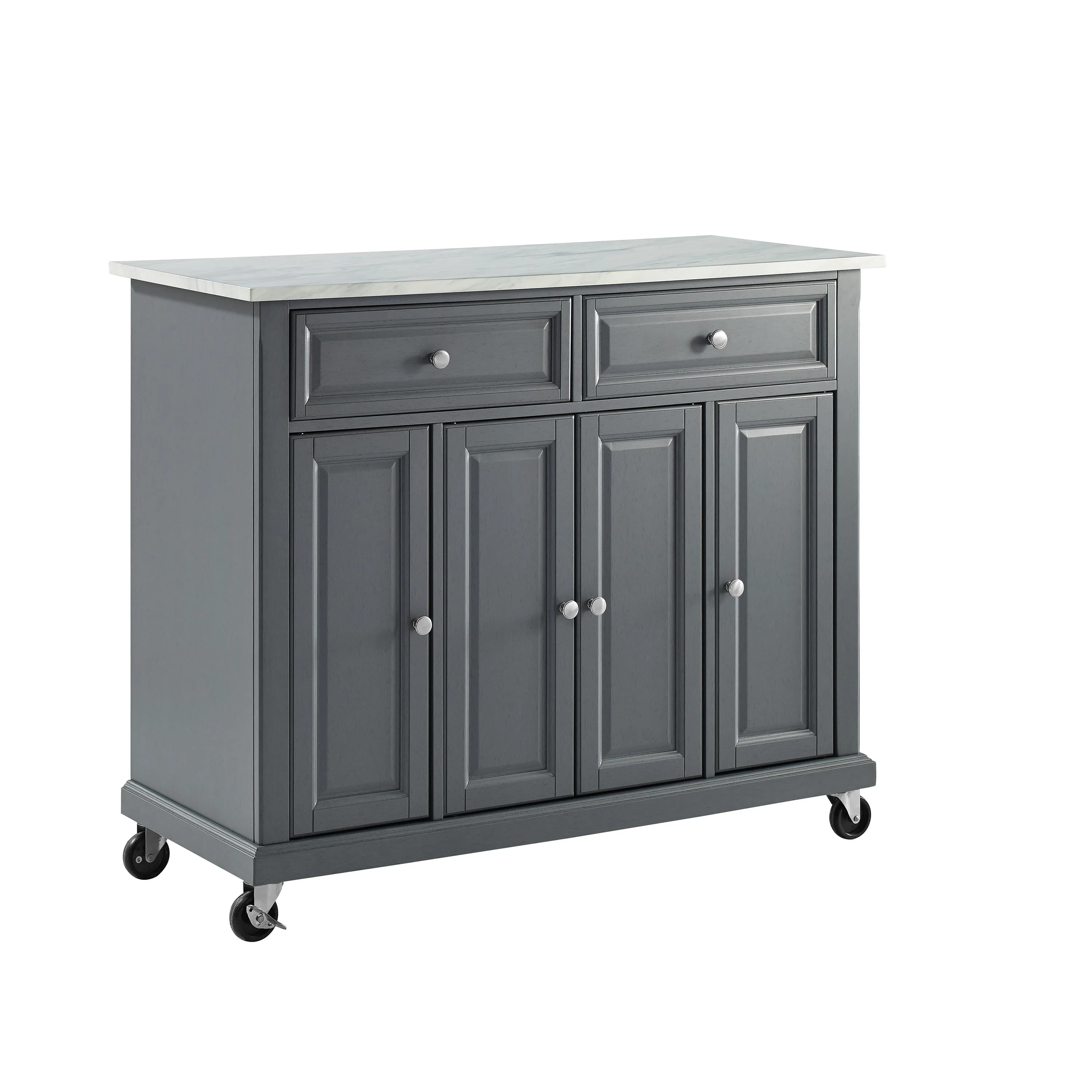 Increase the functionality of your kitchen with the Avery Kitchen Cart/Island. This traditional style packs a storage punch with two large drawers and three cabinets, perfect for tucking away servingware and seasonal items. The solid top features a paper marble finish for a rich yet cost-effective aesthetic. Crafted from solid hardwood and birch veneers, it?s a sturdy addition. Brushed nickel hardware completes the monochrome look. Both casters and classic feet are provided for your choice of stationary island or rolling cart.