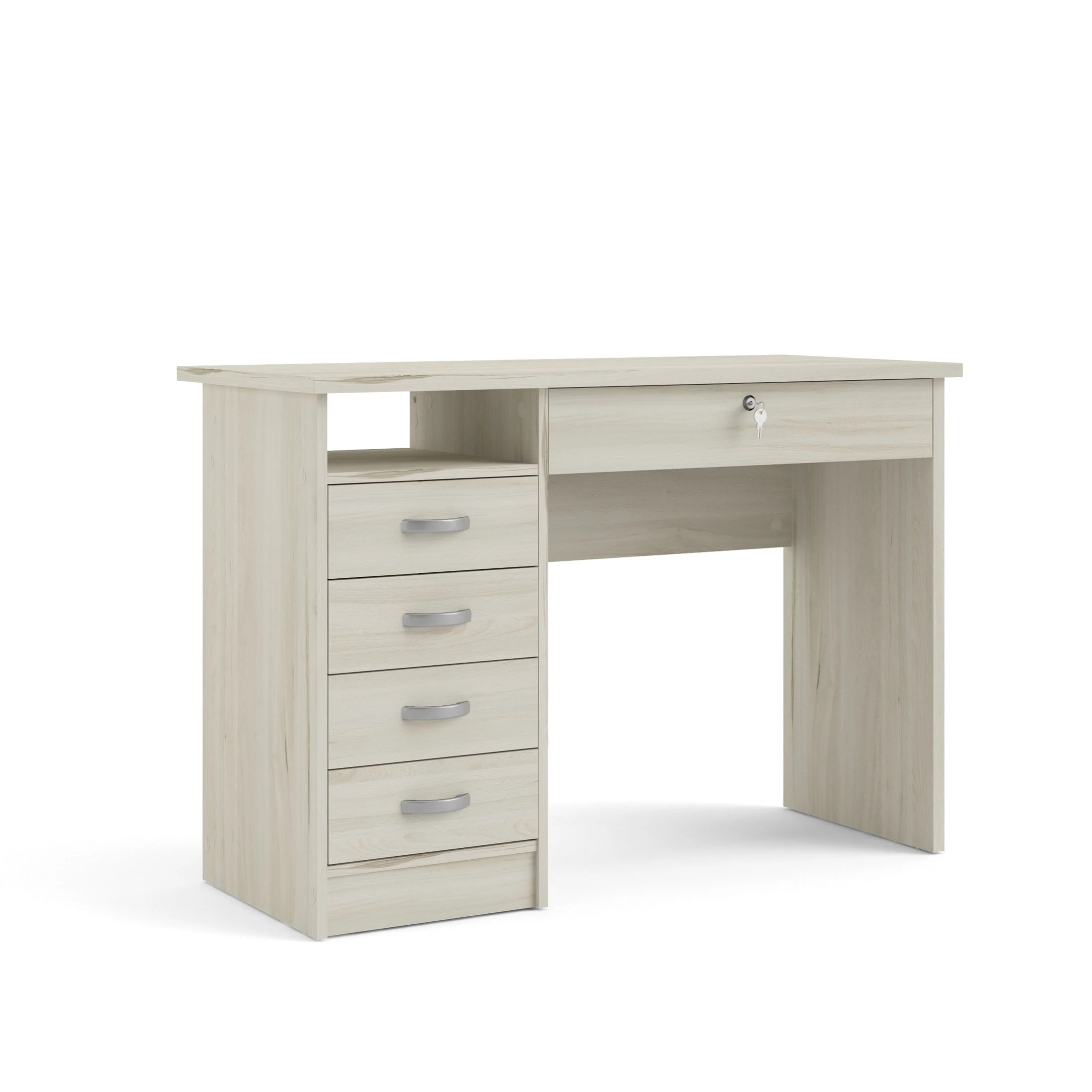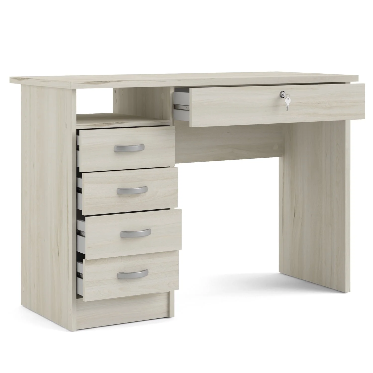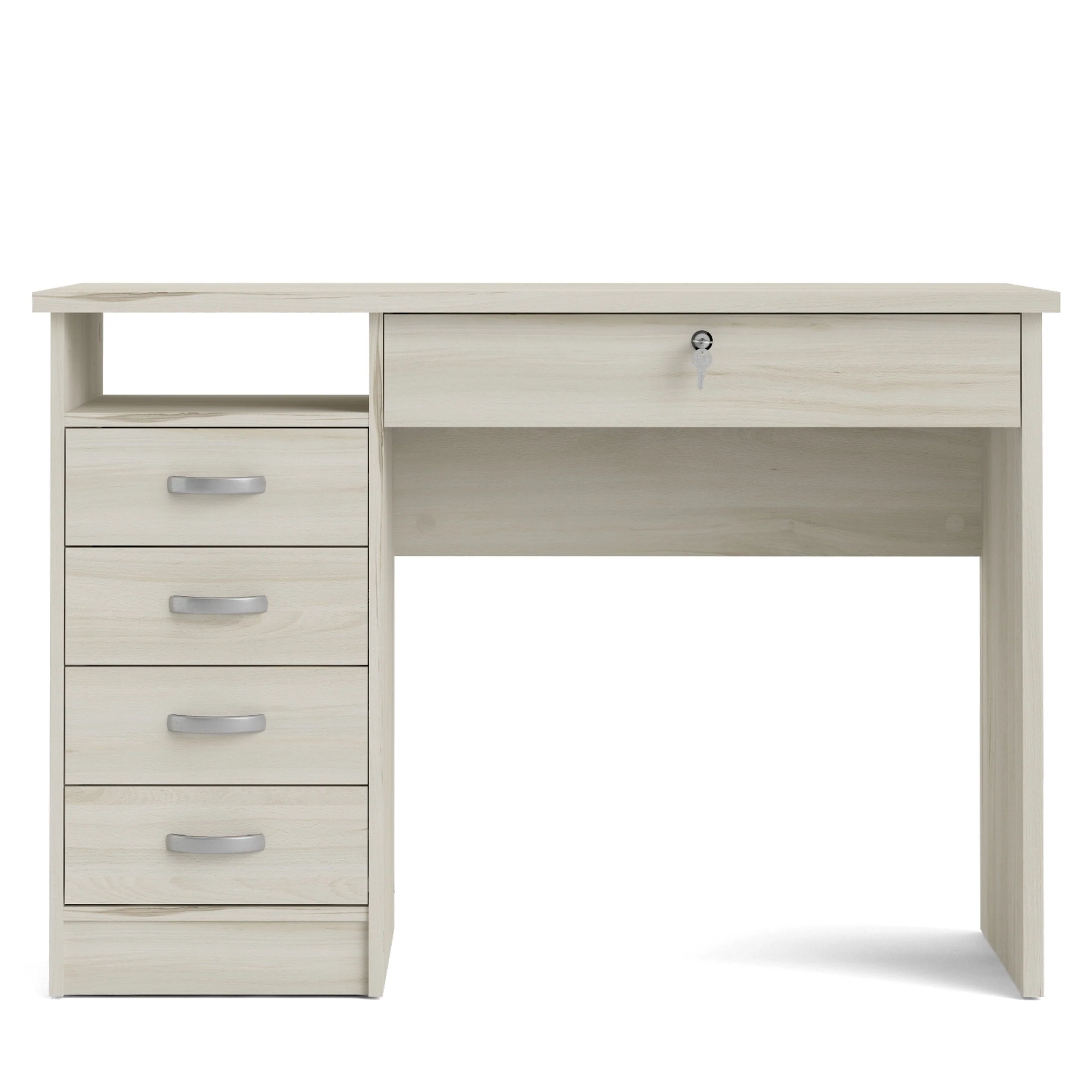 Office minimalist meets sophistication with the Walden Desk with 5 Drawers. This desk provides one open shelf for easily accessible items and the five drawers provide plenty of storage to assist with office clutter. The large drawer that sits directly under the desktop is lockable and provides storage for your keyboard, office supplies or important documents you want to keep locked up but within grasp. The drawers are backed with metal glides complemented with curved handles and the desk has a foil finish that provides durability and protects against stains, smears, and fading