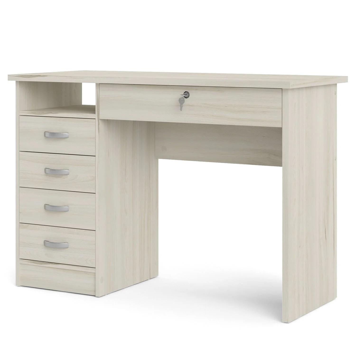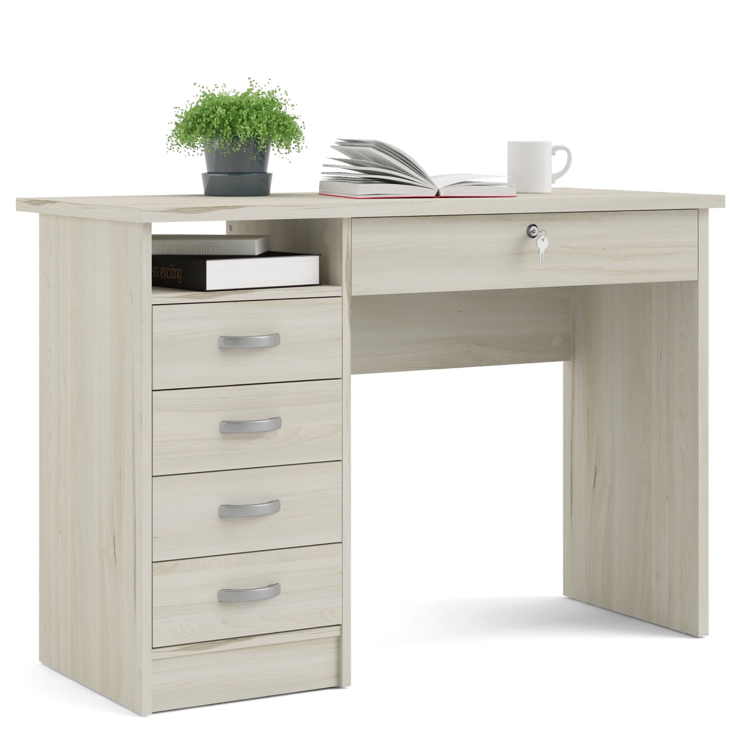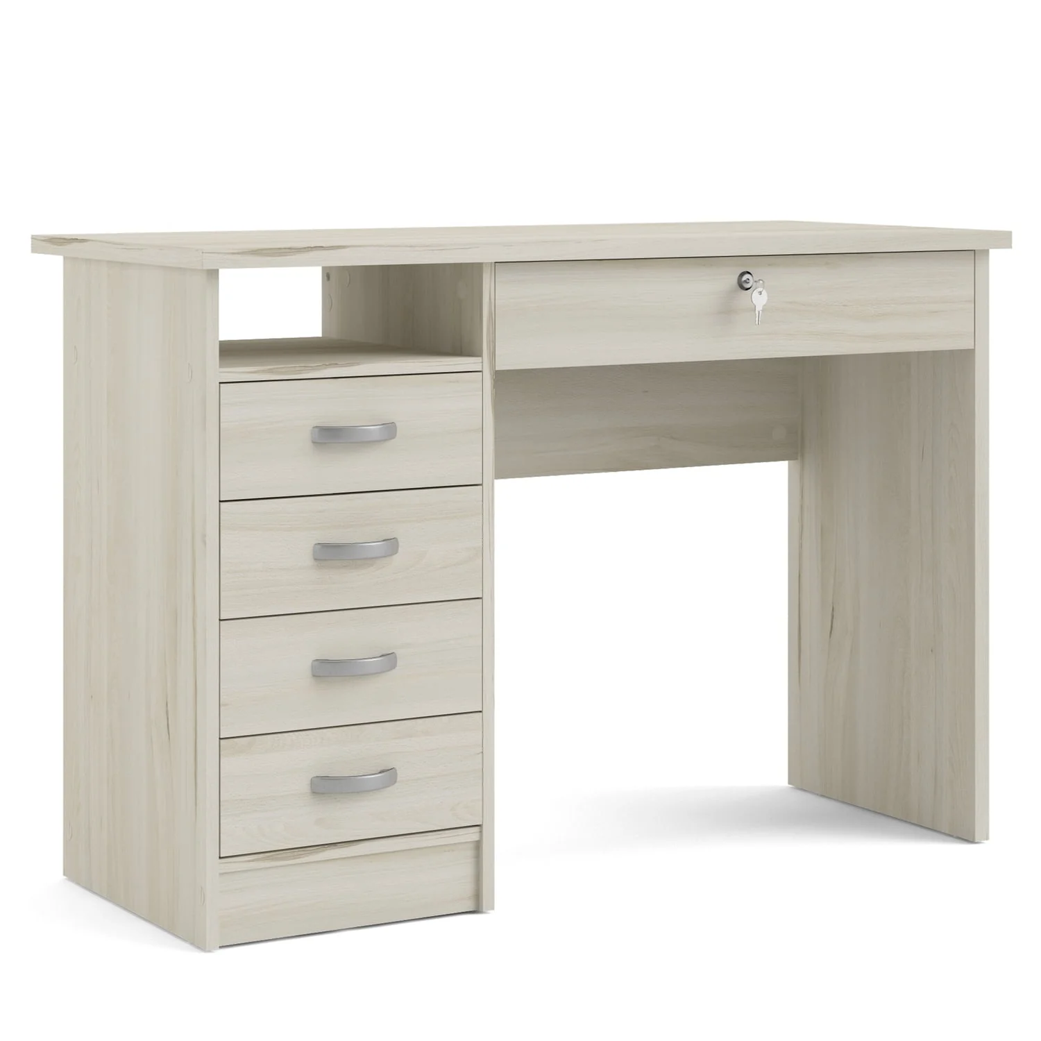 Office minimalist meets sophistication with the Walden Desk with 5 Drawers. This desk provides one open shelf for easily accessible items and the five drawers provide plenty of storage to assist with office clutter. The large drawer that sits directly under the desktop is lockable and provides storage for your keyboard, office supplies or important documents you want to keep locked up but within grasp. The drawers are backed with metal glides complemented with curved handles and the desk has a foil finish that provides durability and protects against stains, smears, and fading